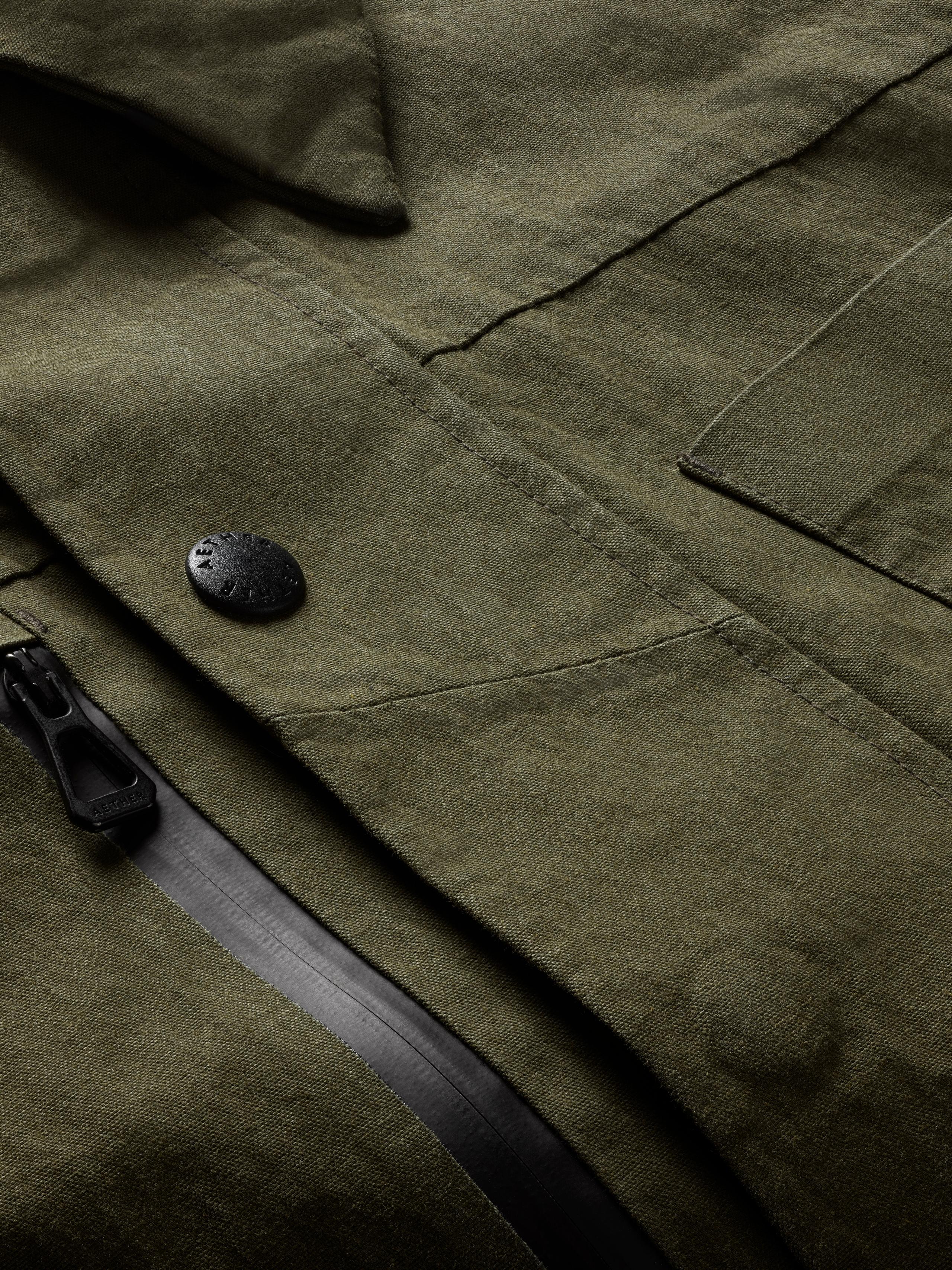 Weather-resistant, waxed cotton-nylon blend fabric adjusts to ambient temperatures, becoming softer and more breathable in warm weather and creating a windproof barrier in colder conditions.