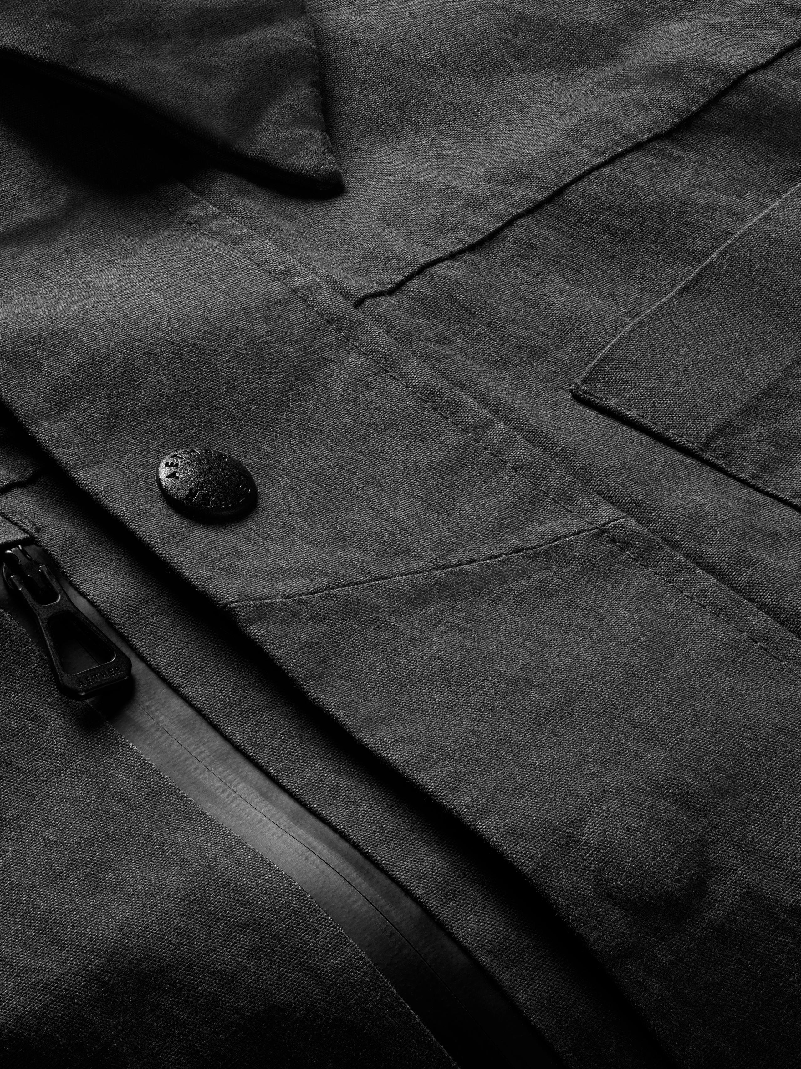 Weather-resistant, waxed cotton-nylon blend fabric adjusts to ambient temperatures, becoming softer and more breathable in warm weather and creating a windproof barrier in colder conditions.