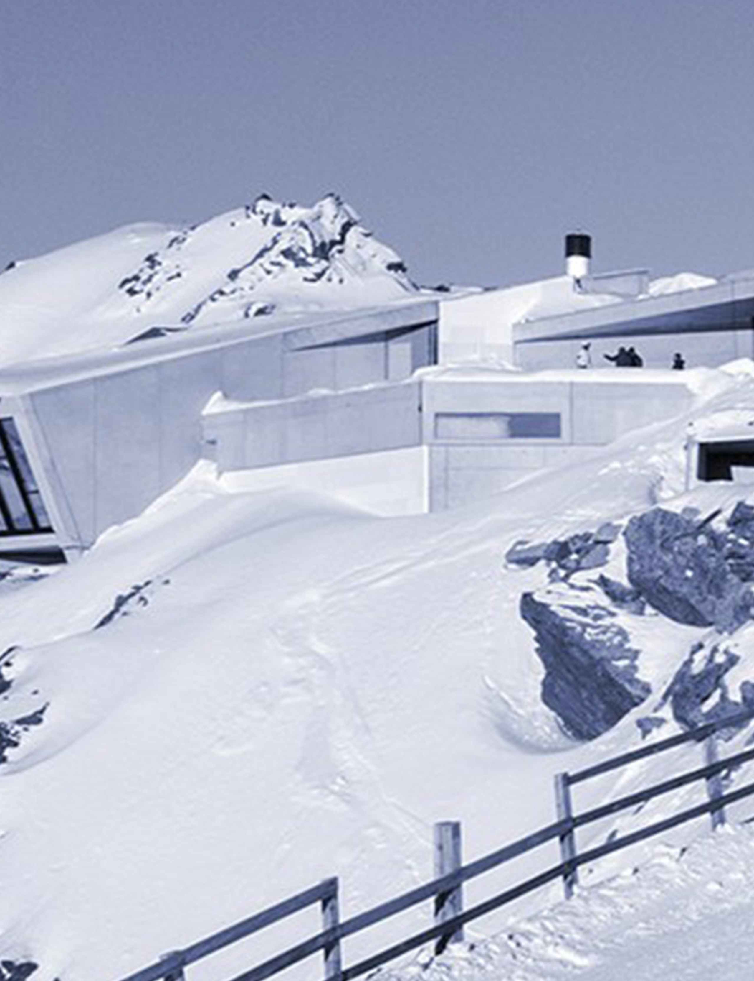 Designed by Austrian architect Johann Obermoser and Neal Callow, the London-based art director for the Daniel Craig-era Bond films, 007 Elements is a partnership between EON Productions, MGM, and cable-car company Bergbahnen Sölden. The museum is located at 10,000 feet, atop Gaislachkogl Mountain, reachable only by cable car. Constructed from concrete, the building features floor-to-ceiling windows offering a panoramic view of the Ötztal Alps and the Tyrolean valleys.