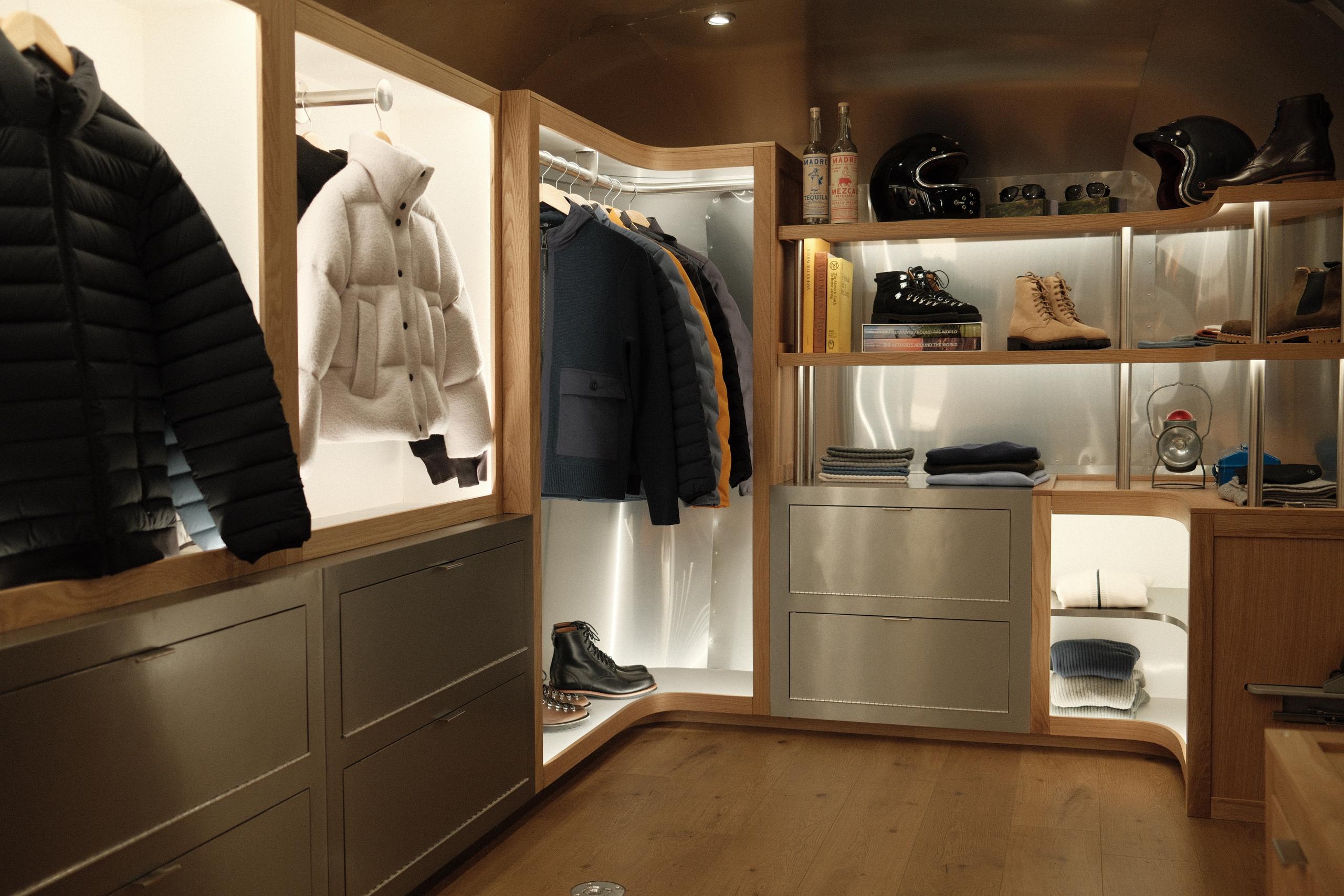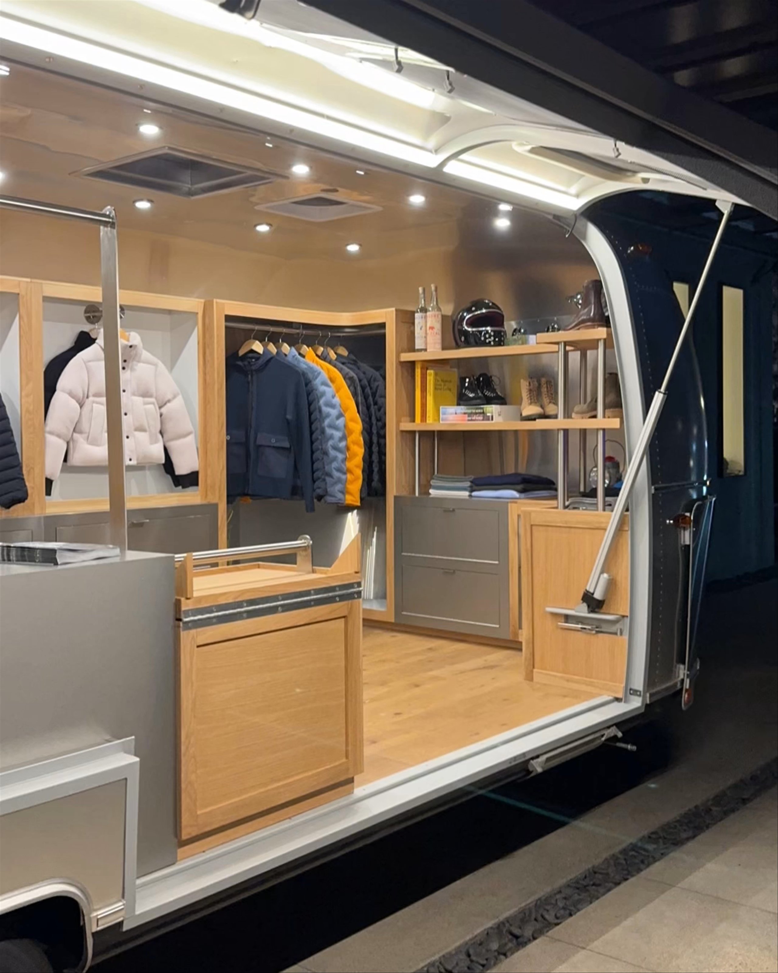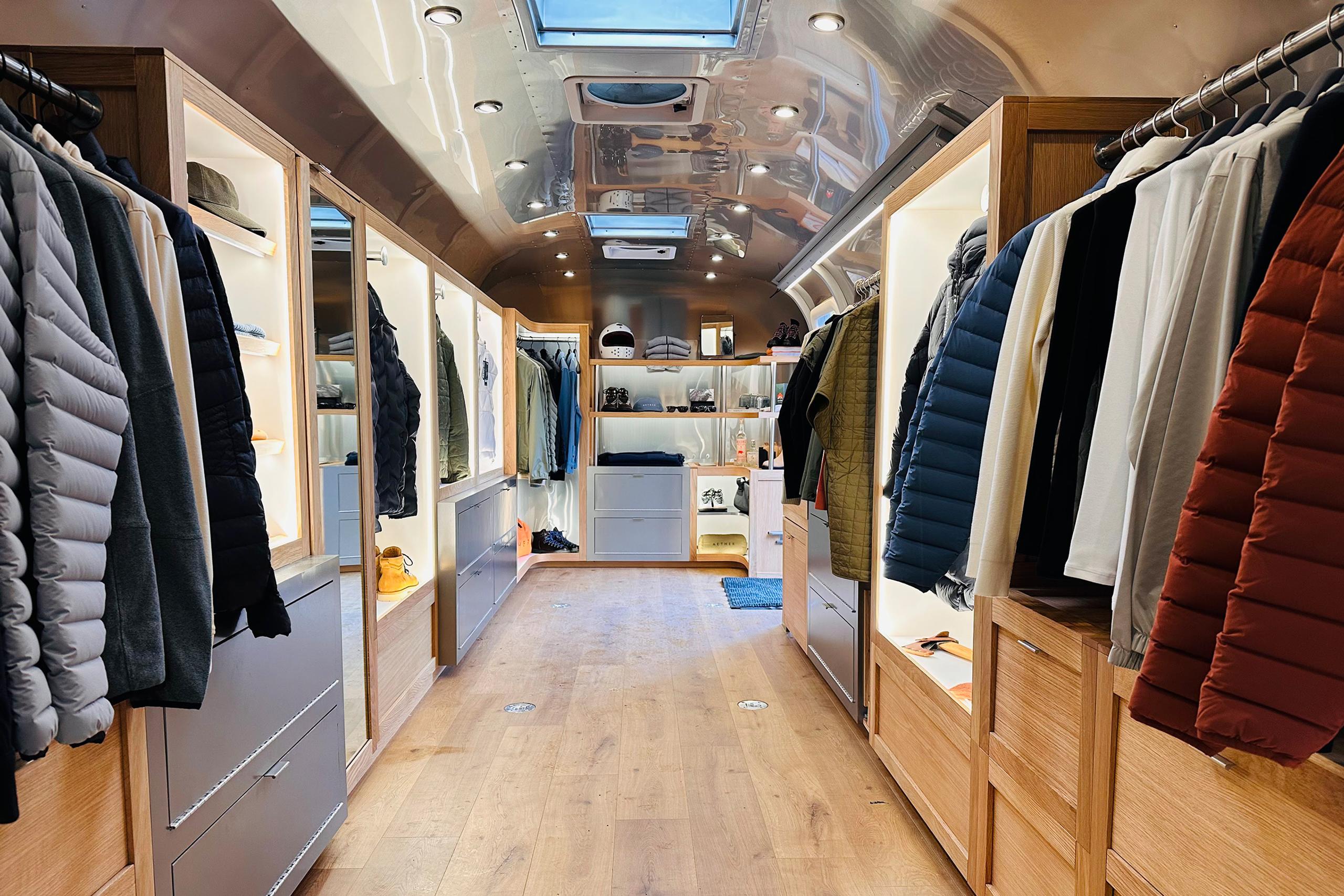 With the shell and exterior squared away, the team moved on to transforming the trailer’s interior into a bespoke mobile retail space. Constructed with a major focus on quality, durability, and weight efficiency, the interior was treated to a combination of oak veneer and hardwood that perfectly balances strength and lightness. Inside, the trailer also got custom stainless steel fixtures and hang bars reflecting the industrial, modern elements found in AETHER’s stores, along with LED lighting throughout to ensure clean, even illumination of all of the displays. Every component was also custom designed to complement the form of the Airstream while still maintaining AETHER’s signature aesthetic and staying true to its established brand identity.