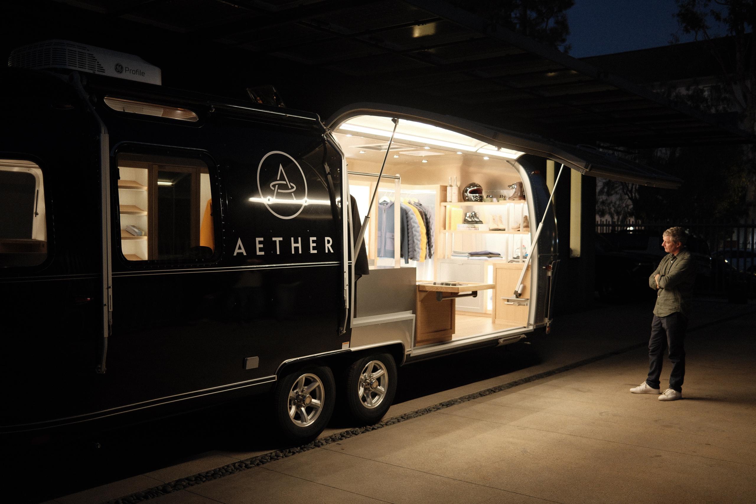 In 2011 — two years before opening our first brick and mortar store — AETHER partnered with Paris-based designer Thierry Gaugain to create the ultimate shop on wheels in the form of a custom-converted, 34-foot Airstream PanAmerica. Dubbed the AETHERstream, the trailer featured a completely bespoke interior with custom shelving, hang bars, a suspended wood-burning stove, and various fixtures, accessories, and pieces of furniture sourced from the Paris flea market. This bespoke build served as a roving pop-up shop, crisscrossing the country and making stops in everything from major U.S. cities to small mountain towns.
