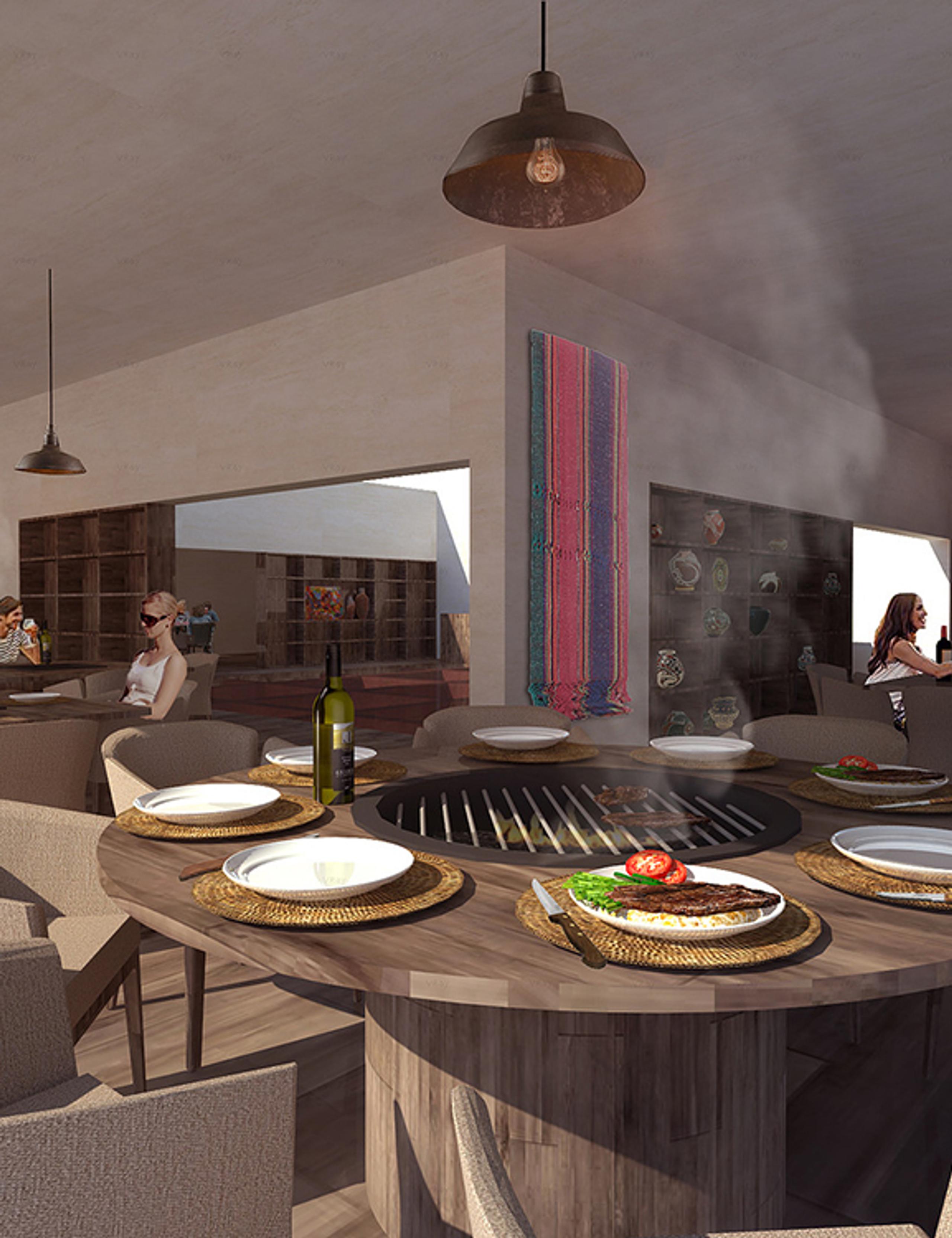 The front of Biré Bitori is an imposing stone facade, concealing the mountains and vast canyon beyond its concrete walls. To enter, guests either descend a set of stairs leading to the main dining area or walk through an opening in the walls to the mezzanine level which boasts views of Copper Canyon and the famed Basaseachic Falls from above. The open-air upper level allows visitors to peer into the restaurant and all the way through the glass floor to the canyon 6,000 feet below.