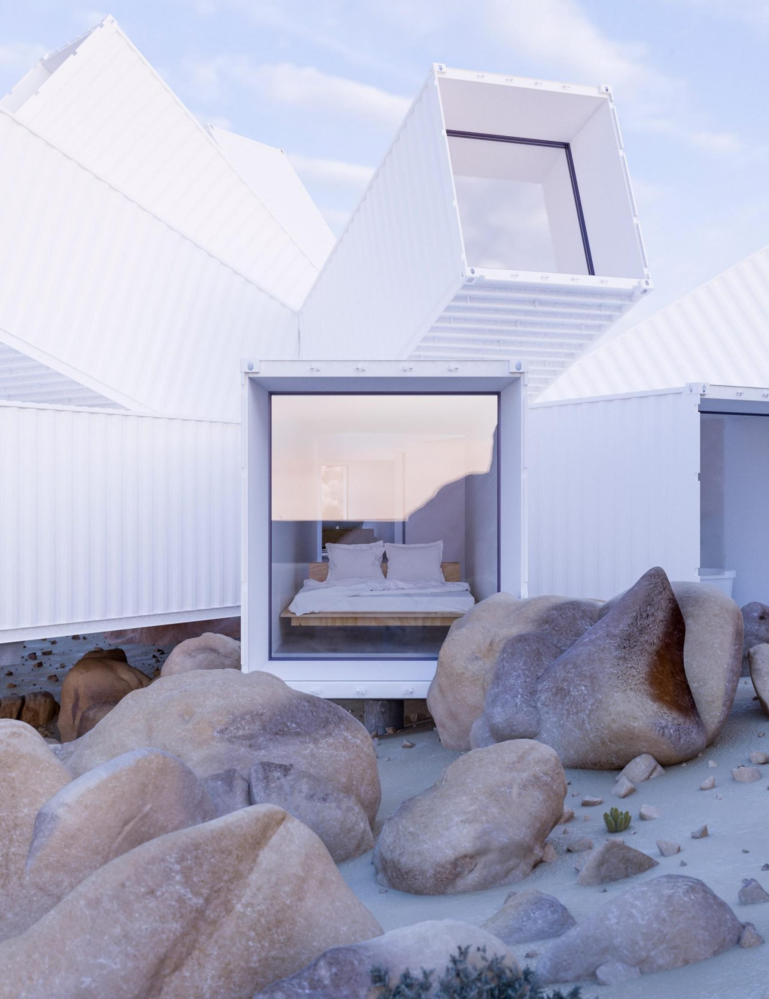 Since 2013 when we opened our first standalone store in San Francisco, constructed of three shipping containers stacked on top of each other, we’ve seen the innovative architecture trend grow exponentially. The latest iteration that has us intrigued is the Joshua Tree Residence, by architect James Whitaker. This project exists as only a rendering for now, but construction is set to begin next year. Designed as a commission for an LA-based film producer and his wife who own a 90-acre property in the desert near Joshua Tree, the shipping-container home was inspired by one of Whitaker’s previous designs that was never actually built.