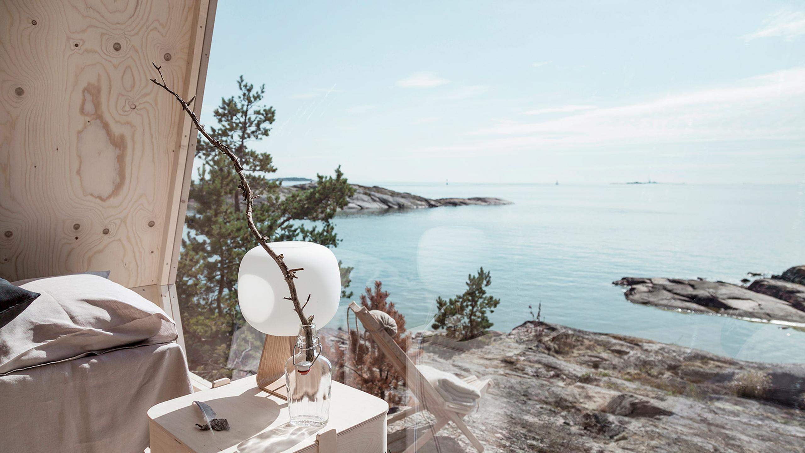 One end of the cabin is all glass, allowing for natural light throughout the space and providing visitors a stunning ocean view. Committed to as small of a carbon footprint as possible, the cabin only feature textiles made of natural materials such as linen, jute, and bamboo. It functions entirely on renewable energy generated by solar panels on one side of the roof, while mirrors on the other side deflect the sun so the interior doesn’t get too hot. Additionally, the stove runs on renewable diesel, and guests are asked to use the provided canvas grocery bags and reusable water containers if they decide to venture into town. There is, however, no running water in the cabin: The Nolla is located a quarter-mile walk from composting toilets and a half-mile walk away from fresh water at the Vallisaari guest port. ↓