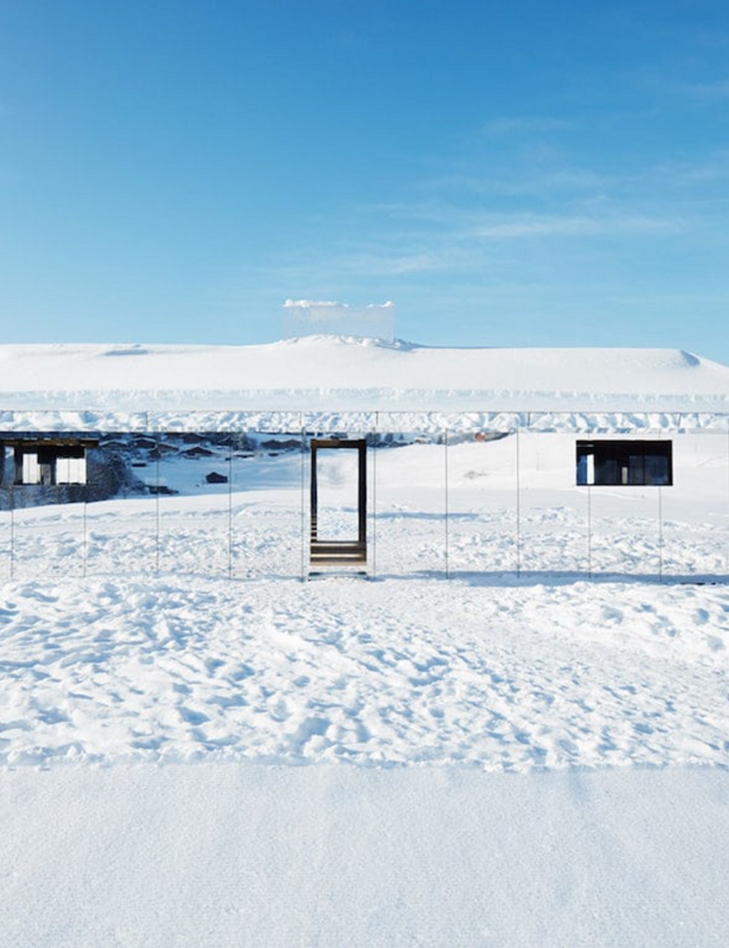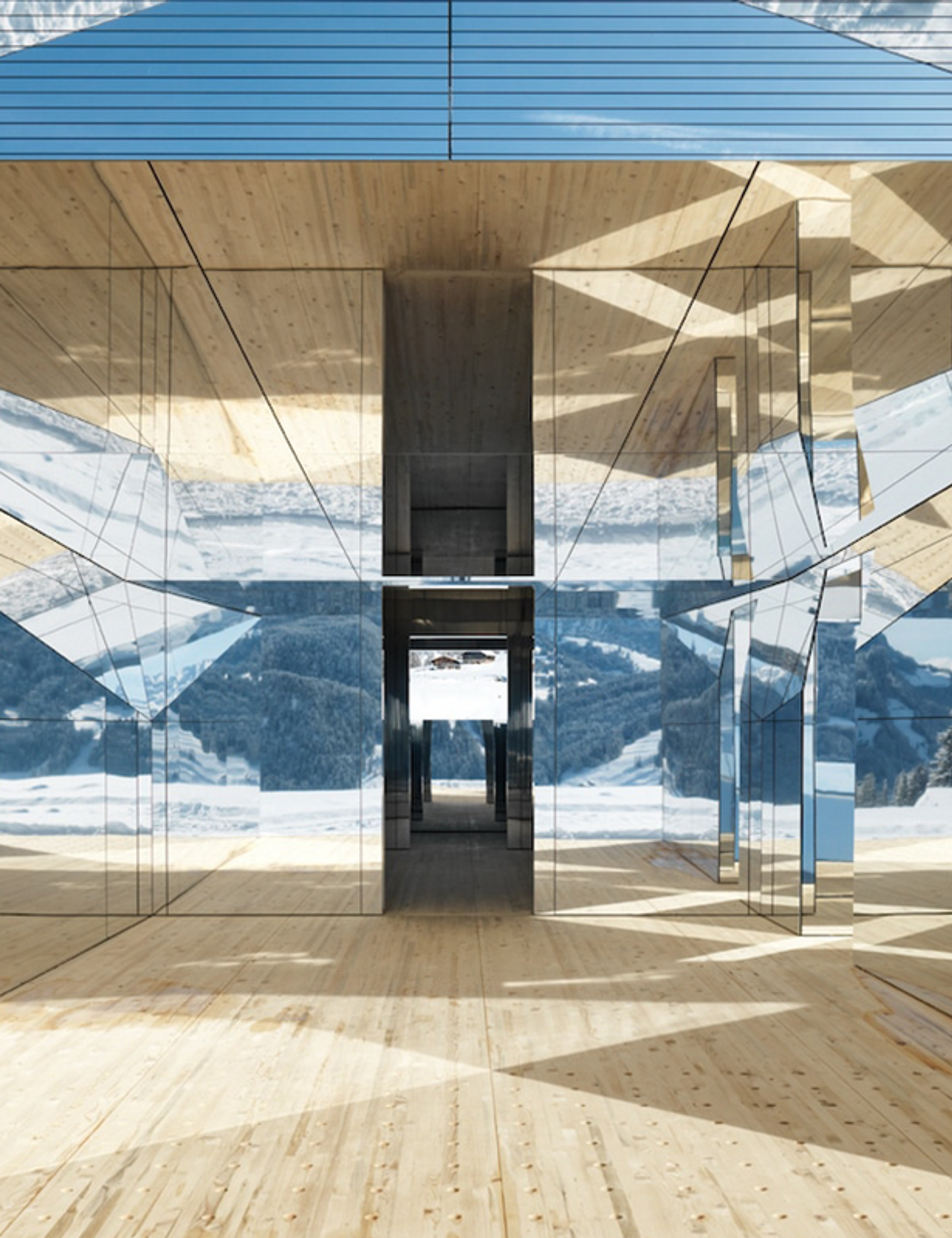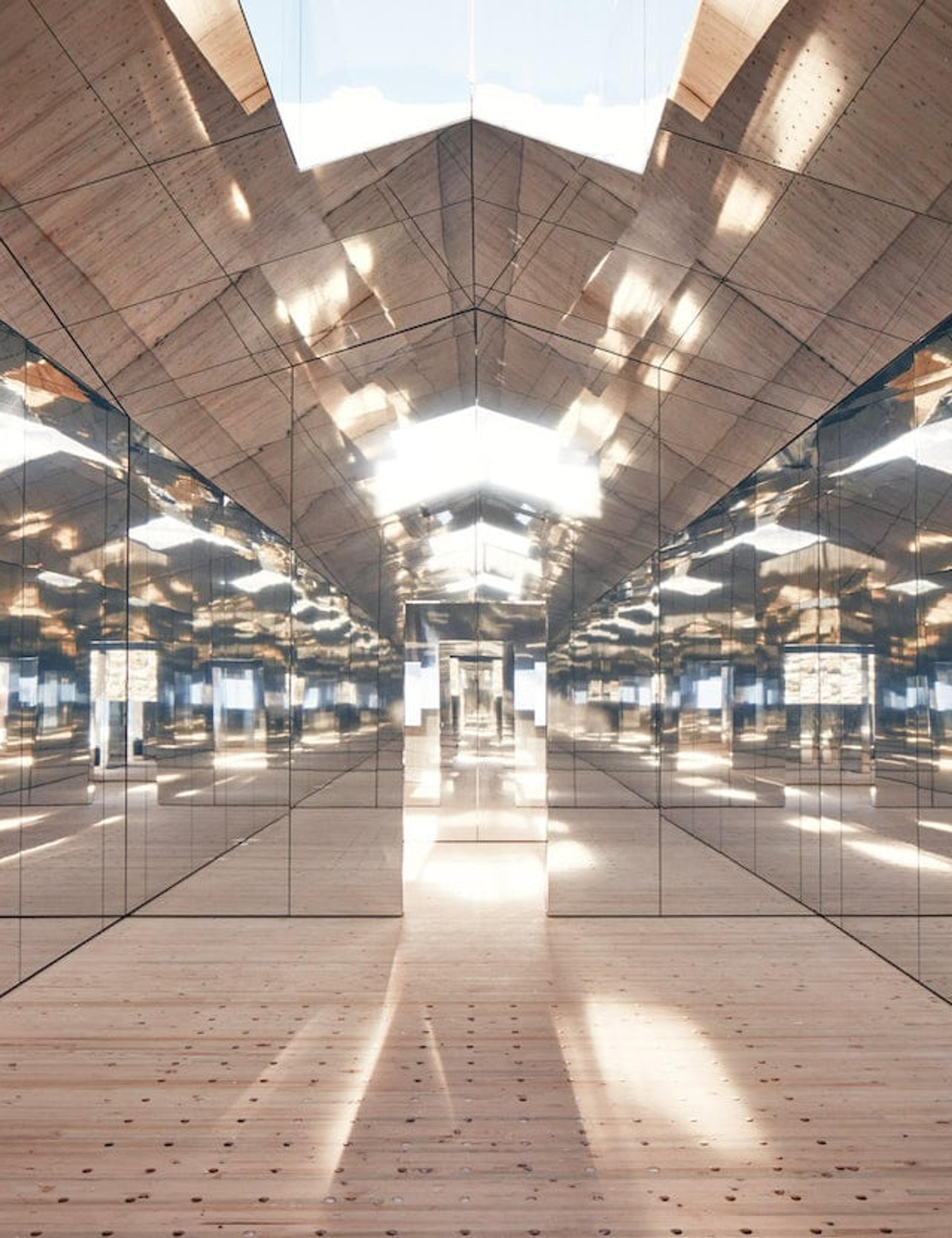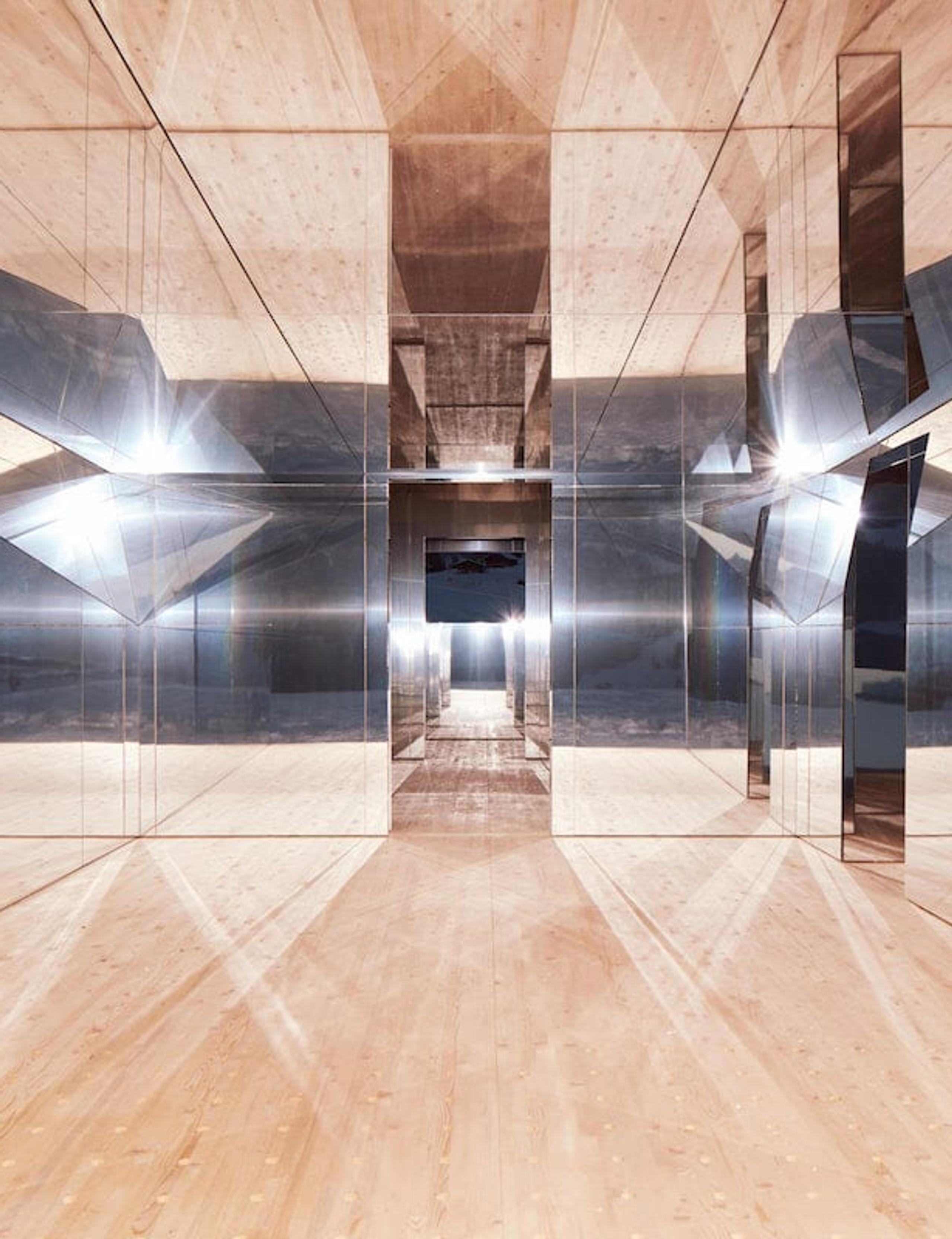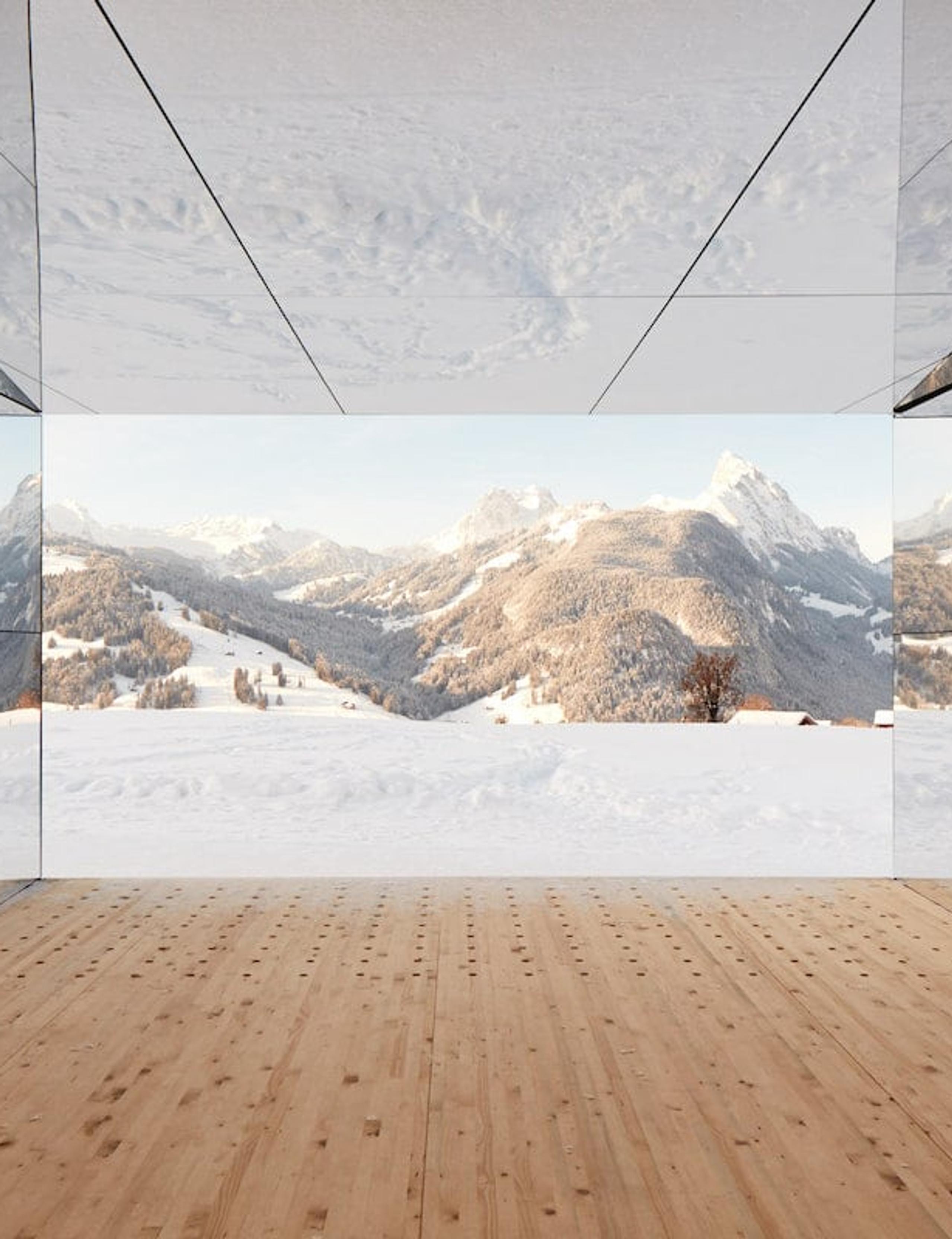 Mirage has now found a home in Europe, where it will remain for the next two years. Currently located in Videmanette in Gstaad, Switzerland, the mirror-covered structure seamlessly disappears into its snowy forest surroundings, while reflecting the rugged terrain of the Swiss Alps. Visitors can enter the building to find an interior also covered in mirrors, with the walls and ceiling reflecting light off each other, creating a kaleidoscopic effect. Here, some photos of the Mirage Gstaad.
