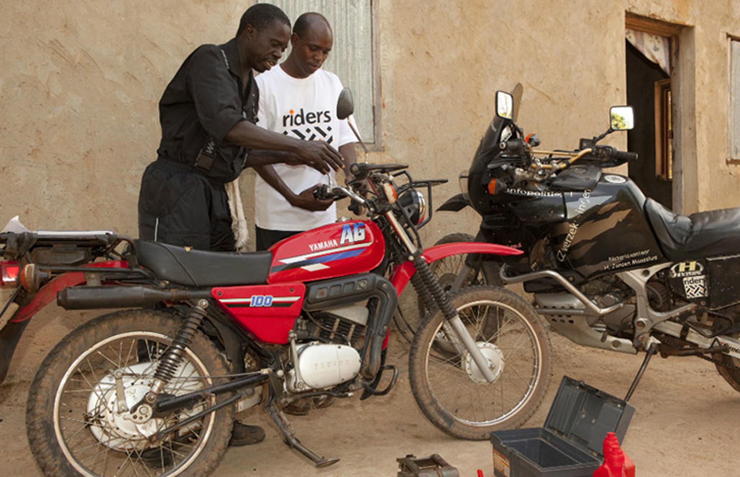 More than 60 percent of the population of sub-Saharan Africa lives in rural, hard-to-reach areas, and the roads in most of these communities are—at best—small, dirt tracks. Cars are often too large to navigate these roads, and bicycle transport between villages can be strenuous and ineffective. In the late 1980s, UK-based motorcycle enthusiasts Barry and Andrea Coleman were stunned to find out how many African people were dying as a result of not having access to the health care they needed, inspiring them to create Riders for Health.