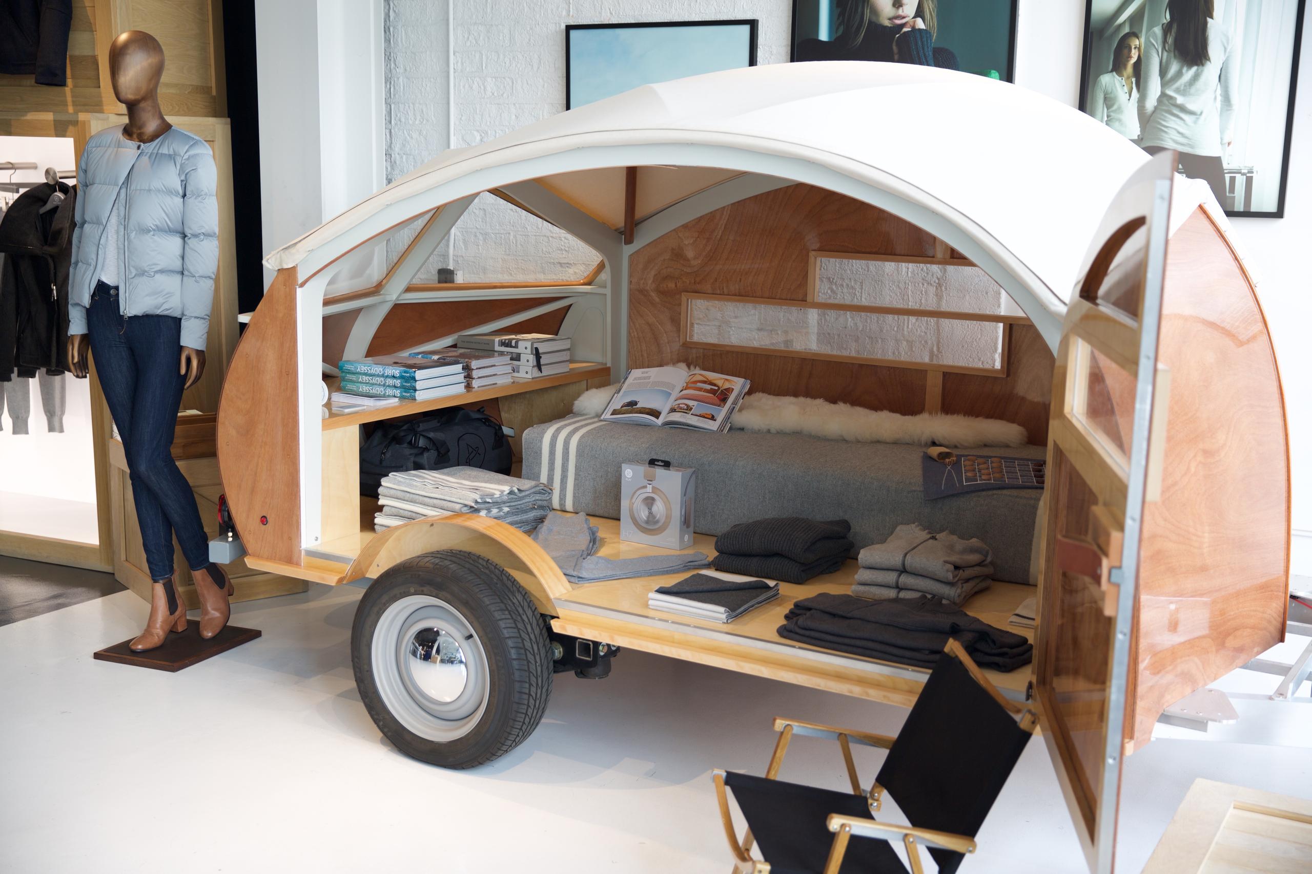 We're all for inspiring design here at AETHER, and that extends beyond clothes, which is why we recently pulled the Hutte Hut into our LA flagship. Produced by Sprouting Sprocket Studio in Carpinteria, California, the Hutte Hut is a modern interpretation of a teardrop trailer constructed from the finest materials. First exhibited at Dwell on Design in 2014 (where it won Best in Dwell Outdoors), the Hutte Hut is 14-feet long and made to order with marine-grade plywood, birch flooring, and a water-repellant cotton canvas canopy atop an aerospace aluminum frame. Large double doors allow you to take in the views and fresh air during the day and keep you cozy when closed at night. The 44-square-foot interior space boasts enough space to fit two adults (and even a dog) comfortably. You can order your own Hutte Hut, but be prepared to spend: They start at $63,900. Oceanfront views not included.