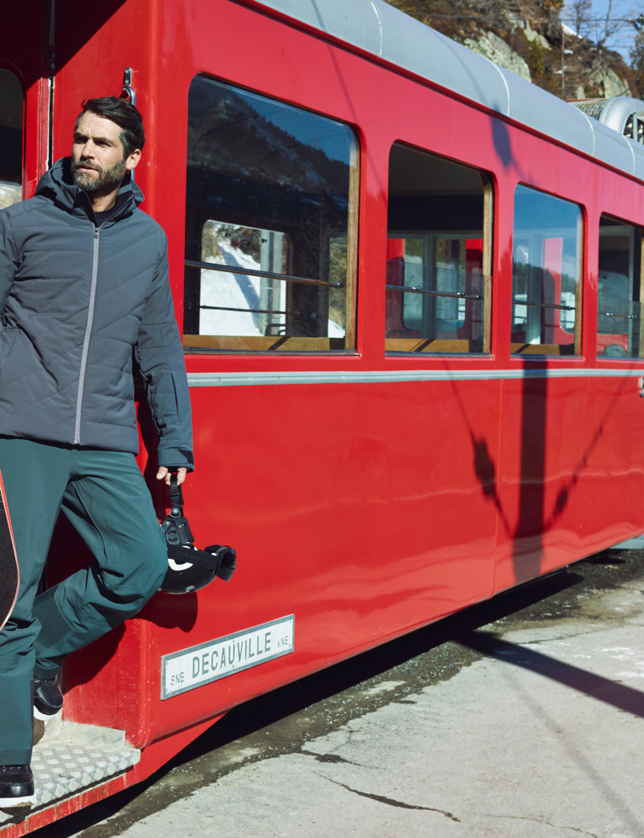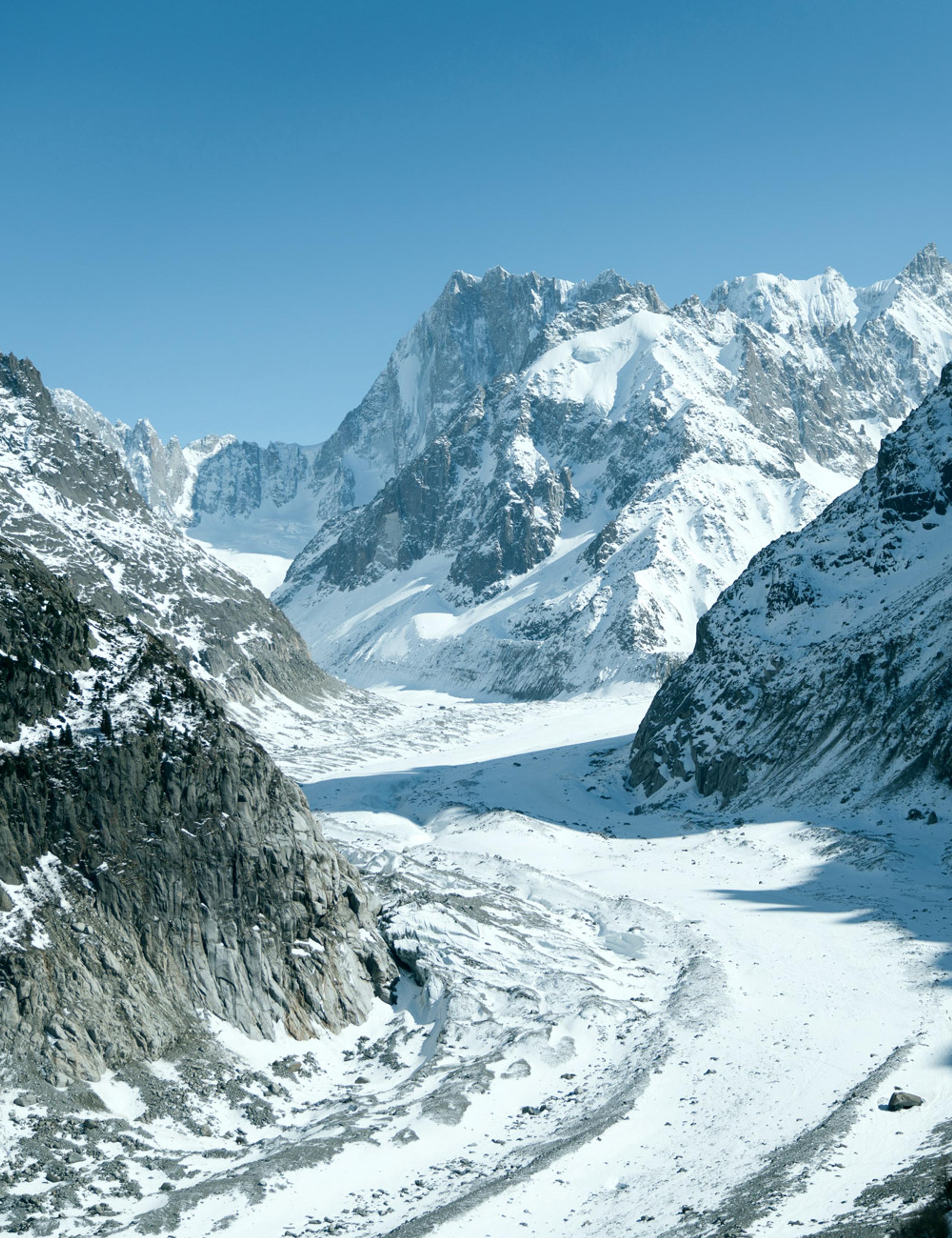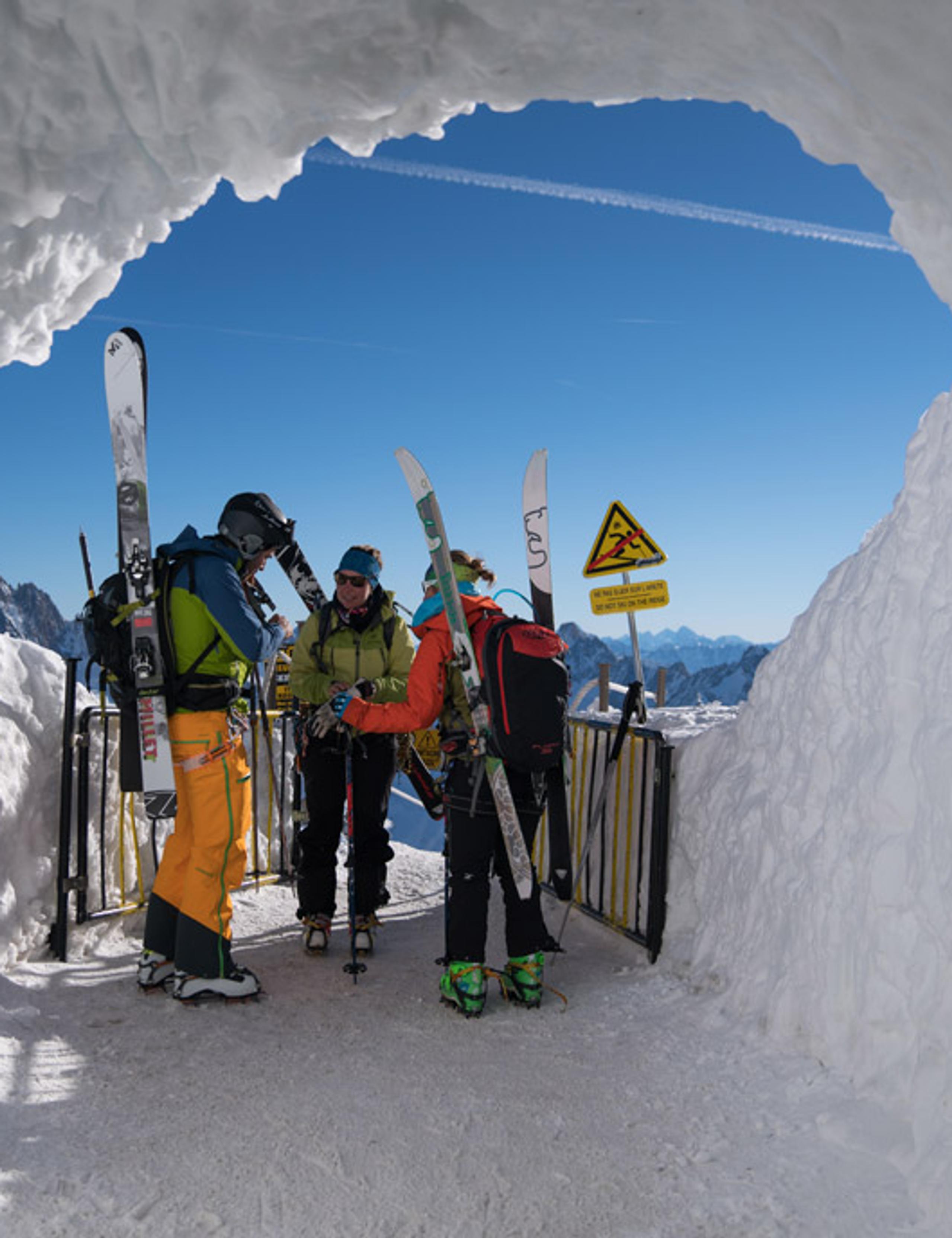 For Fall/Winter 2017, we decided to venture to the Alps, ultimately deciding on Chamonix, France as the destination to photograph our latest men’s and women’s collections. The resort is located less than an hour from the Geneva, Switzerland airport and sits at the base of the Mont-Blanc, the highest summit in the Alps. One of France’s oldest ski resorts, Chamonix boasts an outdoor culture that revolves around backcountry skiing. Wherever you turn, skiers are outfitted in harnesses and equipped with off-piste gear to take on Chamonix’s diverse and crevasse-filled terrain. ↓