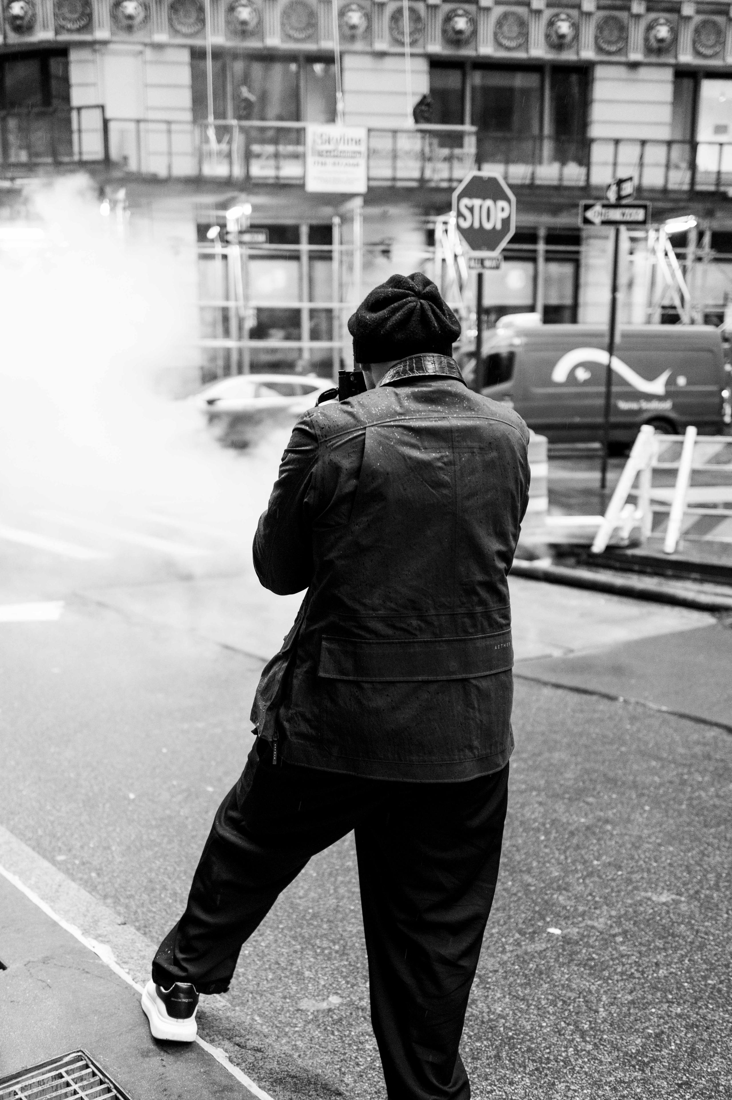 Penman takes this notion one step further by primarily shooting in black and white. On top of being more naturally emotive, these desaturated shots boast a rawer feel, providing an unadulterated look at the realities of our world without color correction or filters. Wearing our new Monochrom Edition AETHER + Leica Reporter Jacket, Penman is a true artist behind-the-lens, possessing an inherent ability to envision a shot prior to taking it. There’s an undeniable beauty to Penman’s black-and-white photos, many of which also possess an unmistakable simplicity. Penman’s choice to regularly photograph in black-and-white often enhances the subjects in his shots, better highlighting shapes and textures — details that can make a world of difference, especially when capturing cityscapes.