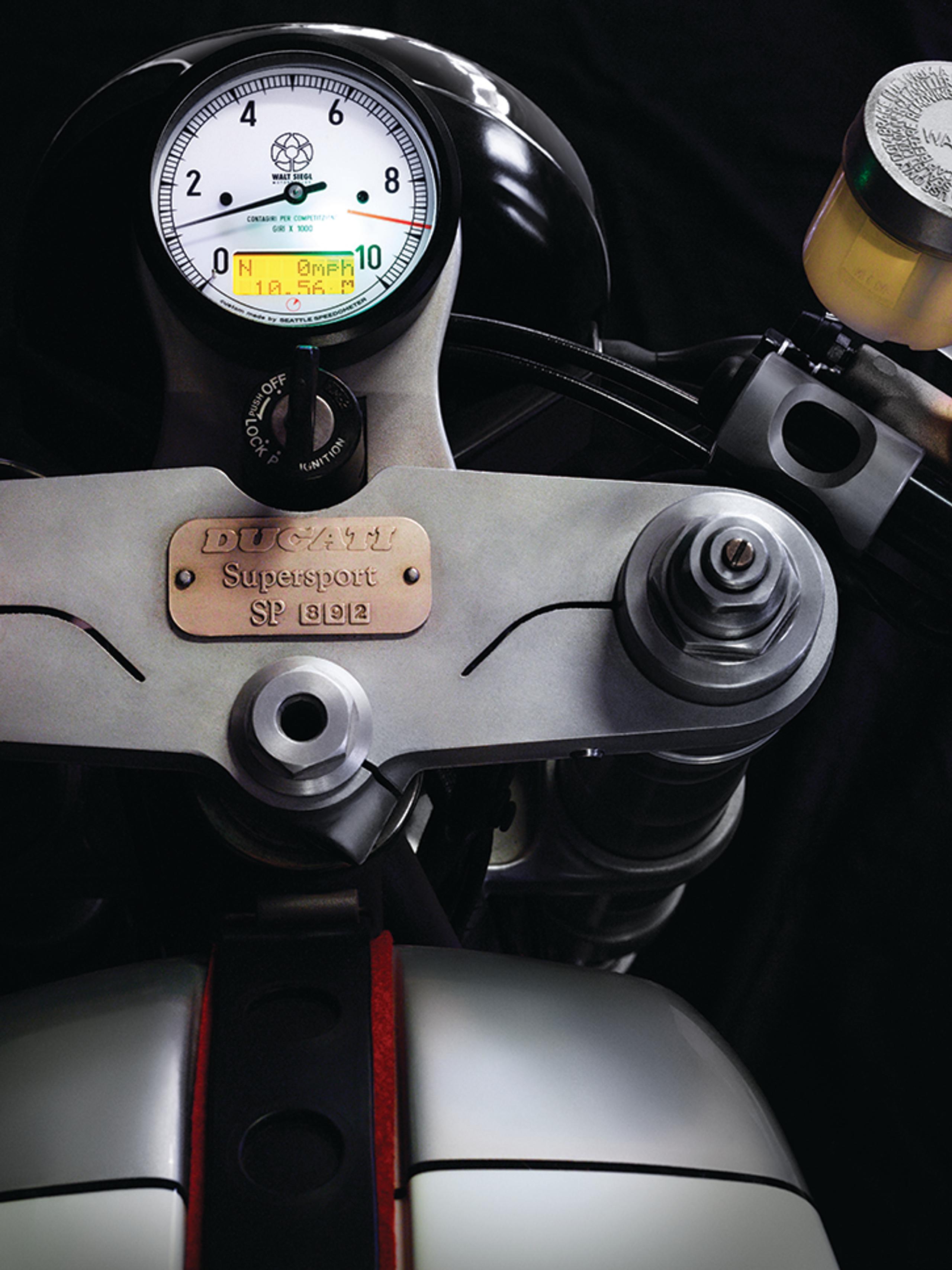 A custom tachometer/speedometer mounted on a limited-series Leggero.