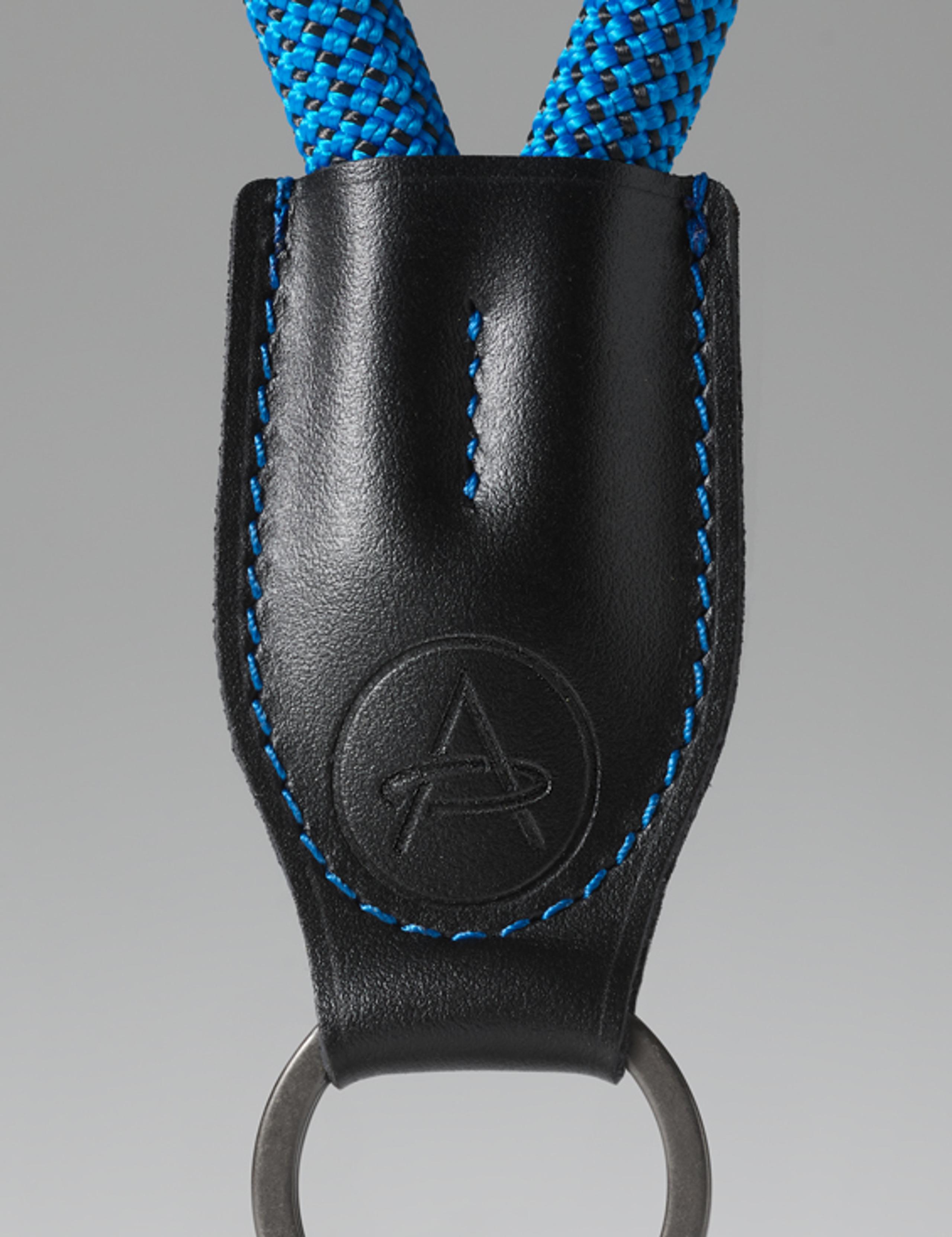 This Kernmantle construction climbing rope has been fitted with a laser-cut black calf leather cover decorated in a custom debossed AETHER logo and contrasting hand-stitched Summit Blue accent threading.