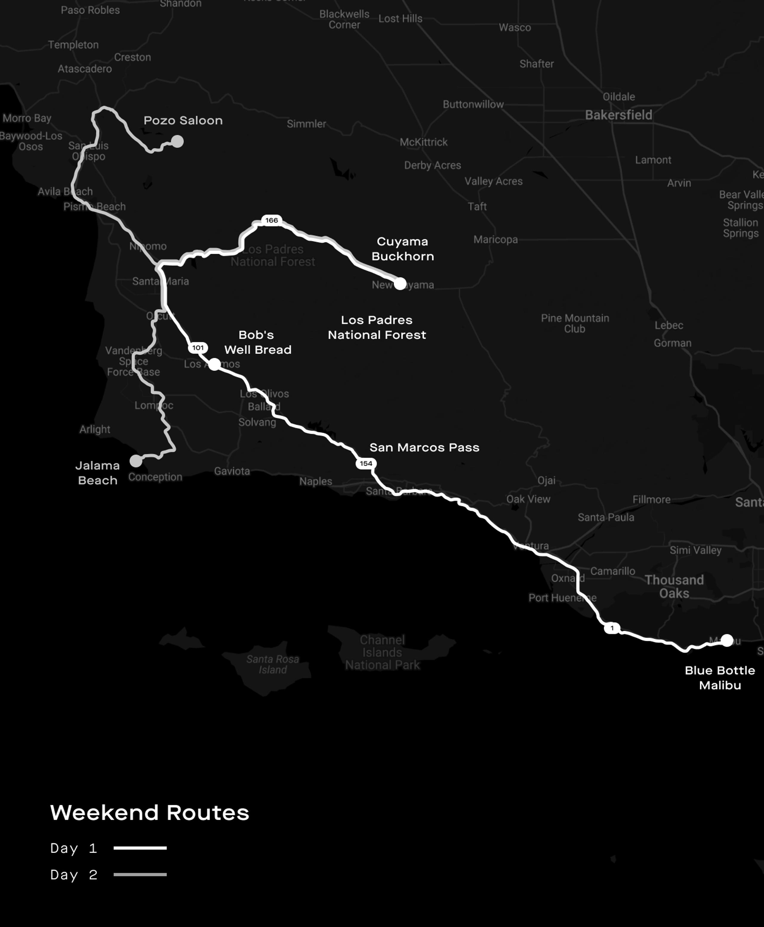 2:30PM - Departure: North, to Foxten Canyon Road, to Tepusquet Rd to 166