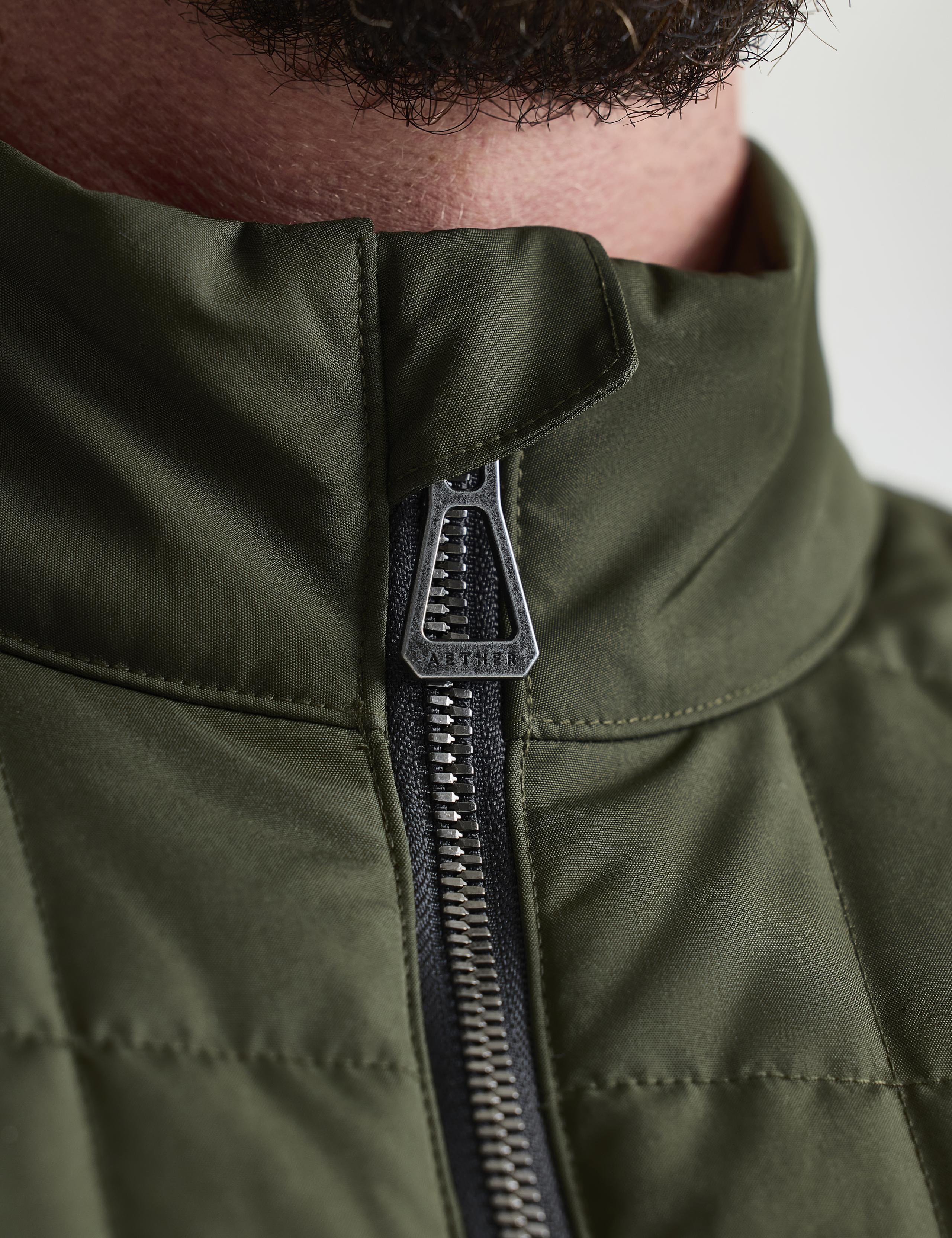 The Alto’s design details include a stand collar, a zipper garage on the top collar to keep cold metal from pressing against the skin. There is also a shaped hem and AETHER-logo embroidery on the back collar.