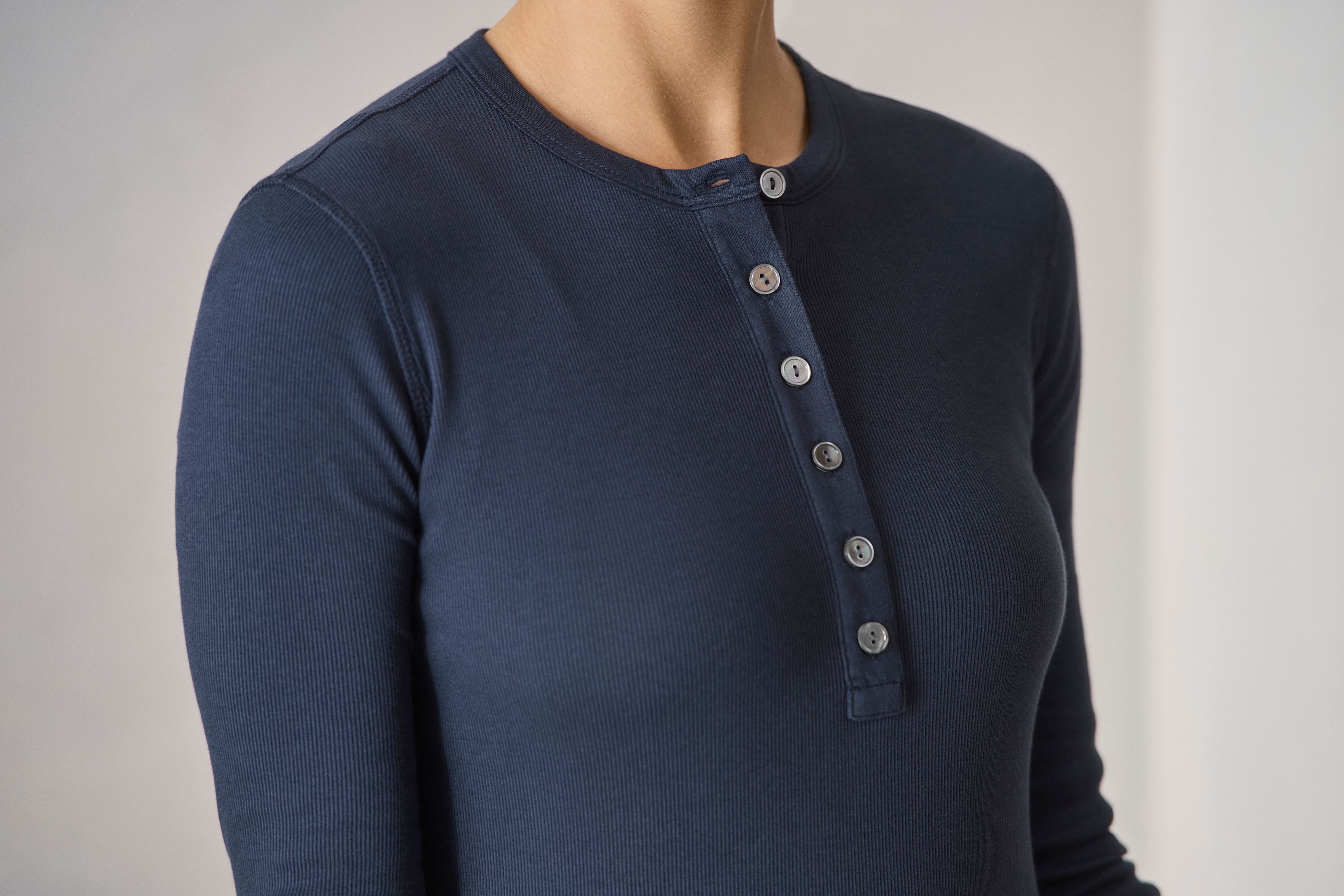 Demonstrating AETHER’s knack for sweating the details, the Amara Long-Sleeve Ribbed Henley features jersey binding at the neck opening and coverstitching details at the seams. The center front of this ribbed henley comes adorned in a jersey placket and half-a-dozen premium shell buttons.