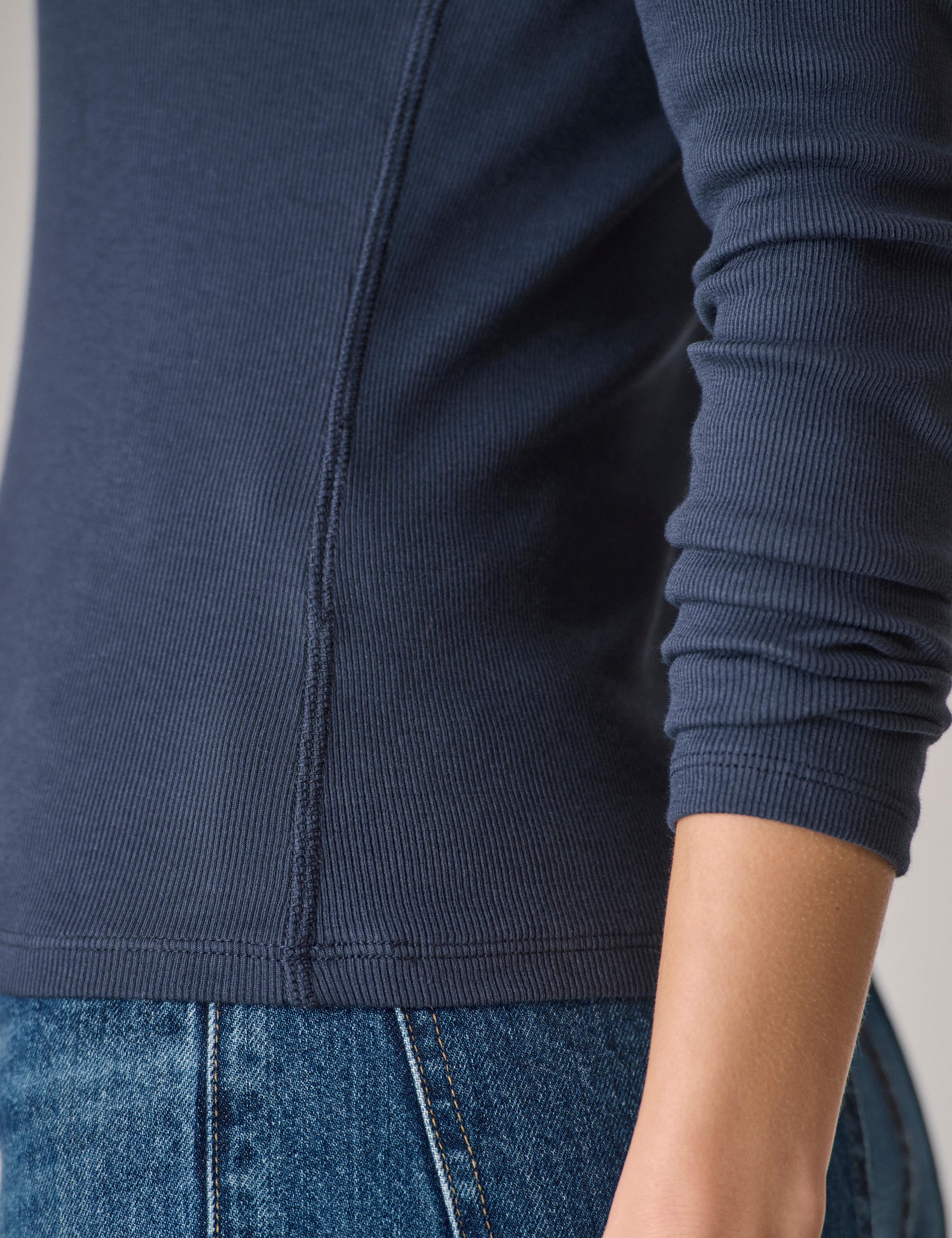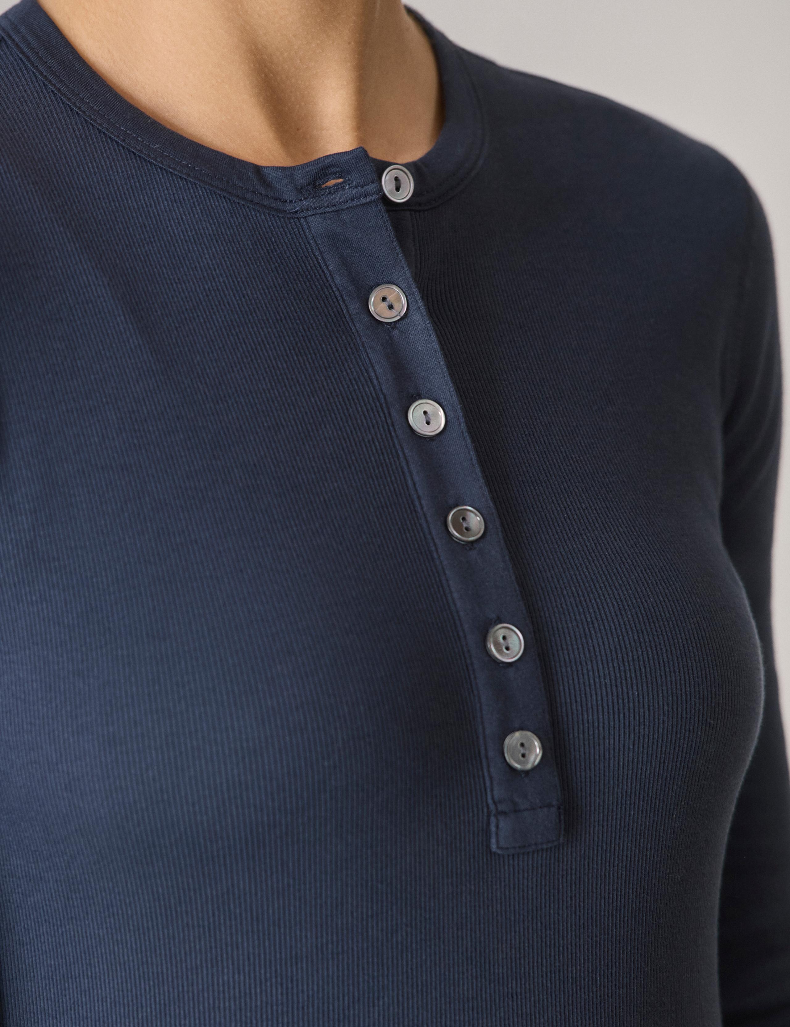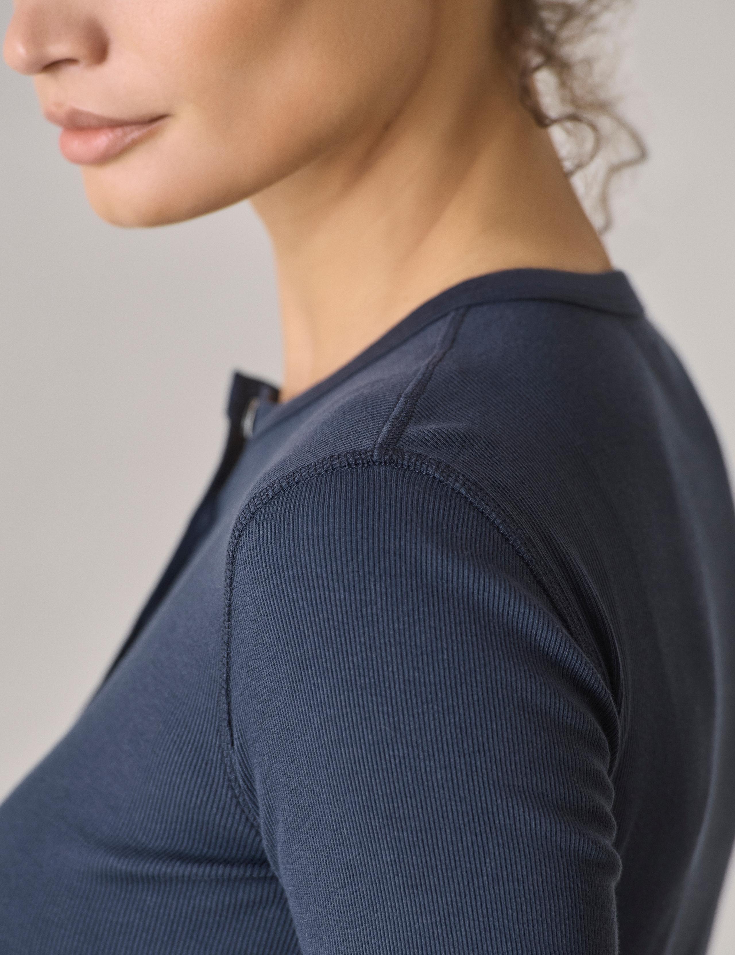A versatile women’s wardrobe staple, our Amara Long-Sleeve Ribbed Henley features a slim fit and a full 2x1 rib-knit, organic Pima cotton construction infused with Lycra for added two-way stretch.