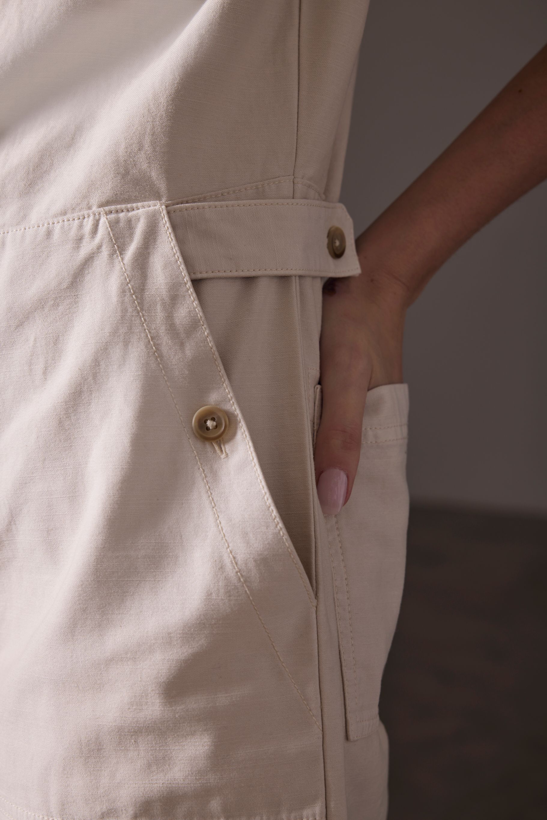 The Bard Jumpsuit is replete with pockets. There are two chest drop pockets and two angled entry hand pockets with button closures for item security in the front,