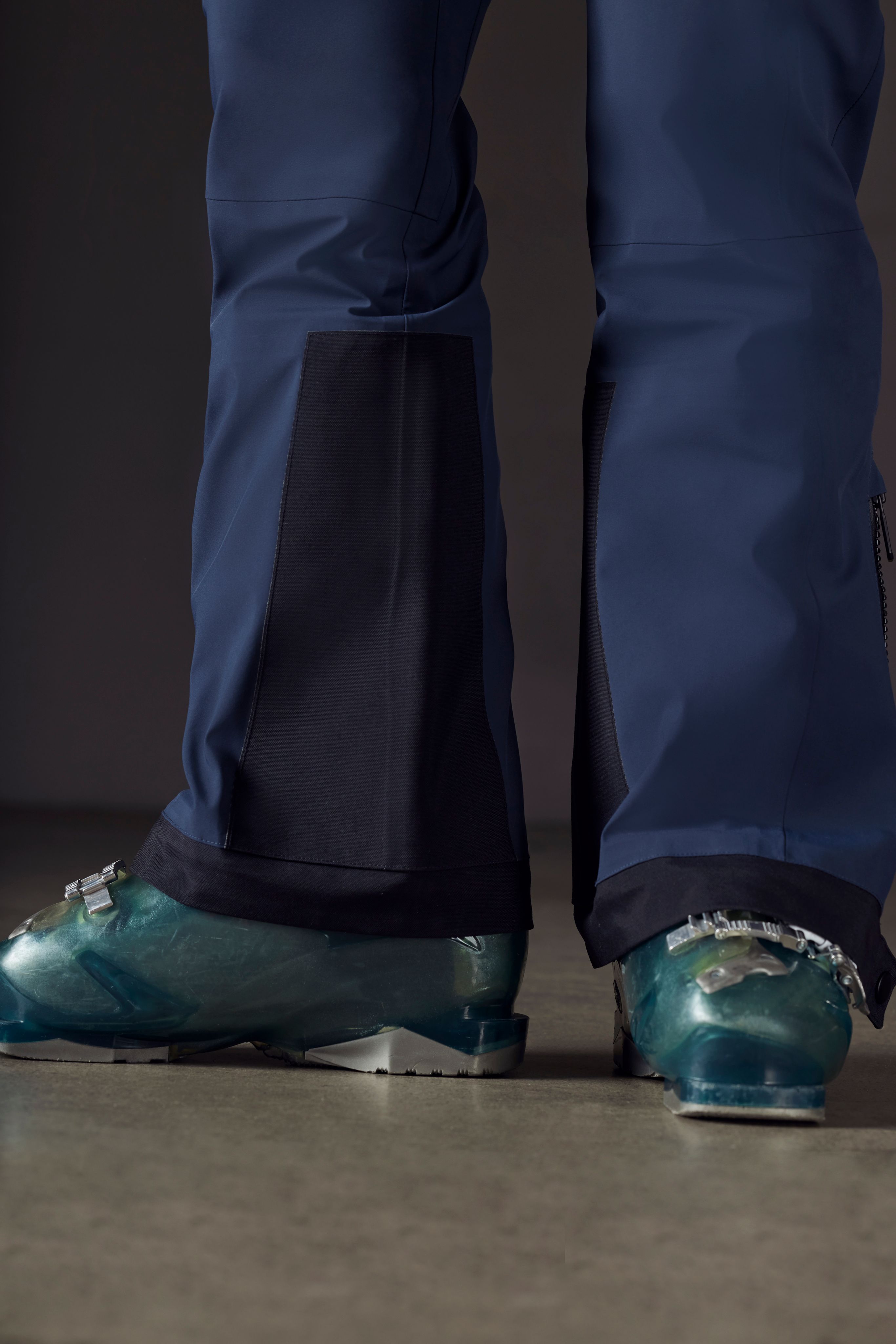 The bottom inseams are equipped with a durable scuff guard to prevent damage to the fabric. The pant includes an interior snow gaiter elasticated at the ankle cuffs to go over your boots and keep the snow out. Hidden snaps secure the bottom hem and gusset.