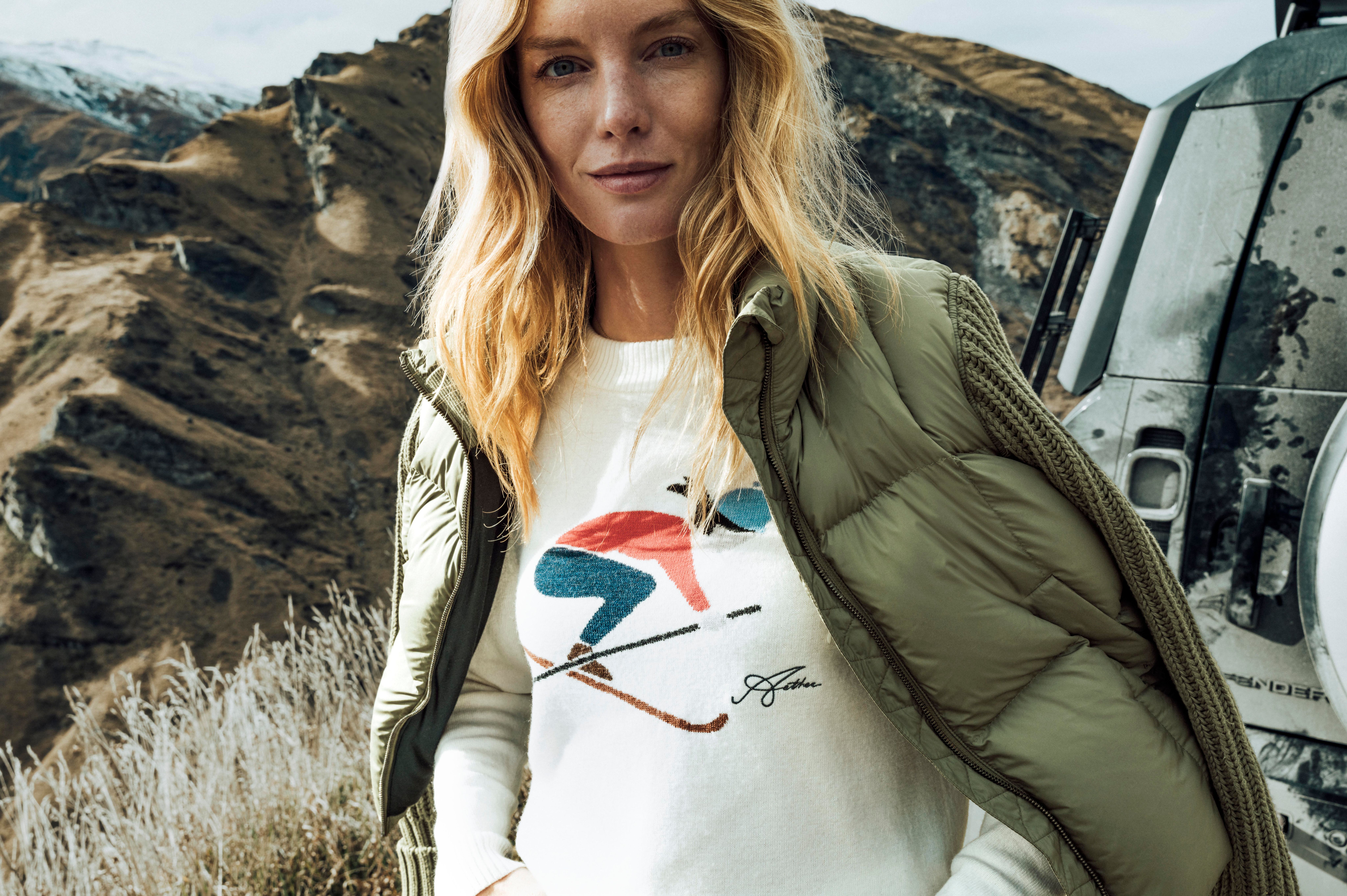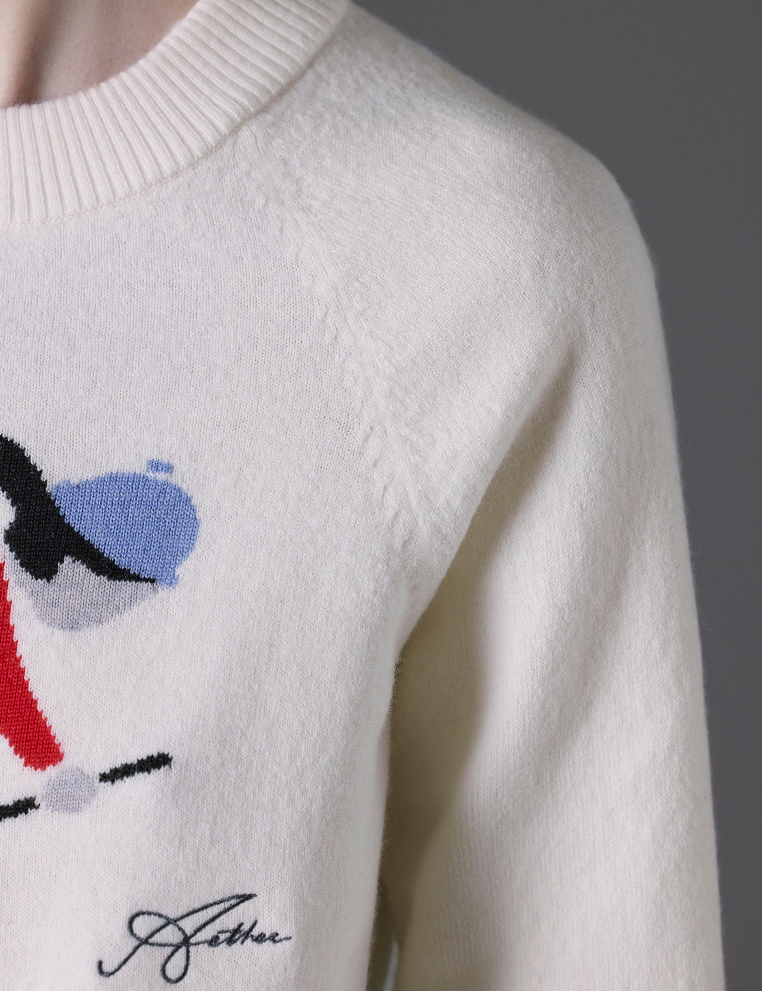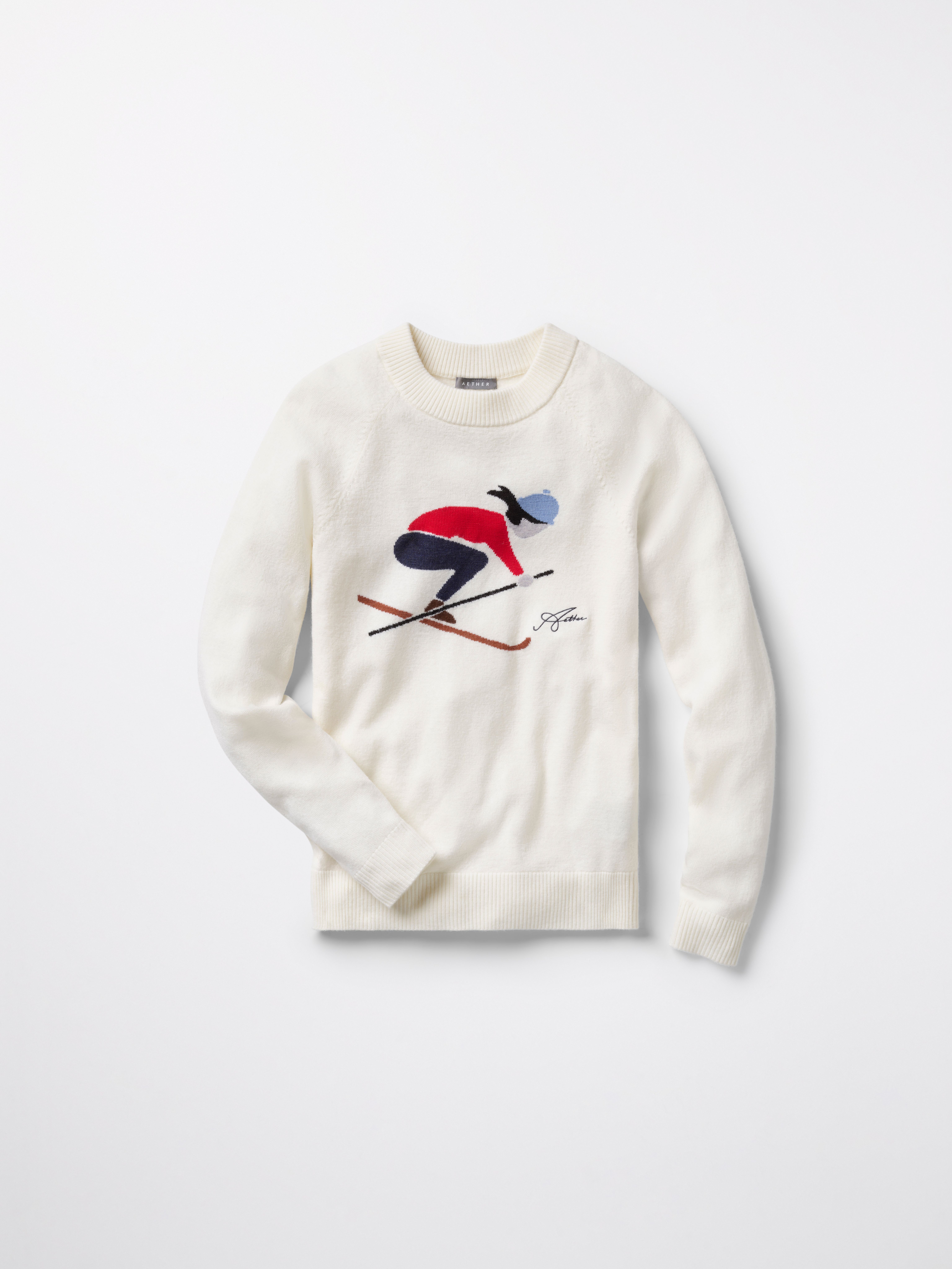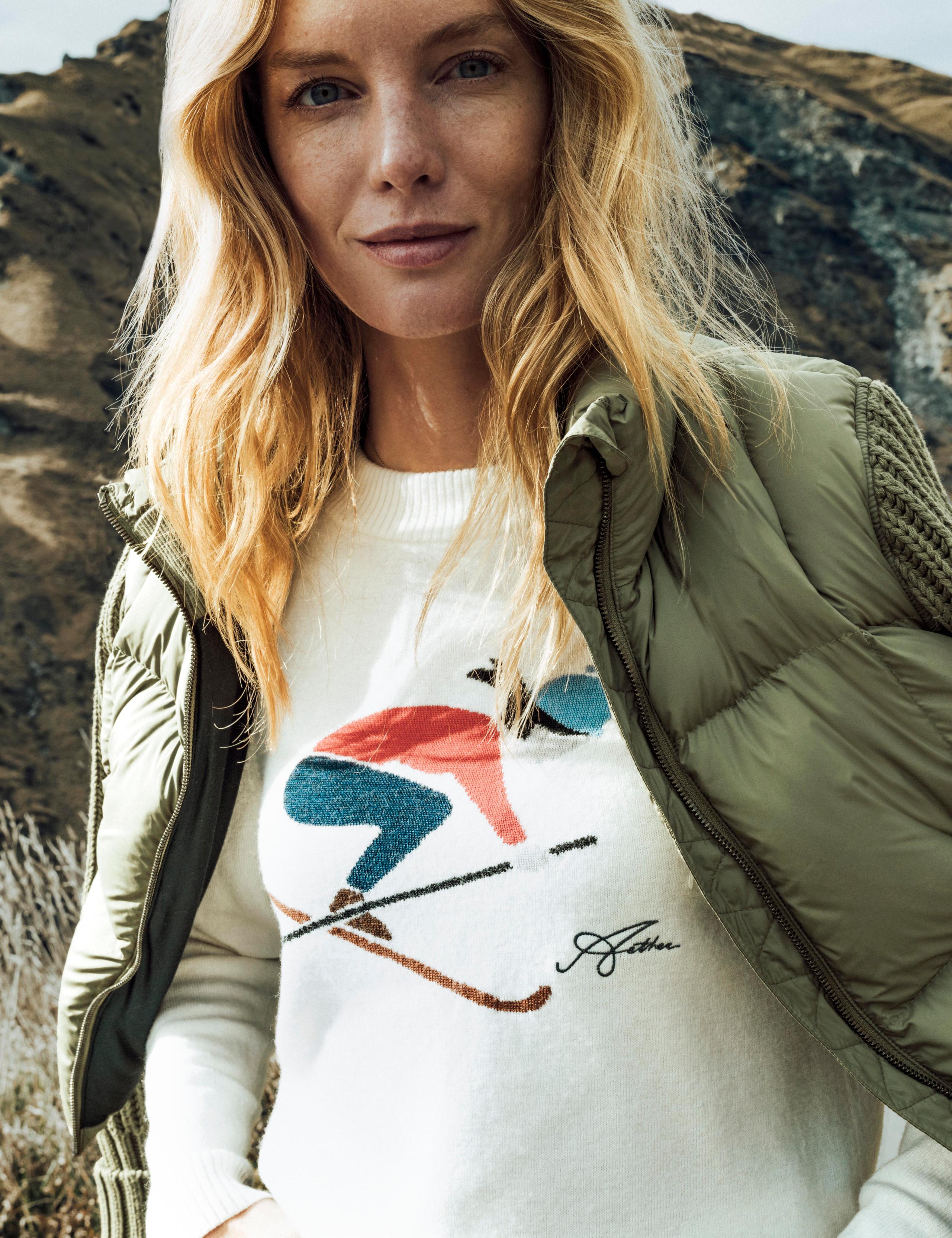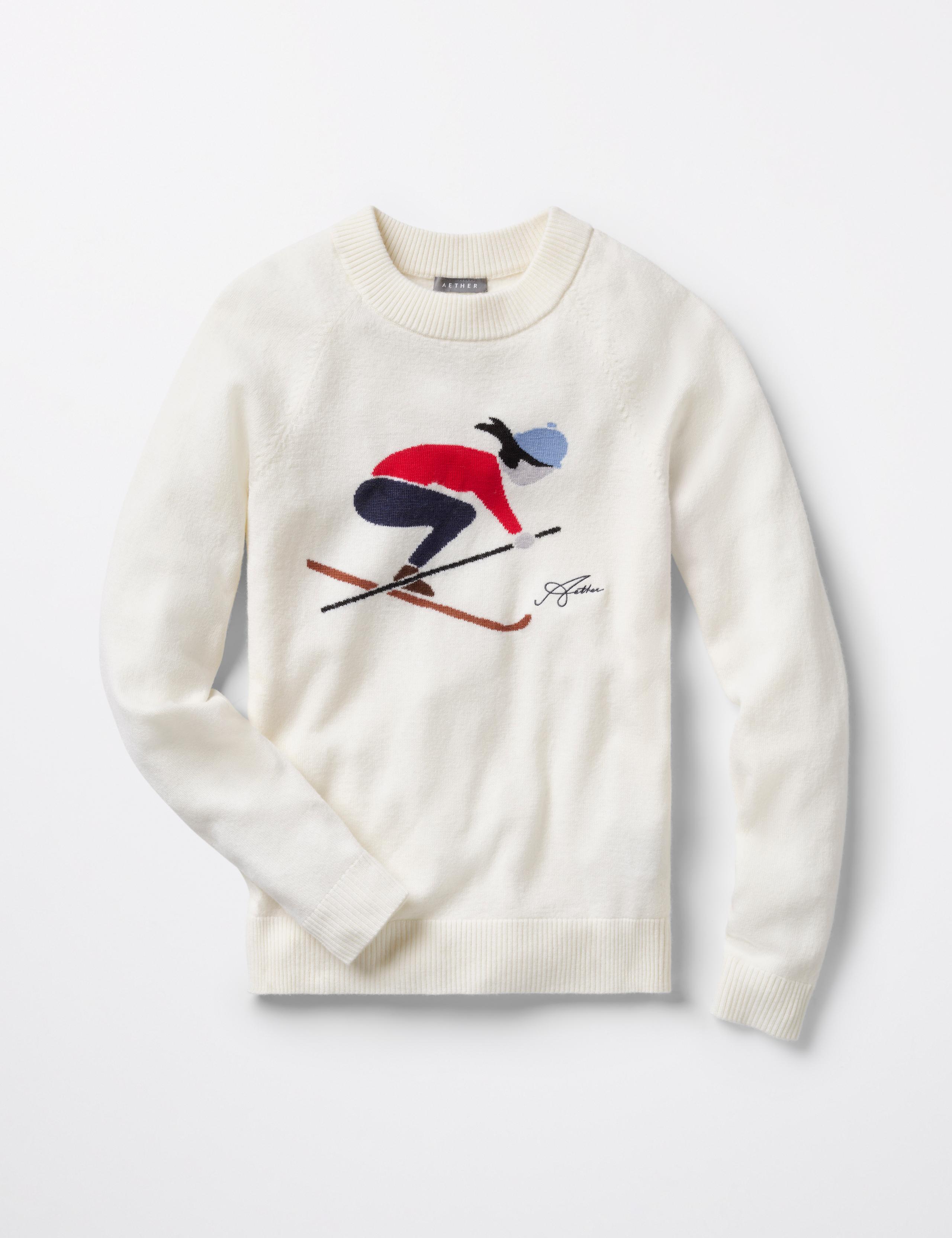 Knit with a warm and breathable 100% extra-fine merino wool, our Bridget sweater features a wintery jacquard design of a downhill skier in action.