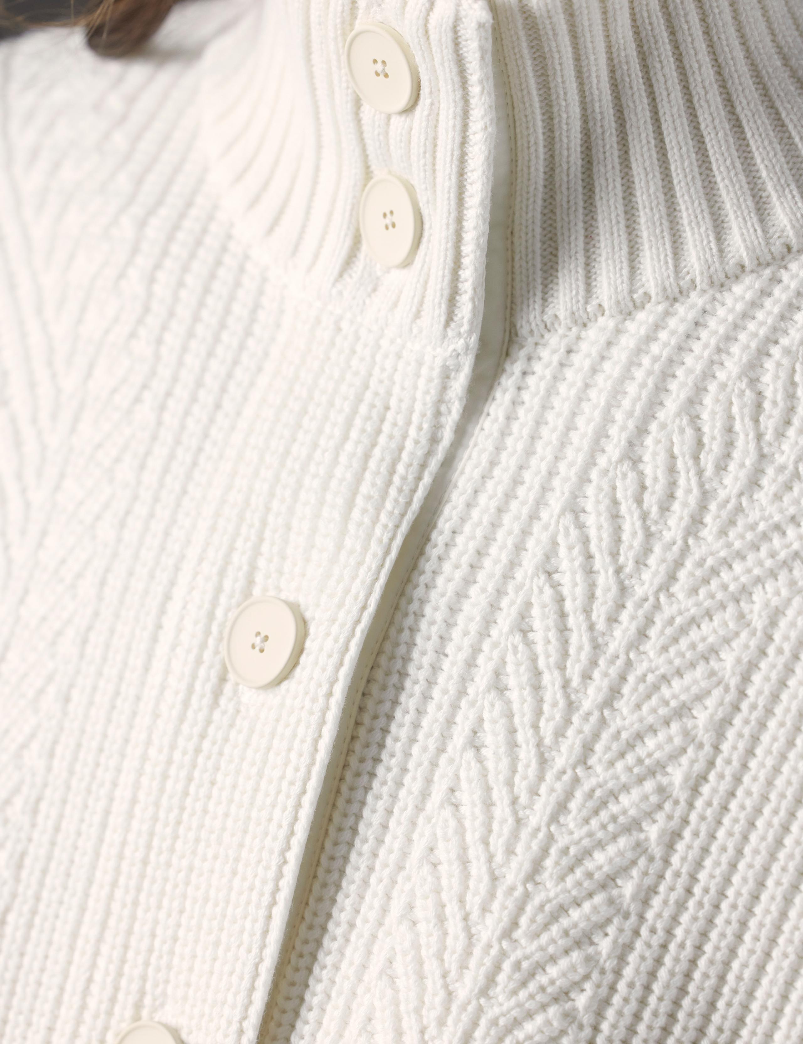 Crafted from a luxurious cotton-cashmere blend, our Cato Buttoned Sweater merges elevated craftsmanship within a minimal aesthetic. The half cardigan stitch, adorned with ribbed knit and intricate detailing, sets it apart in both texture and design.