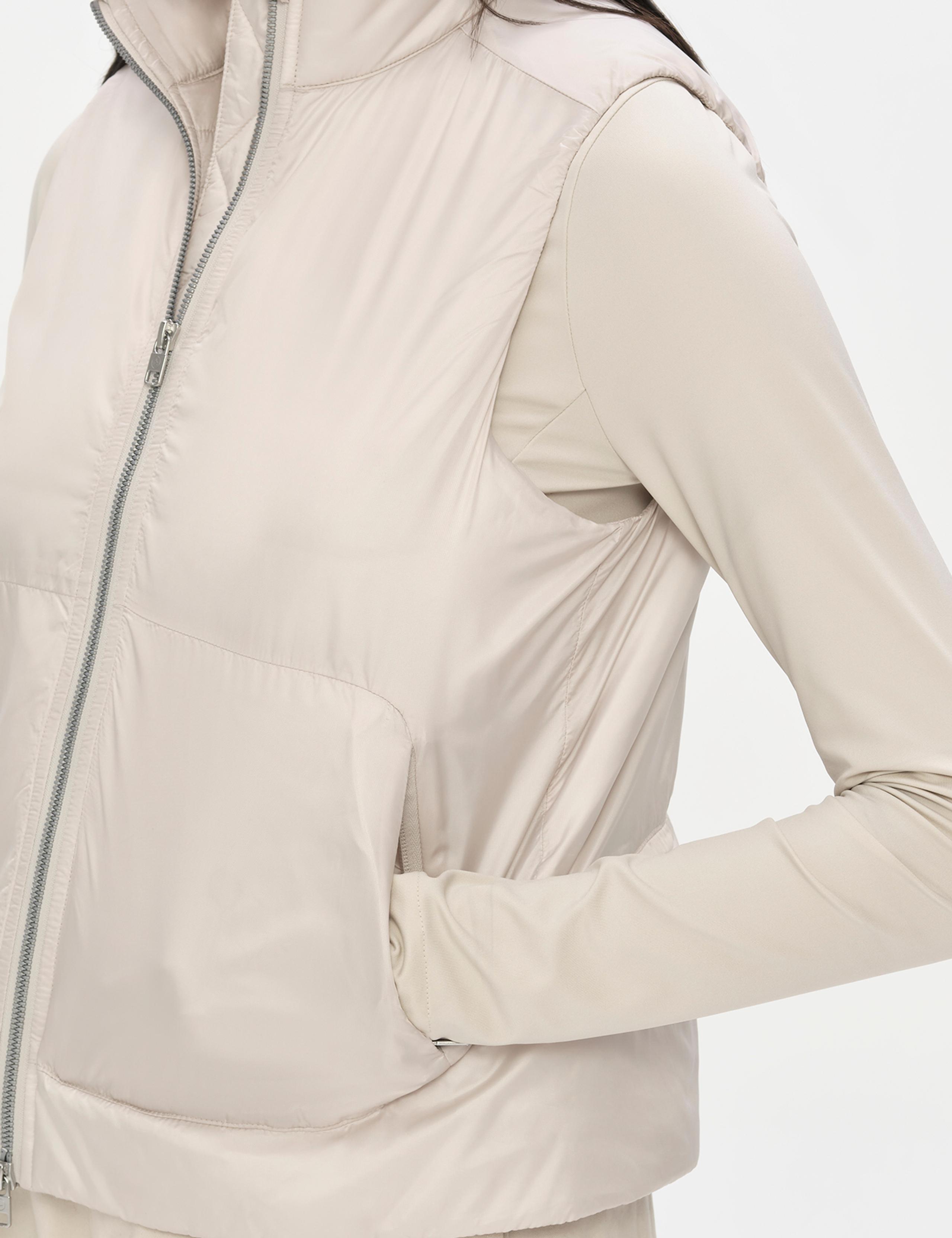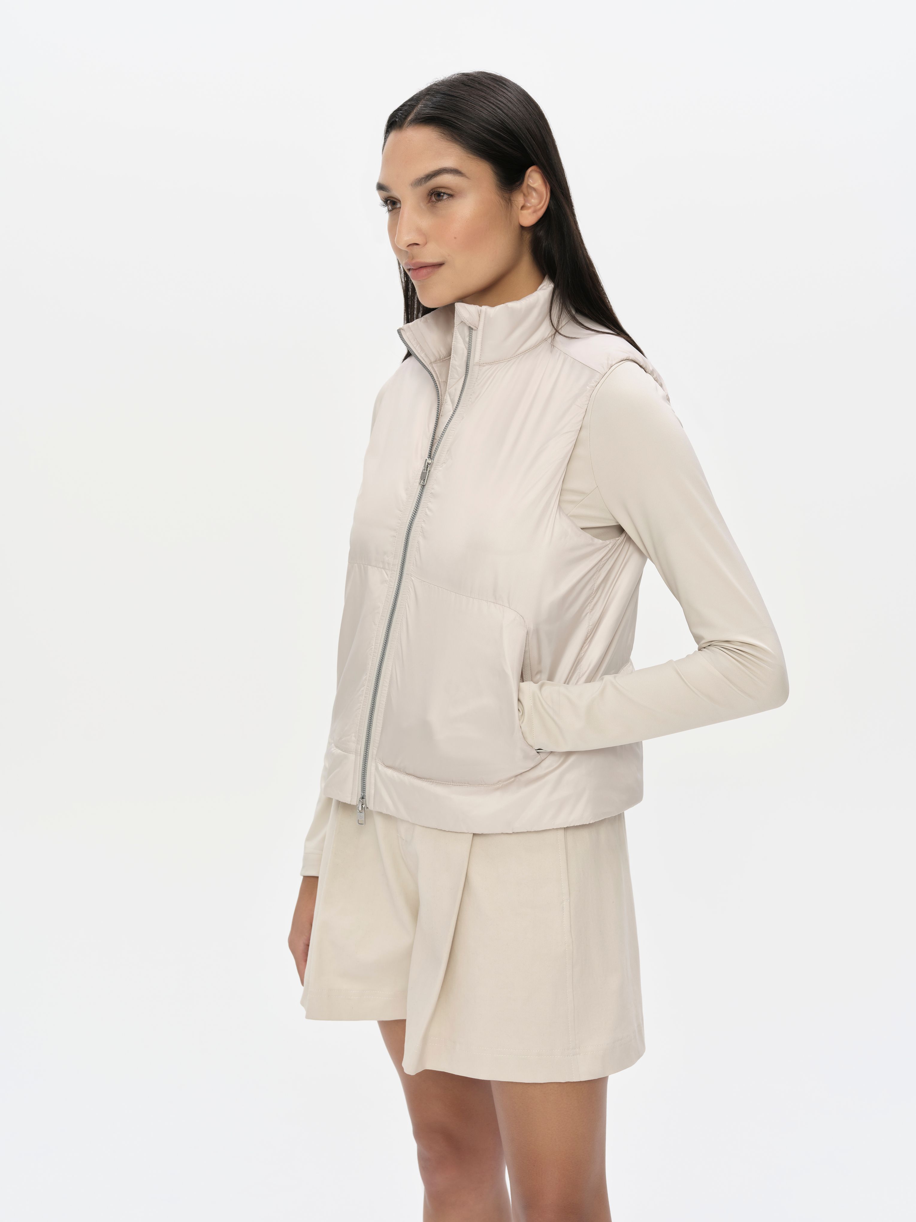The top of the vest sports a mock neck while the sides feature clean-finished armholes with encased elastic.