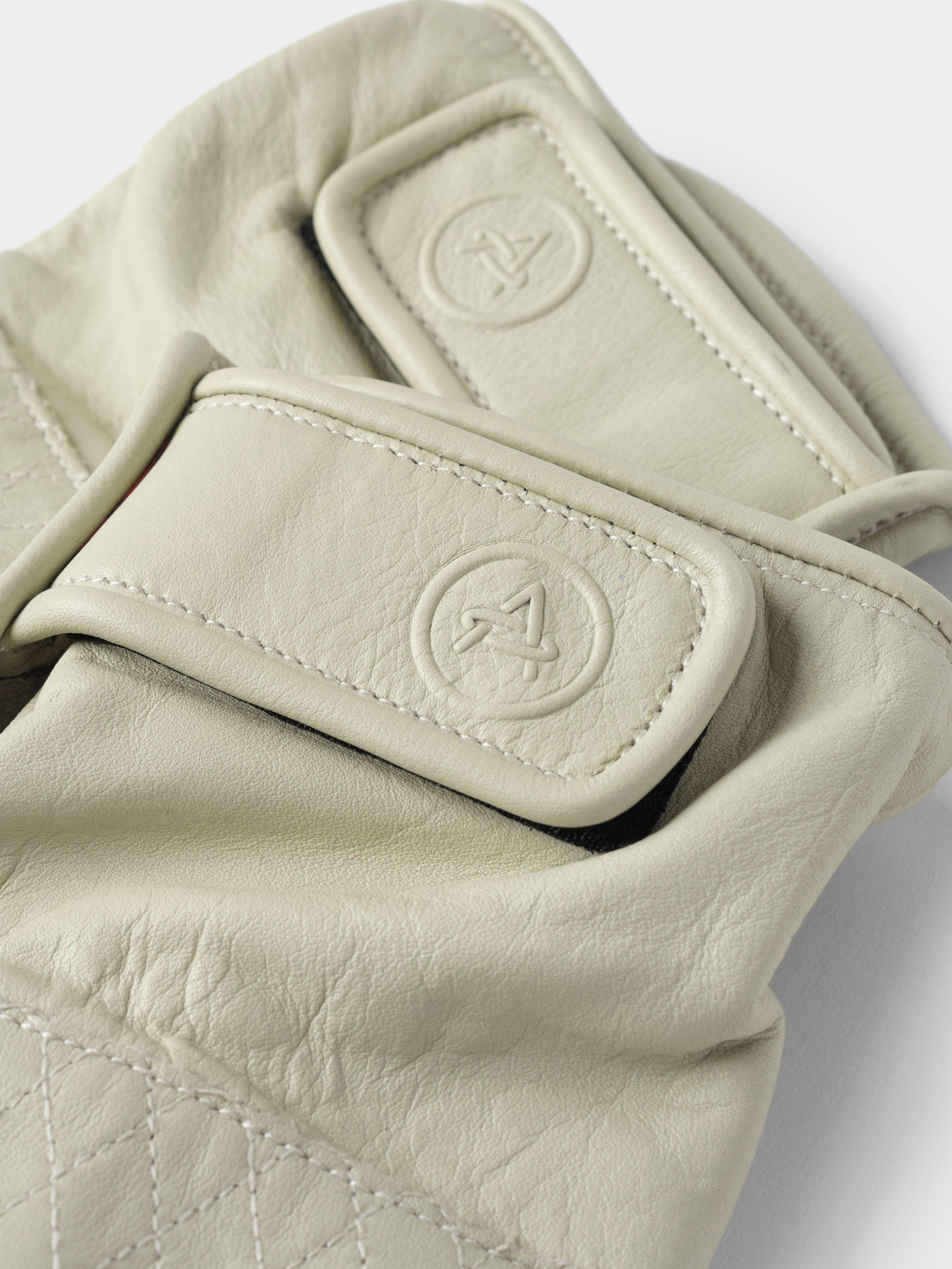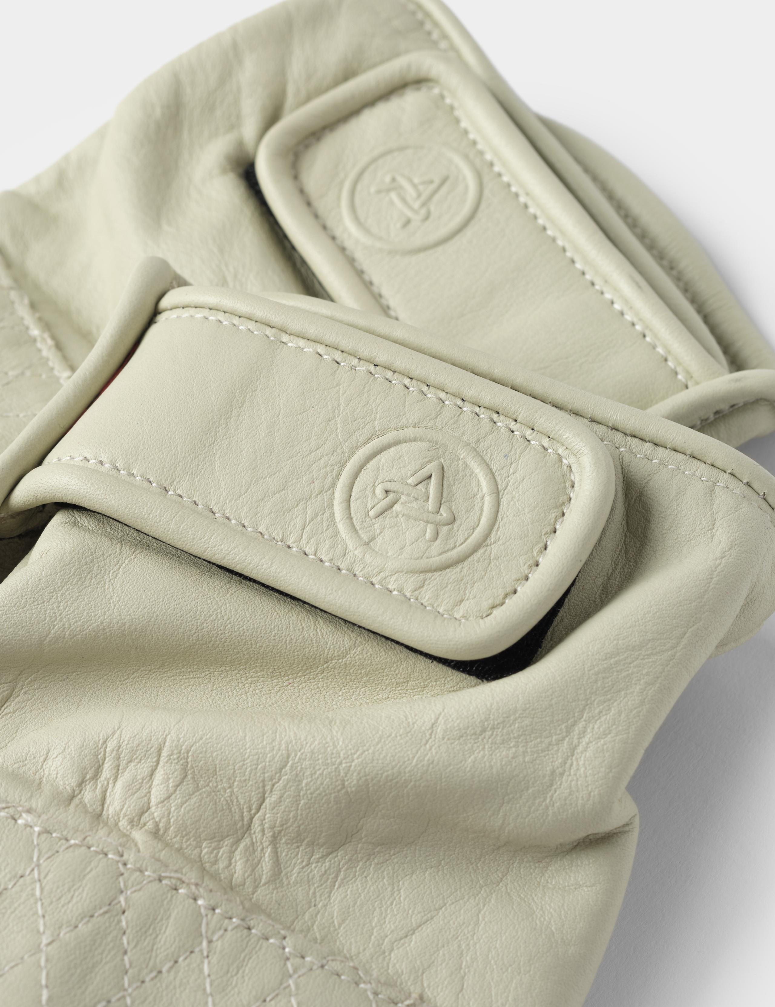 The cuffs of the second-gen Moto Glove sport elastic at the wrist and custom-embossed AETHER-branded, Velcro-secured pull tabs.