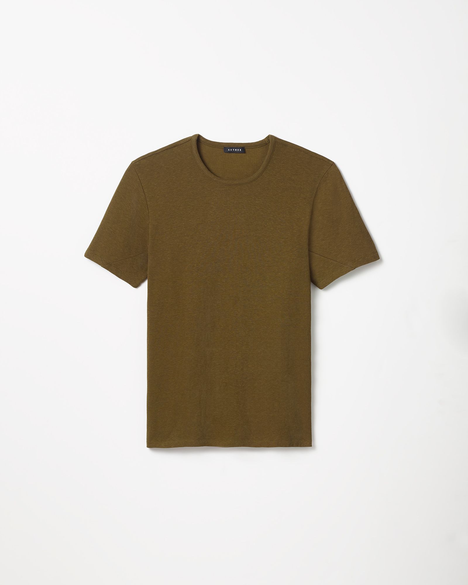 The Cotton Hemp Crew Tee features self binding at the neckline, angled seam at the underarms, and the AETHER-signature chain-stitching along one side.