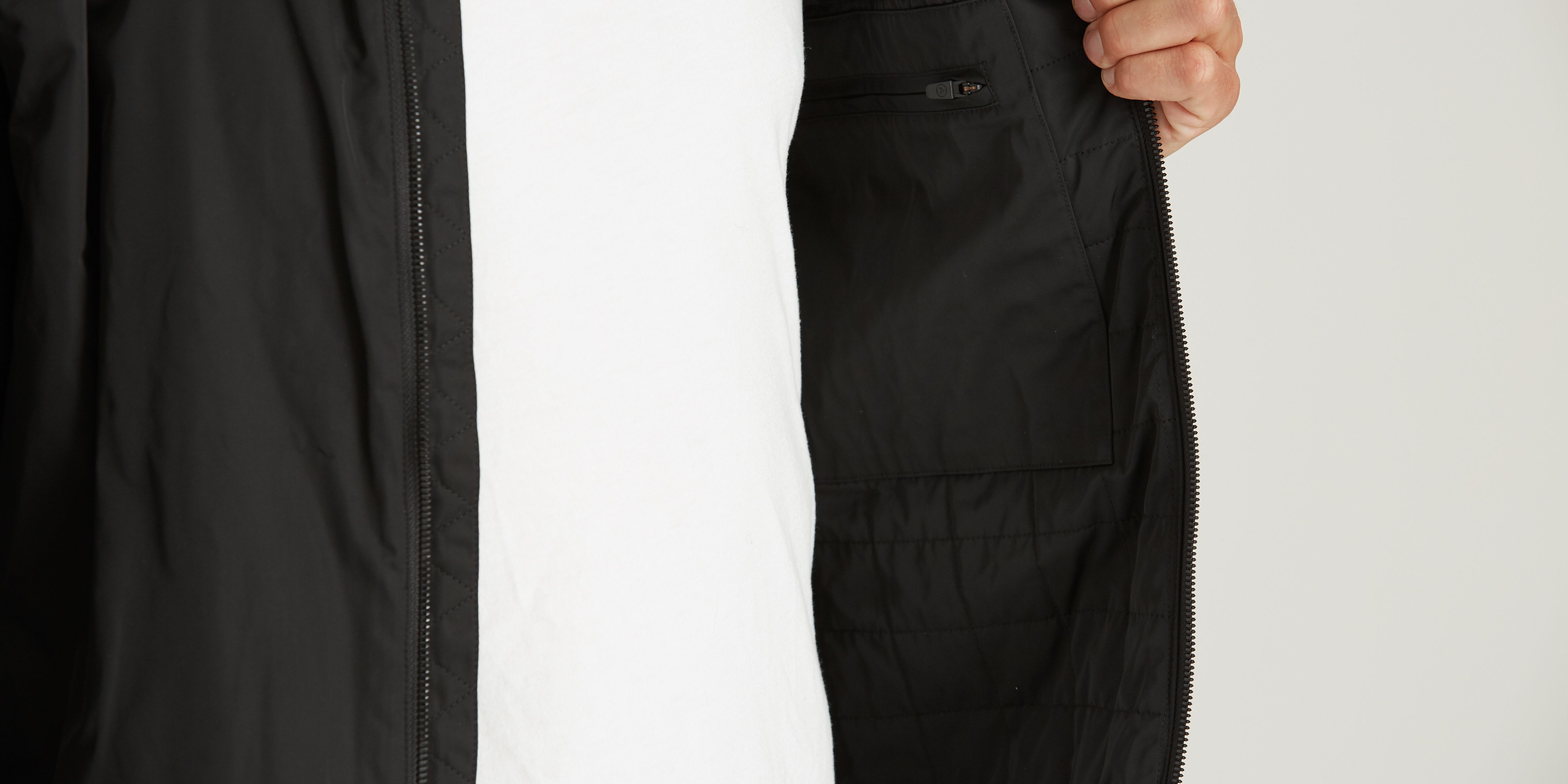 The Drive Jacket’s clean aesthetic is topped off by a rib knit at the sleeve cuffs and at the inset of the body hem.