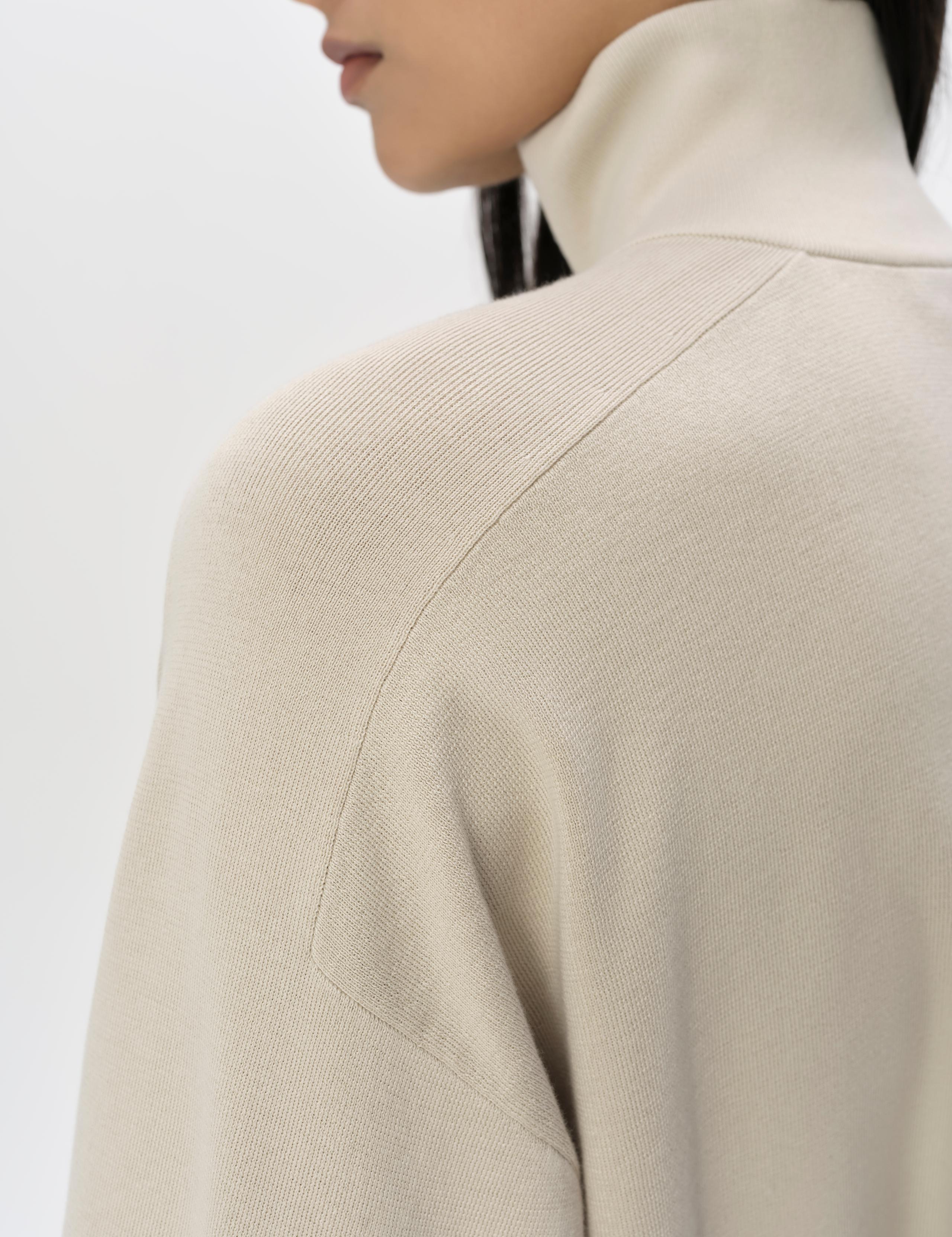 Further enhancing overall comfort and coziness is 1x1 rib-knit turtleneck collar and sleeve cuffs, as well as a shaped raglan sleeve design.