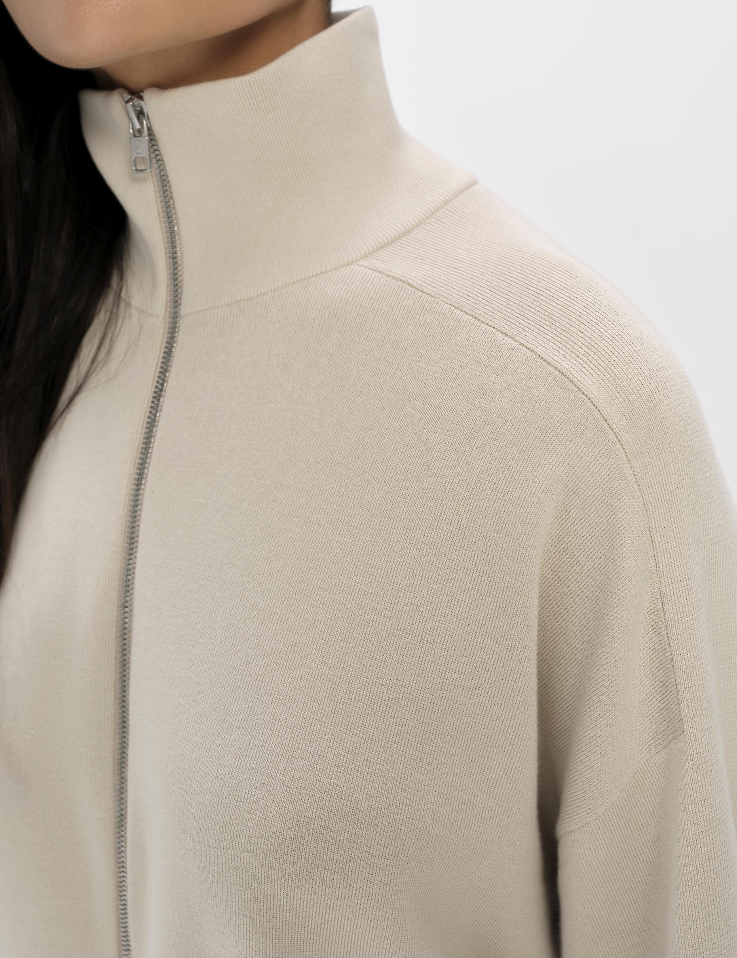 The center-front of the Eliana Full-Zip Sweater is secured using a two-way zipper.