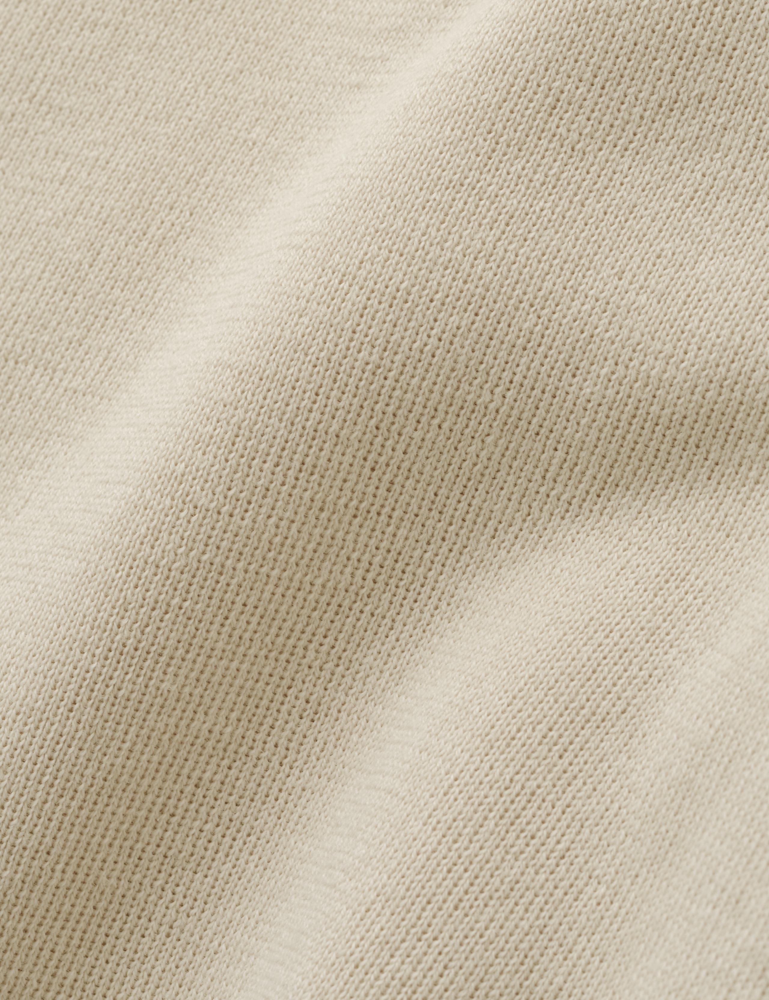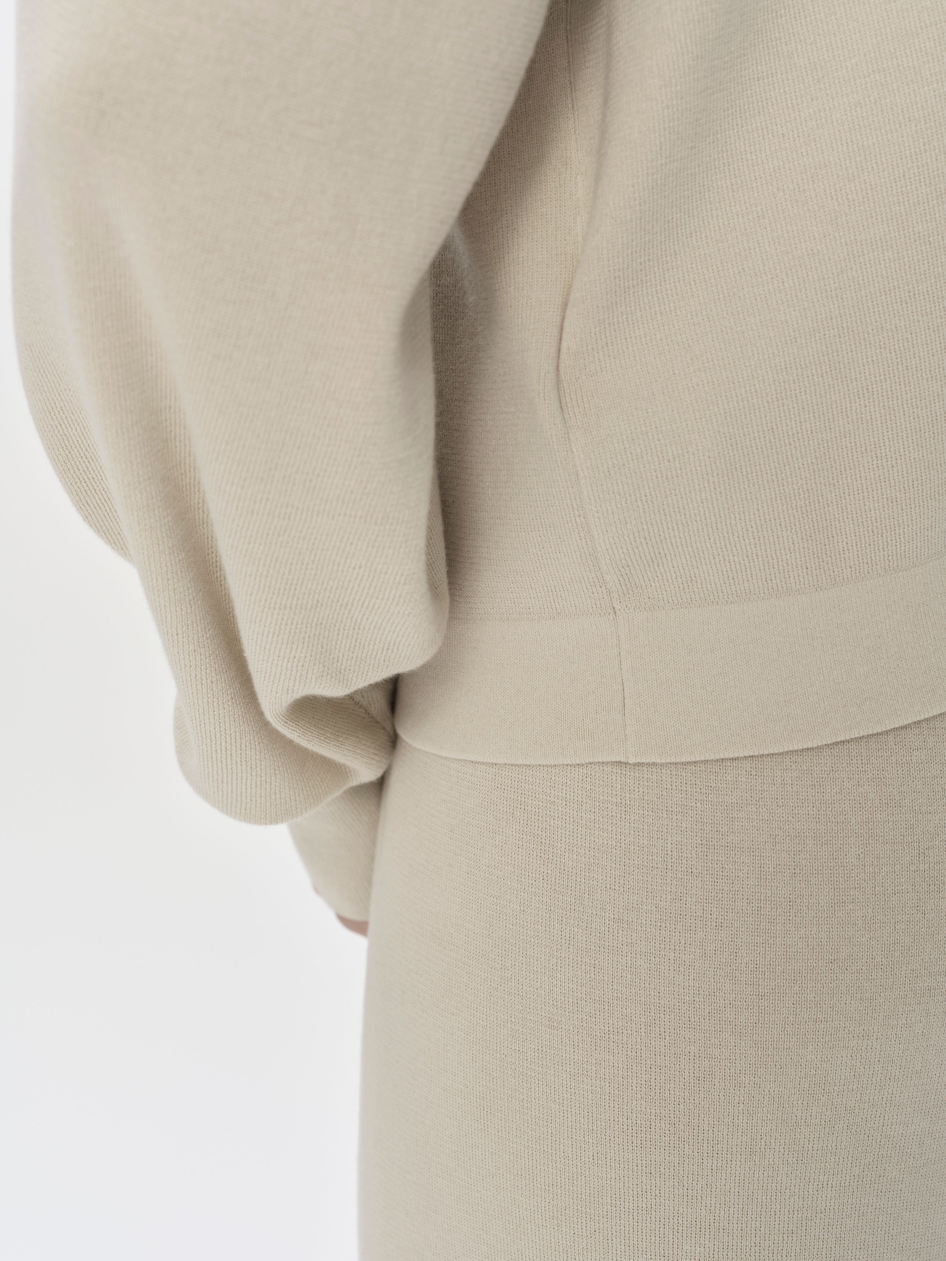 The sweater’s main body construction consists of a fine-gauge jersey stitch at the body and sleeves.