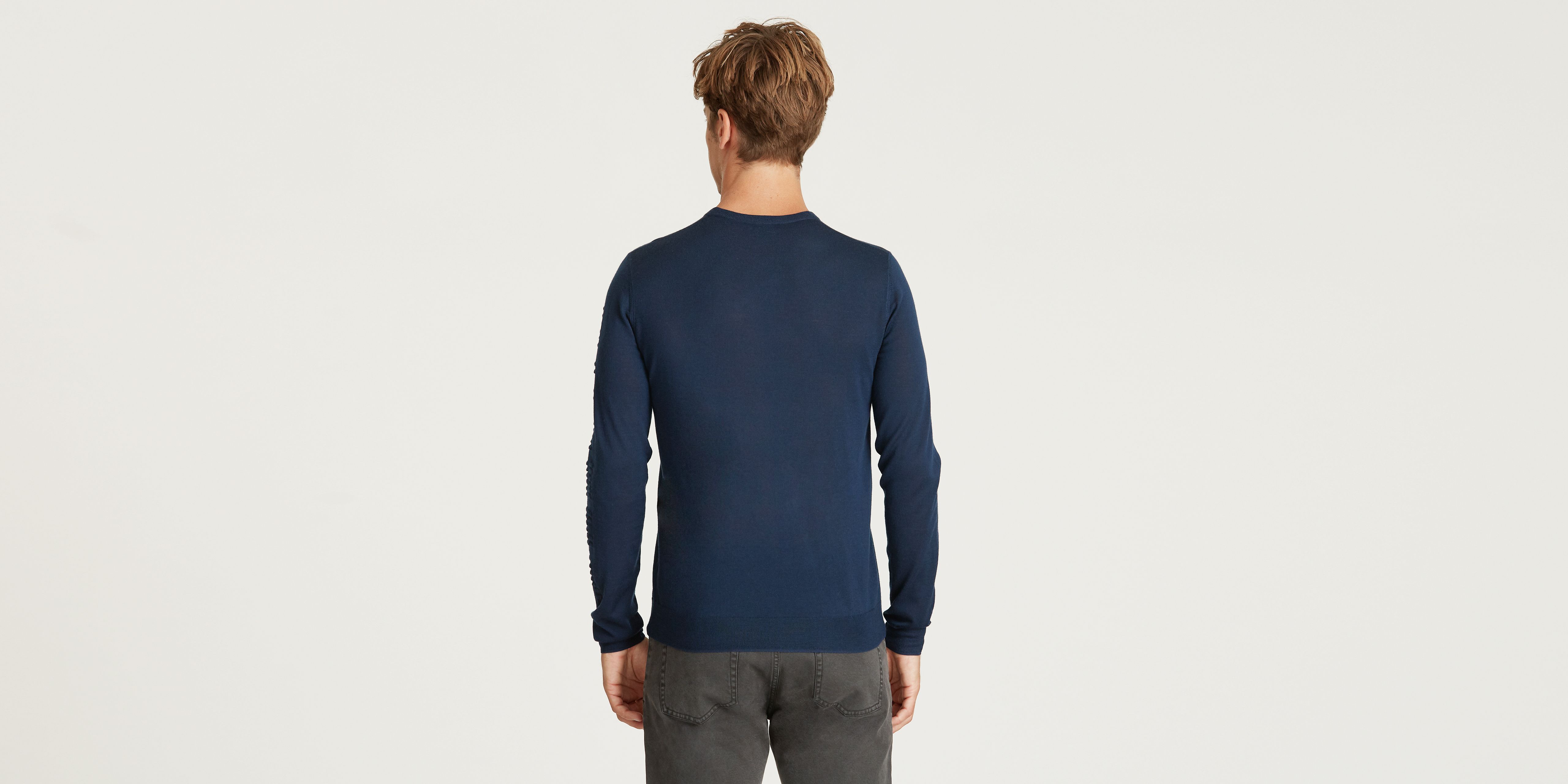 Made from a super-fine, 100% merino-wool jersey knit, the Embossed Sweater has a subtle detail you may miss unless you look closely: The wearer’s left sleeve bears a custom-knit AETHER logo.