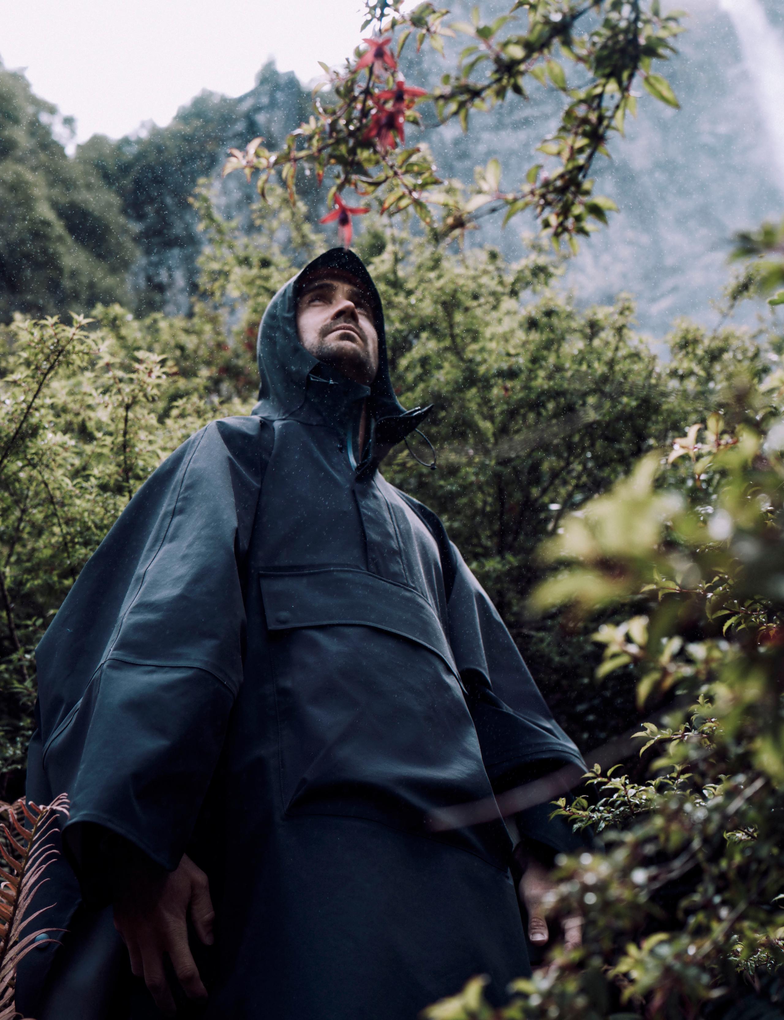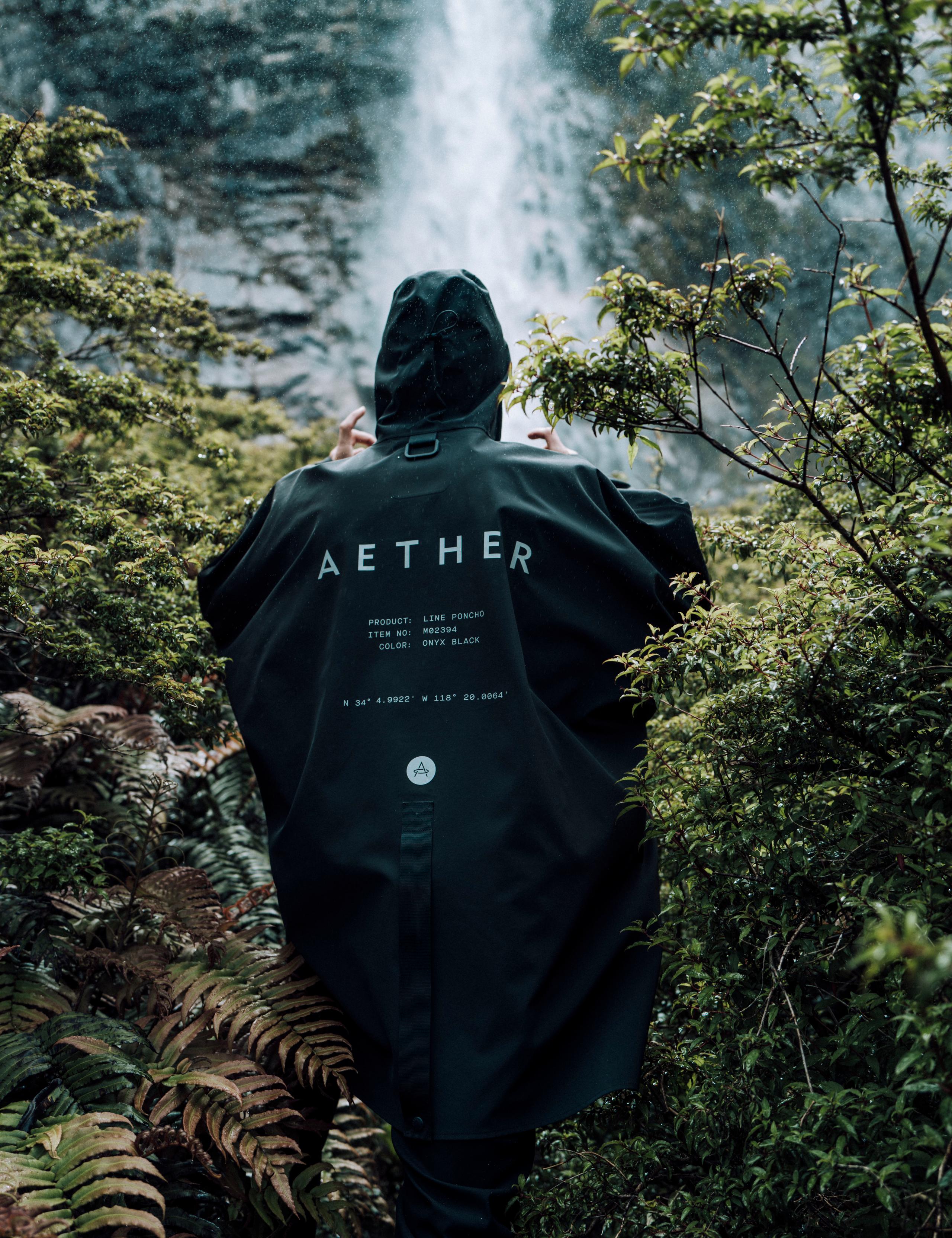 Outdoor lifestyle view of back of man walking through jungle in front of waterfall wearing the Line Poncho from AETHER Apparel.