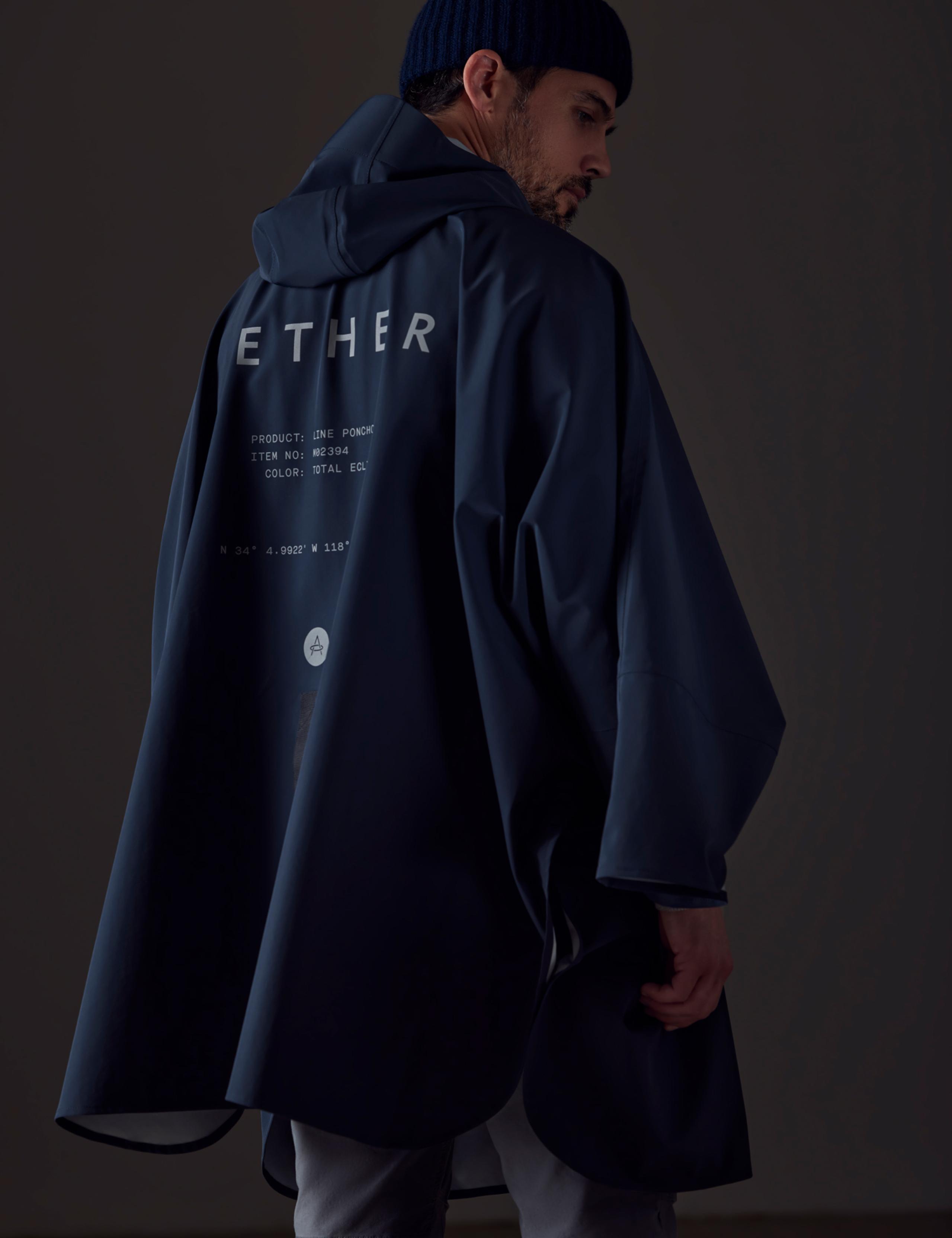 Full-body view of man wearing the Line Poncho in Onyx Black from AETHER Apparel.