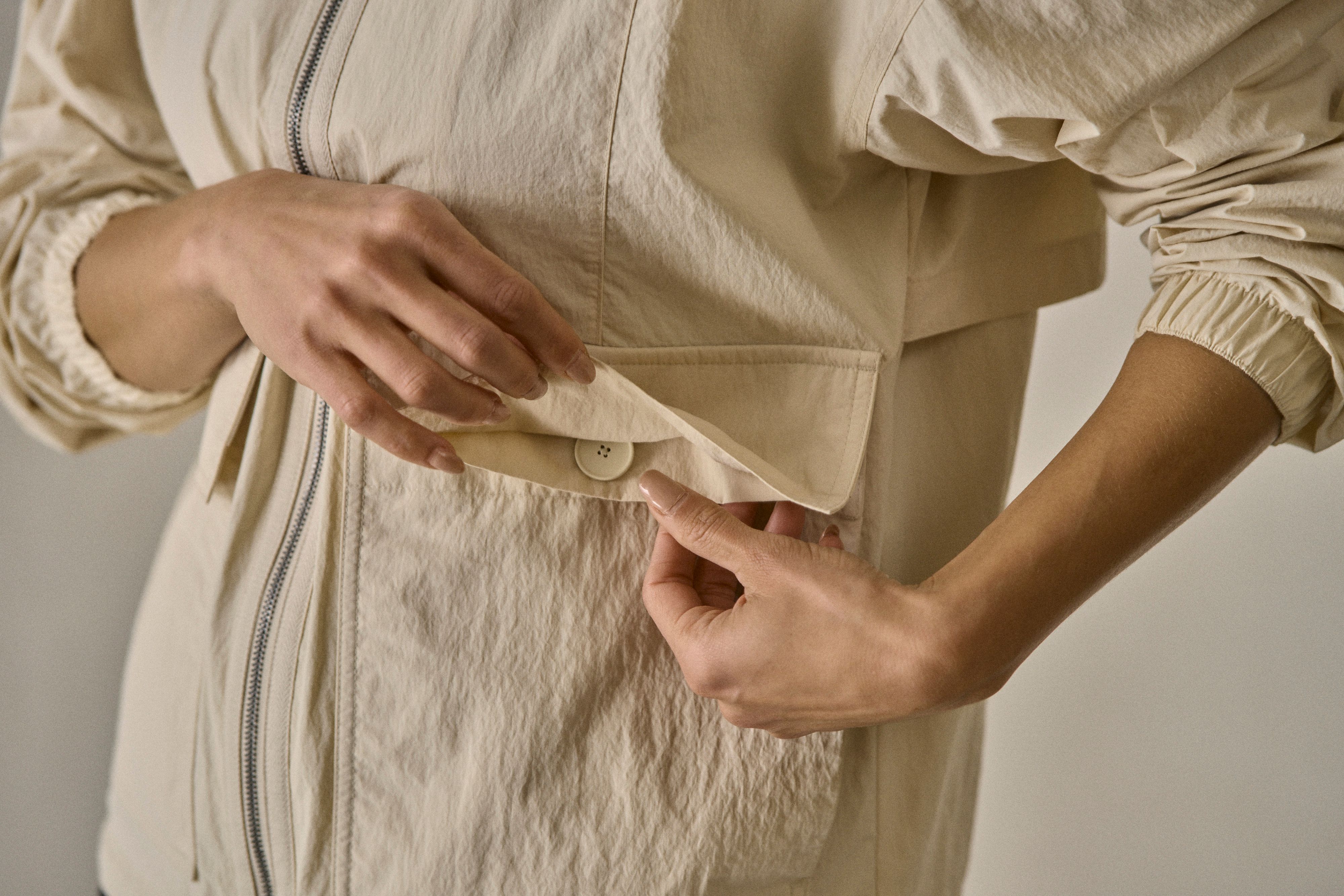 Thanks to side entry hand pockets hidden beneath a set of patch pockets with cover-flaps and rubberized button closures, the Mila Windbreaker offers true storm-ready storage.
