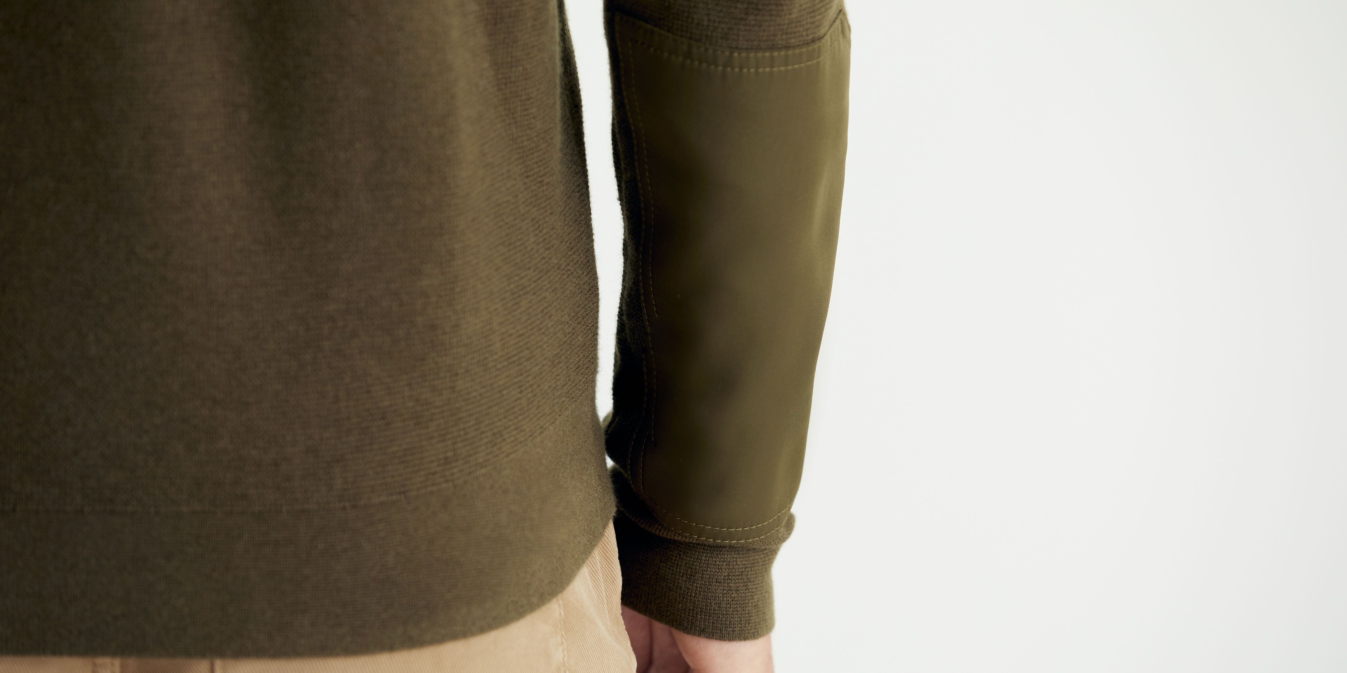 Top-applied woven panels on the sleeves add a touch of tech to a versatile, everyday-wear sweater.