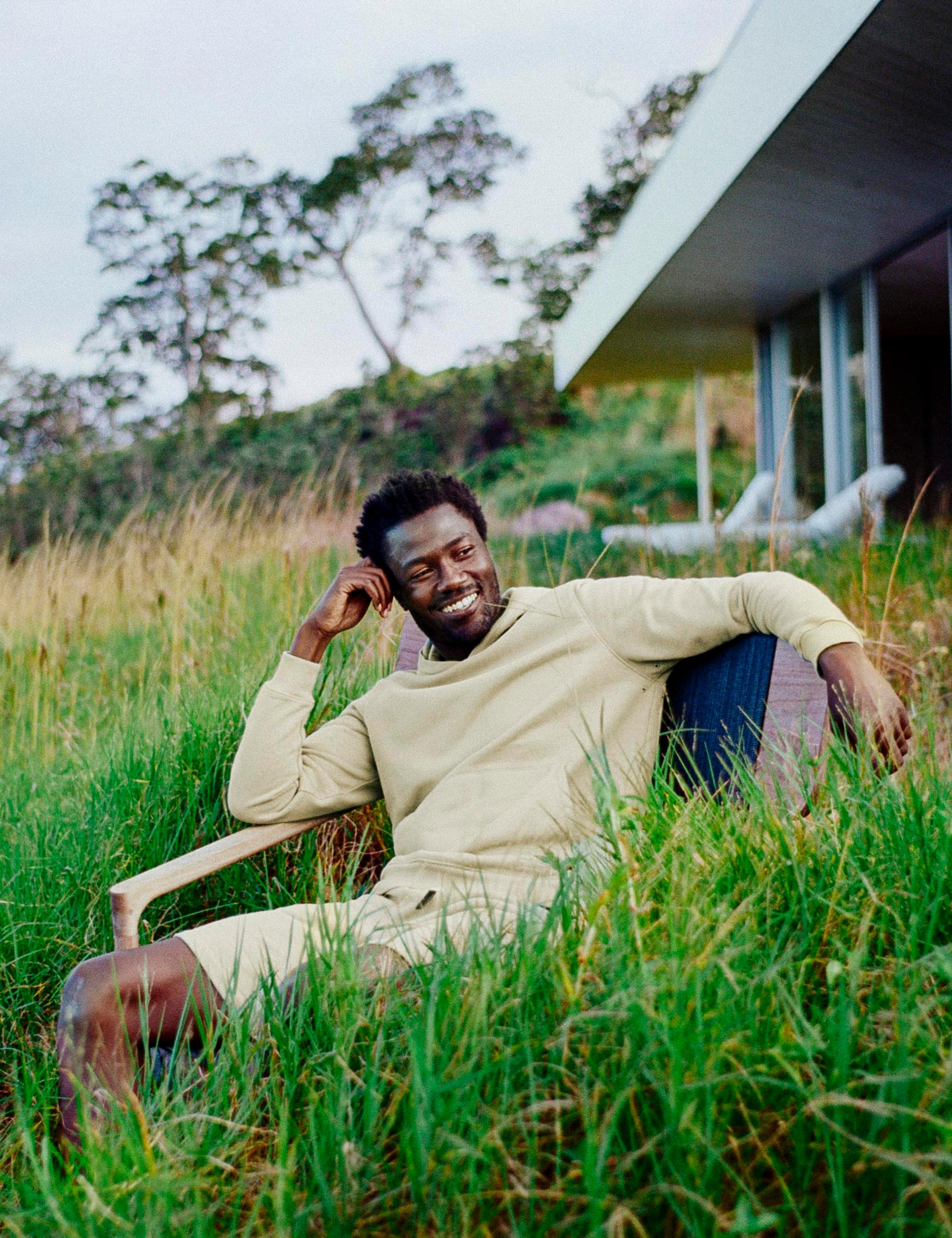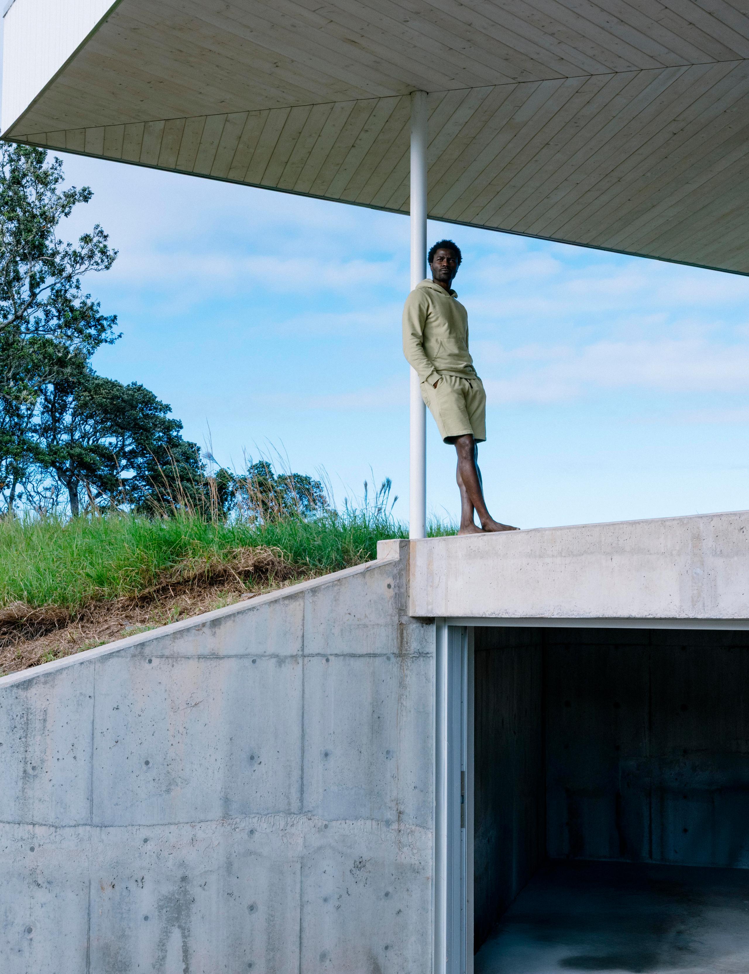 Front full-body view of man wearing Osa Pullover Hoodie in Bone white from AETHER Apparel.