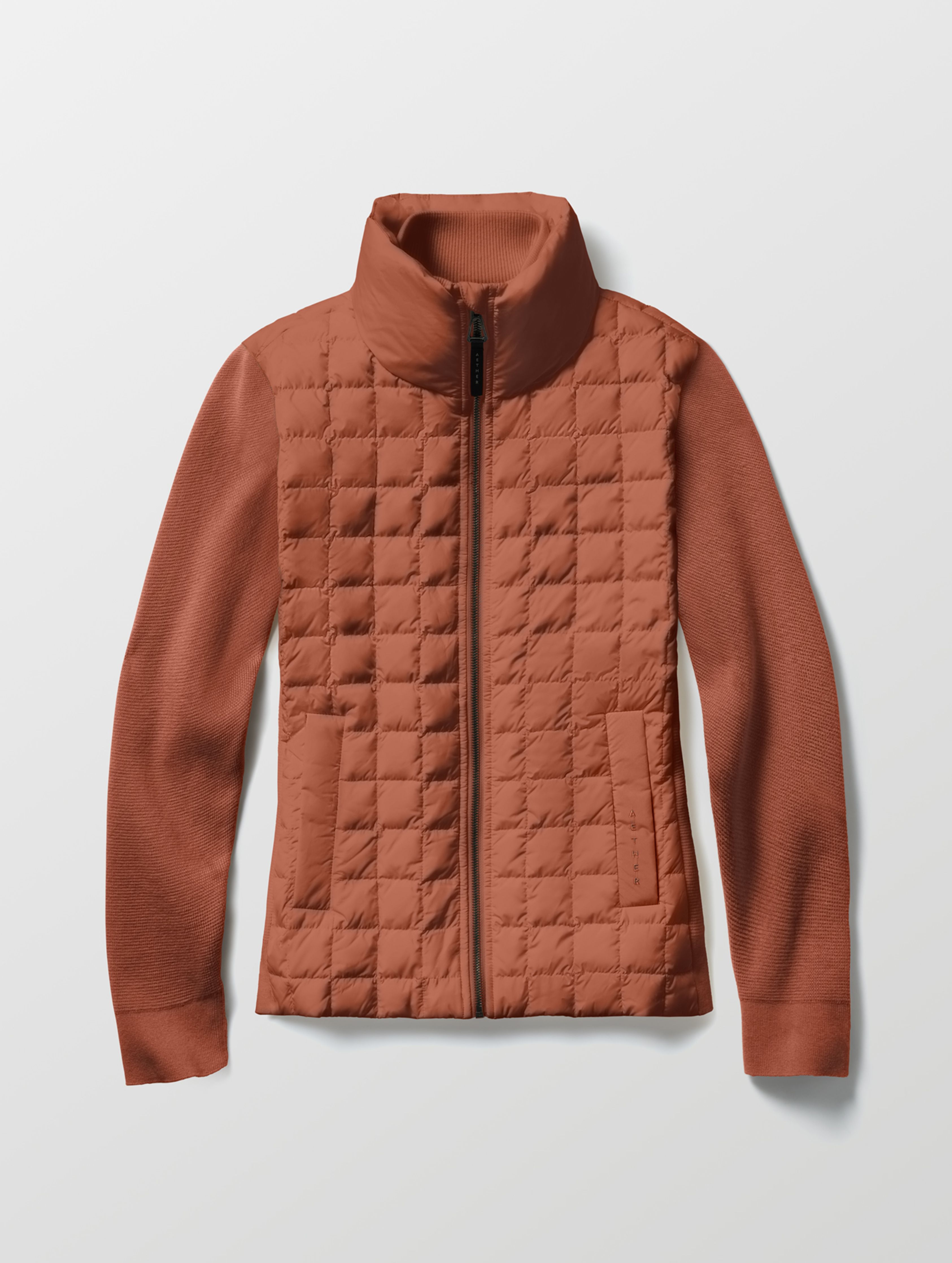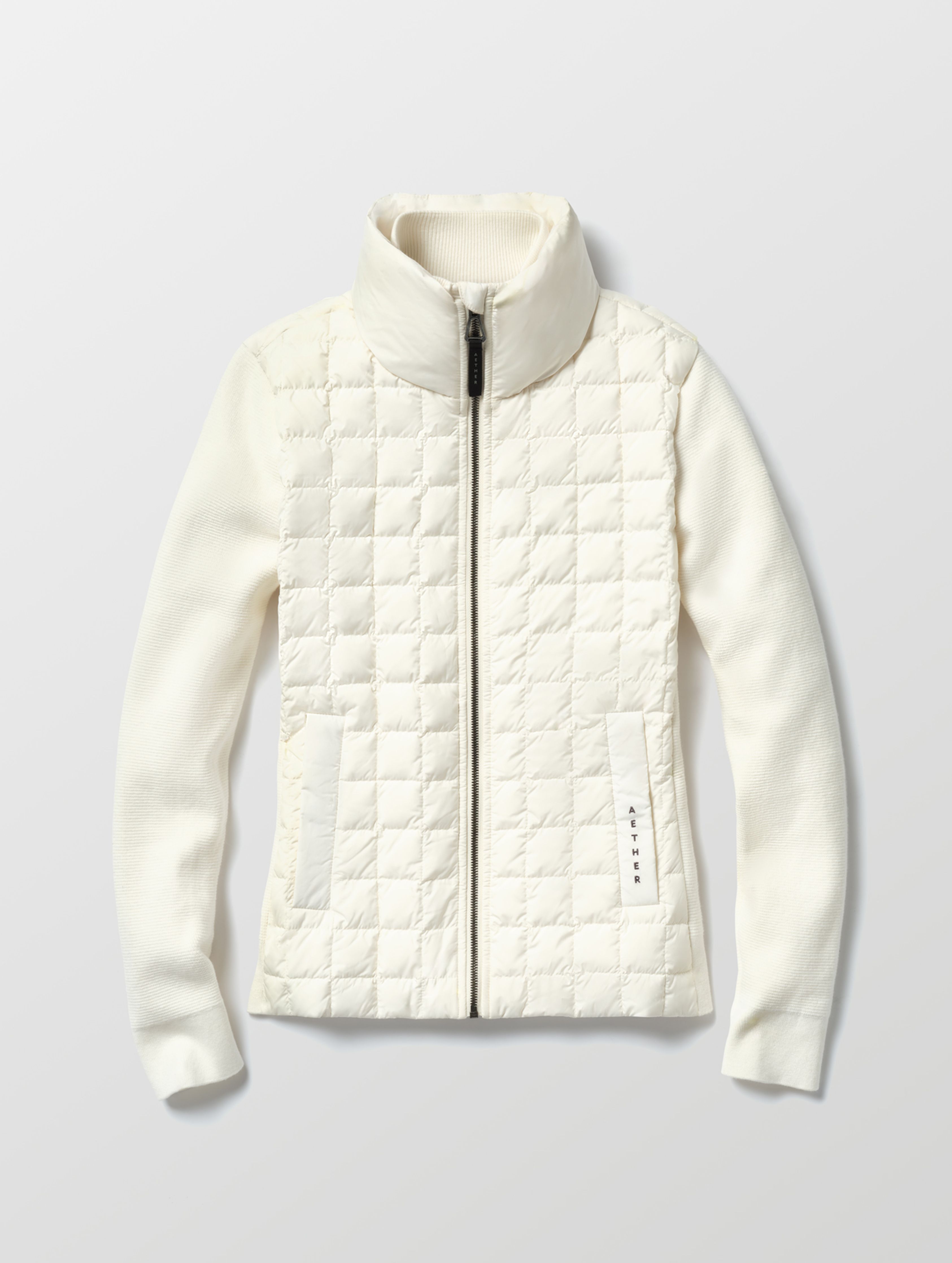 The Phase Full-Zip features 800-fill-power goose-down, box-quilted insulation at the body and exterior collar.