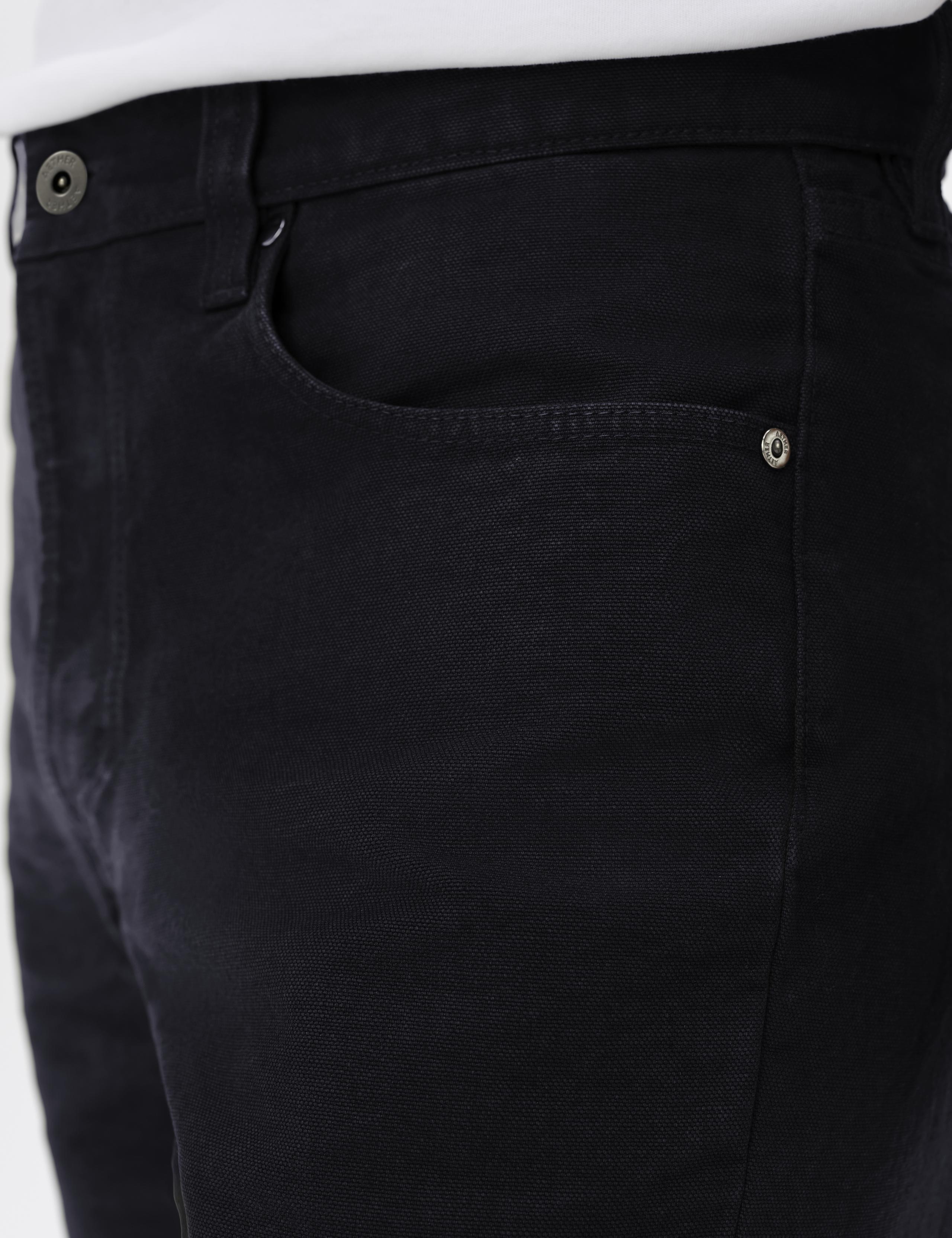Closeup detailed view of the custom AETHER-branded rivets and shank button closure on the Porter 5-Pocket Pant in Onyx Black from AETHER Apparel.