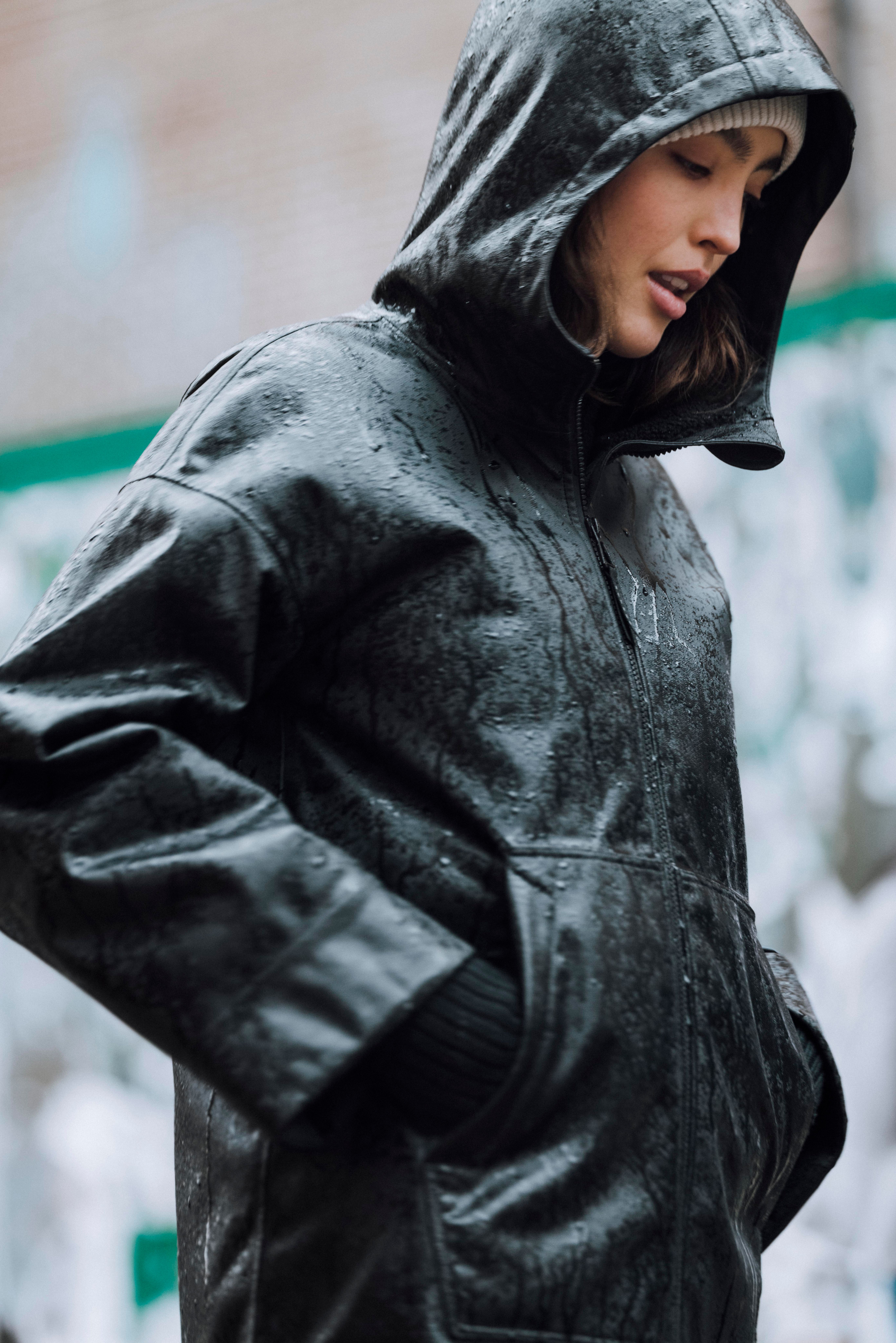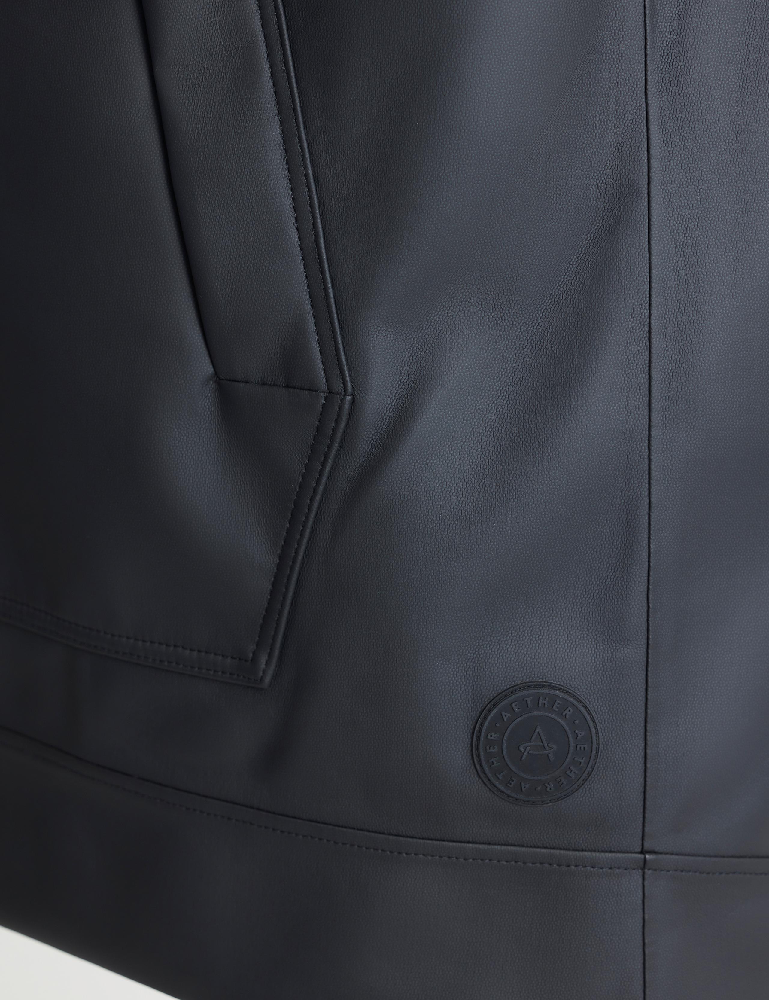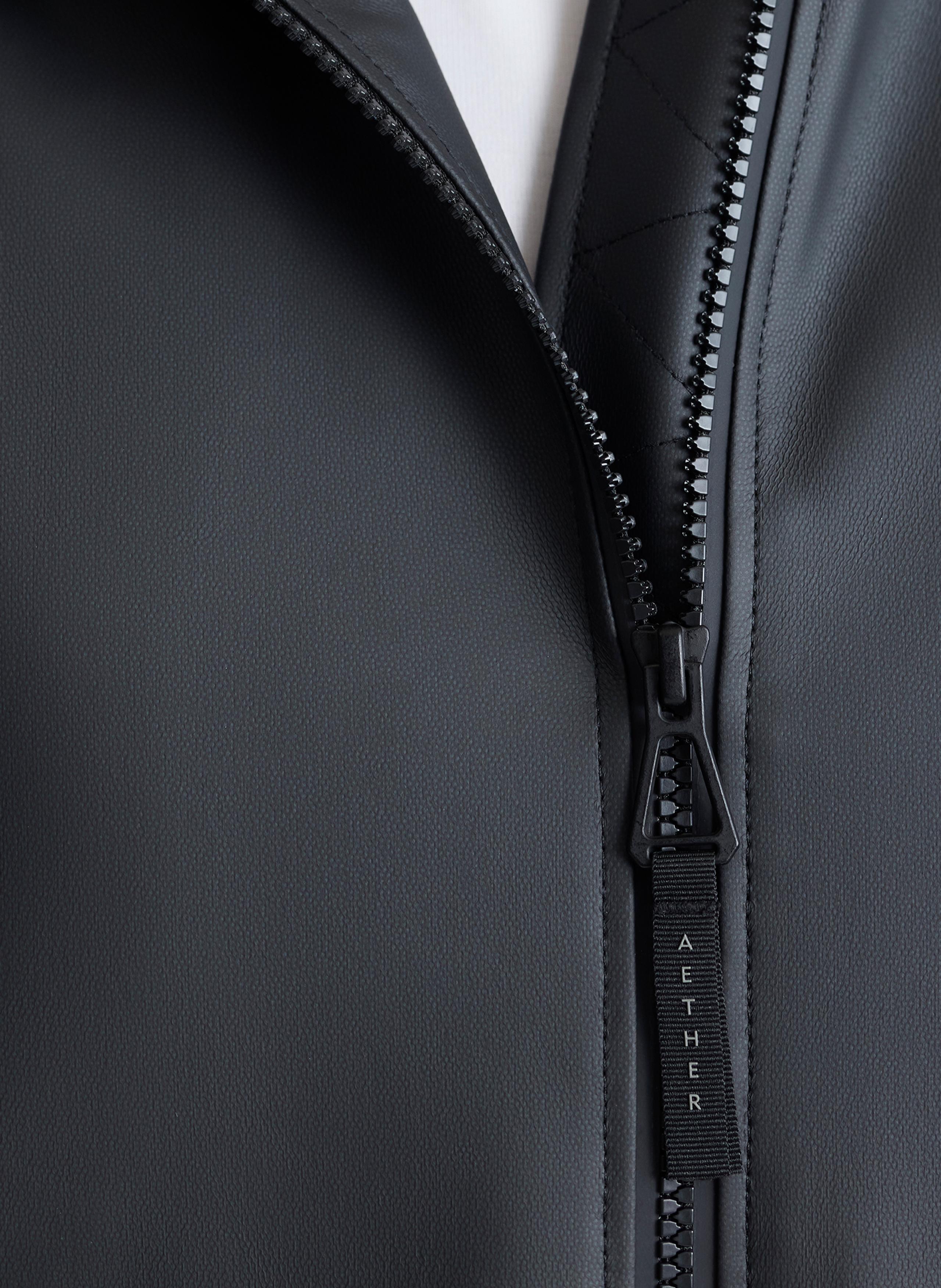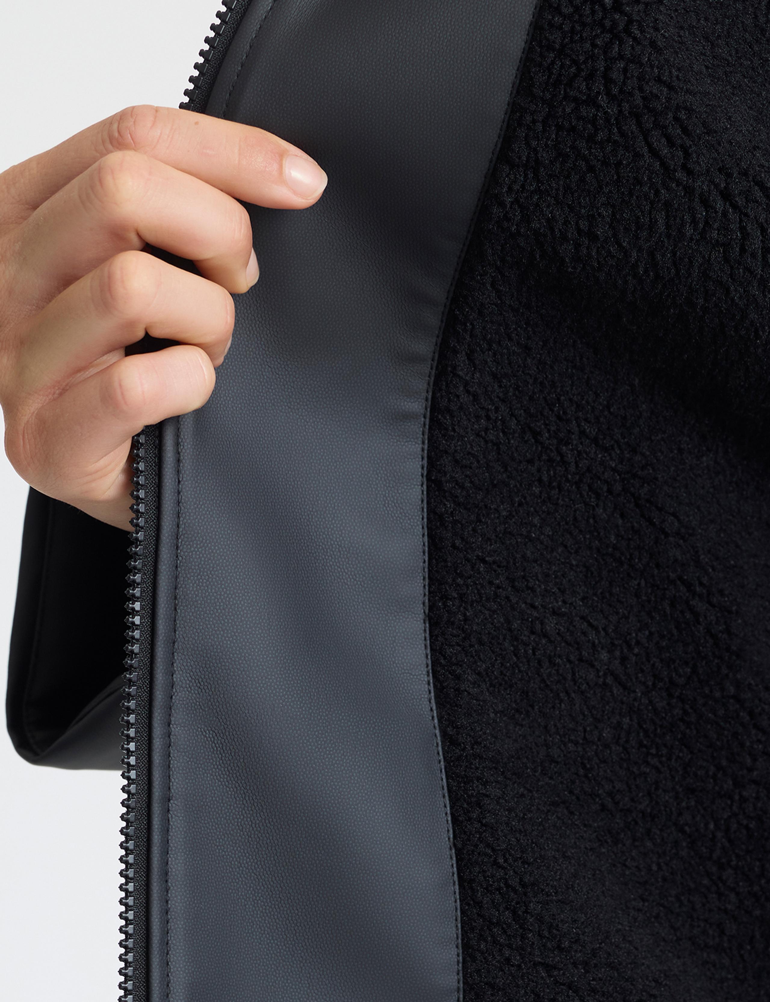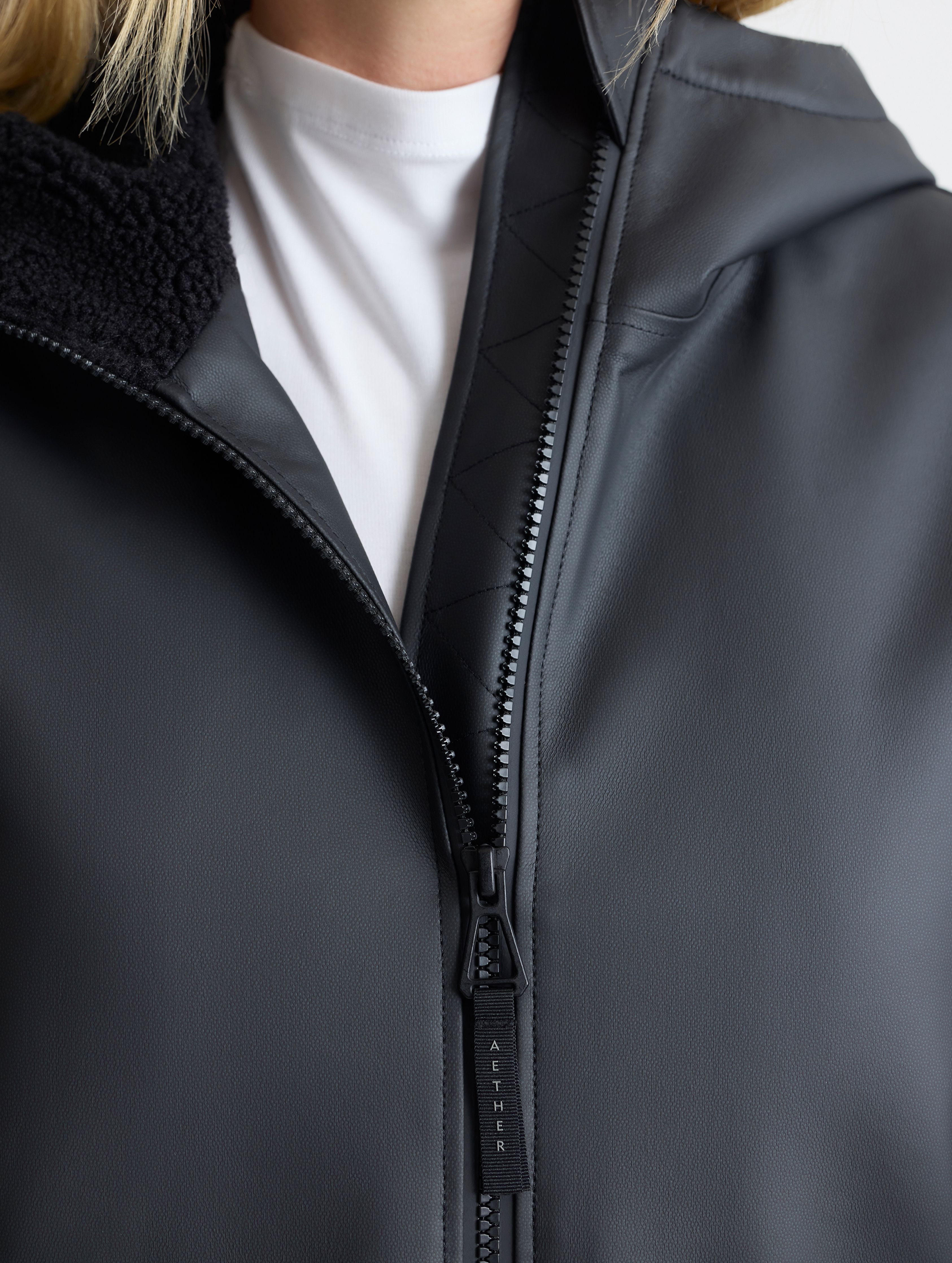 Fitted with a #5 AquaGuard® VISLON® zipper with a bespoke AETHER-branded grosgrain pull tab at its center front, the main body of the jacket also comes mated to a brimmed three-piece hood. The sherpa fabric lining the body also adorns the inside of the hood.