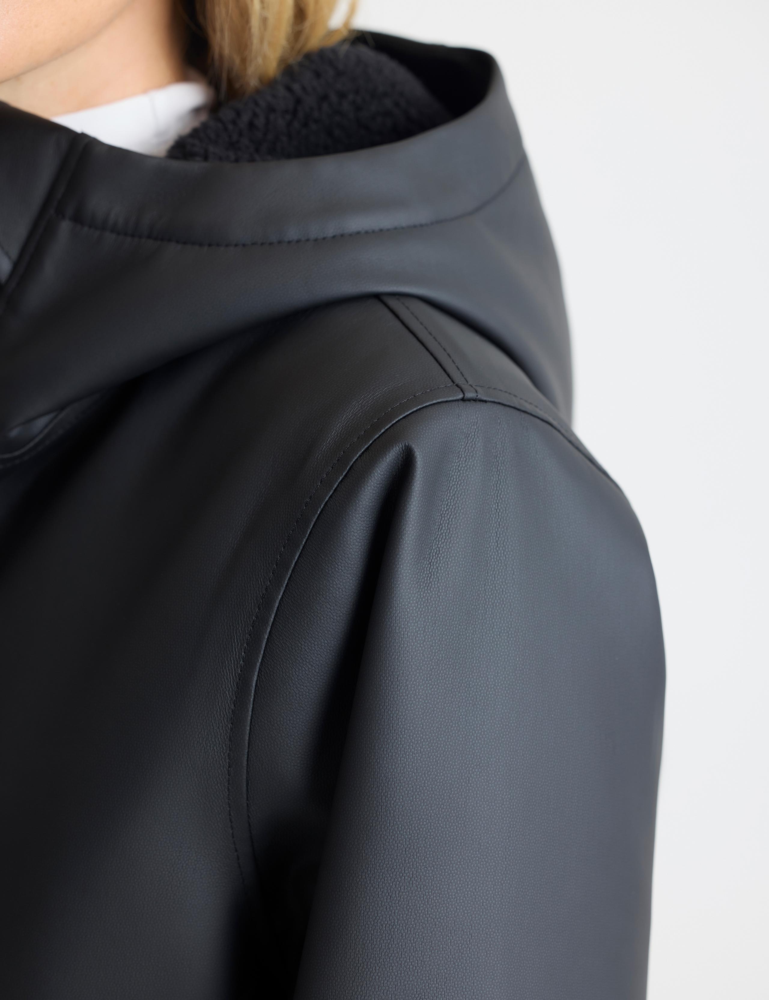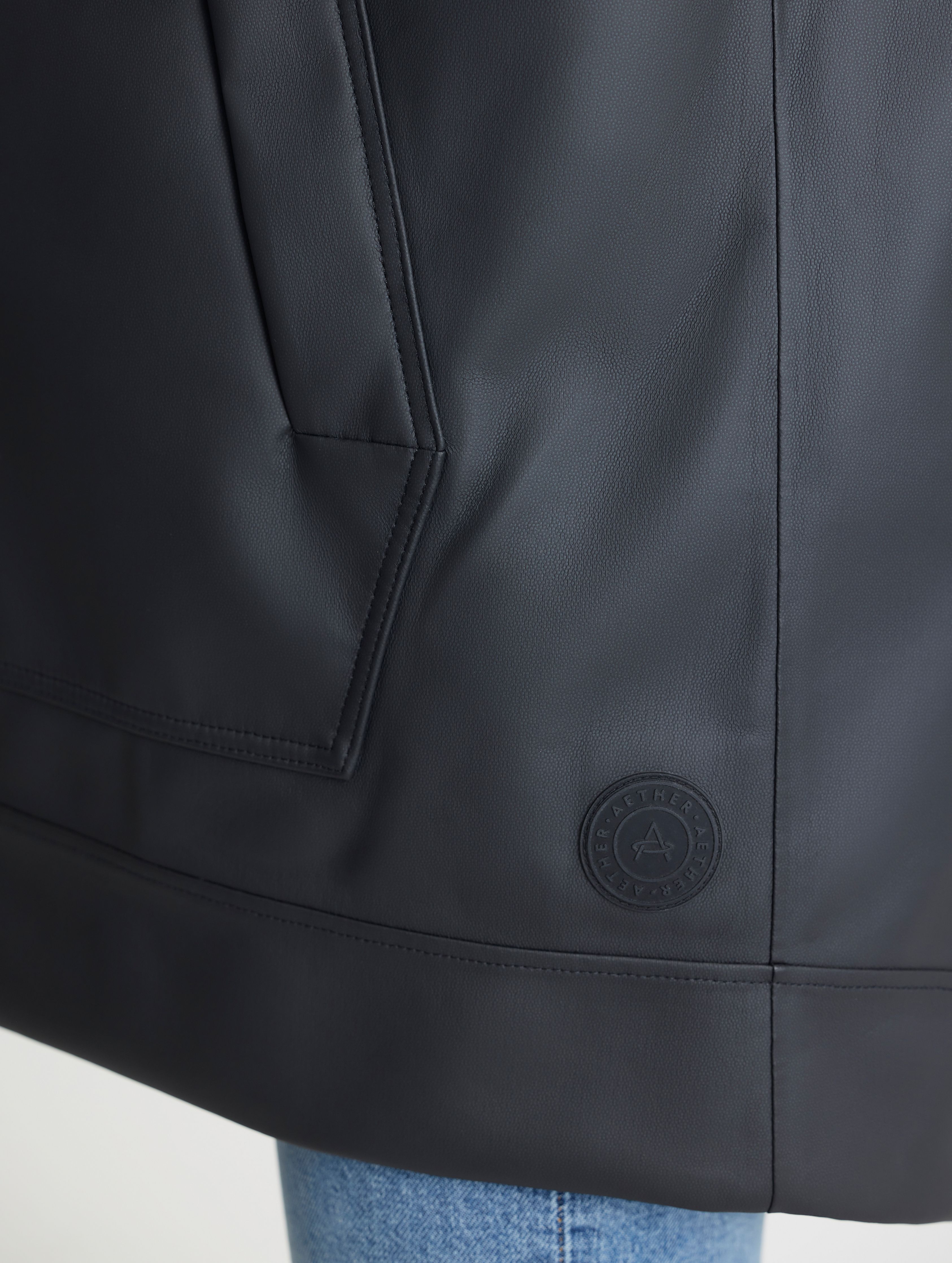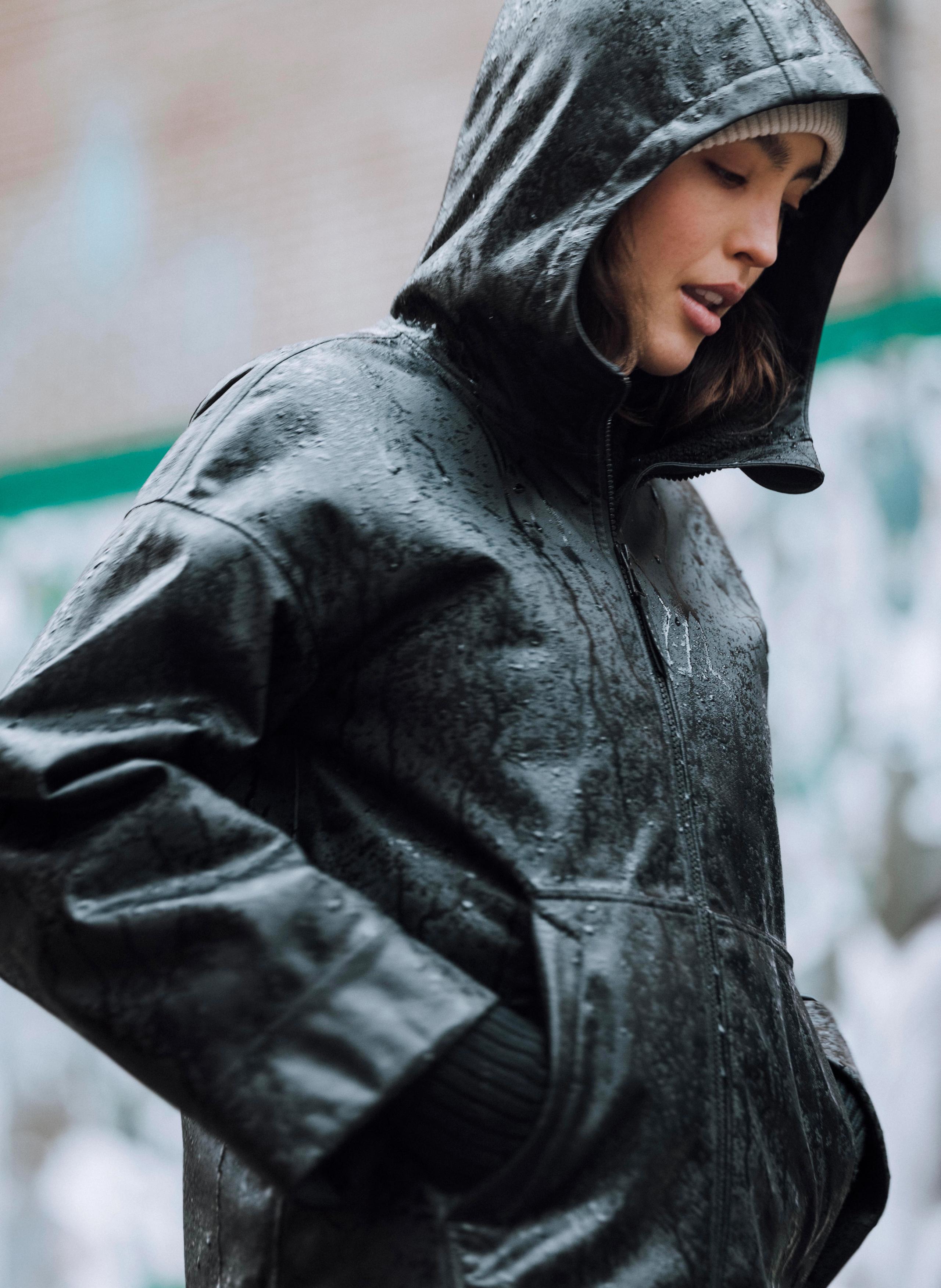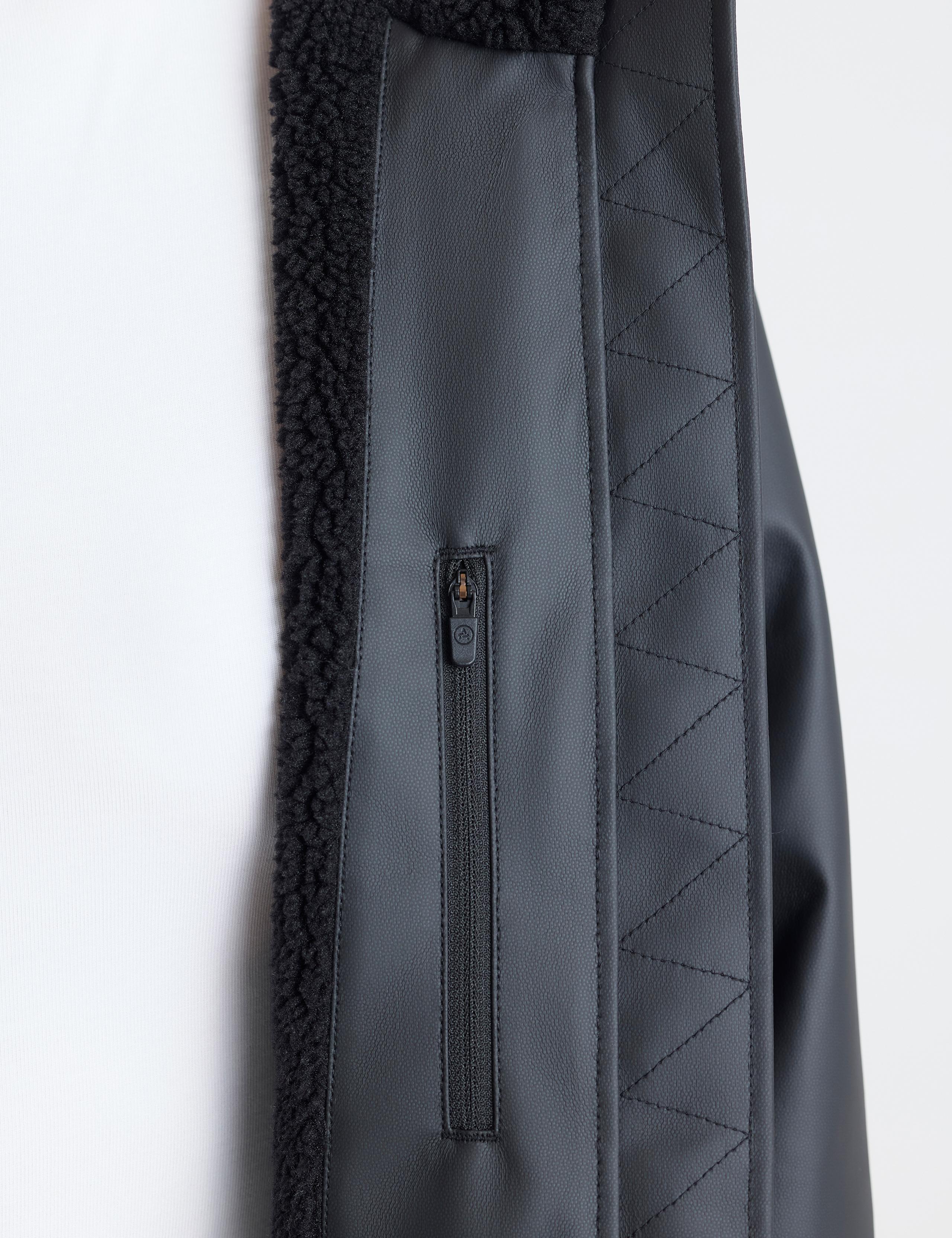 Fitted with a #5 AquaGuard® VISLON® zipper with a bespoke AETHER-branded grosgrain pull tab at its center front, the main body of the jacket also comes mated to a brimmed three-piece hood. The sherpa fabric lining the body also adorns the inside of the hood.