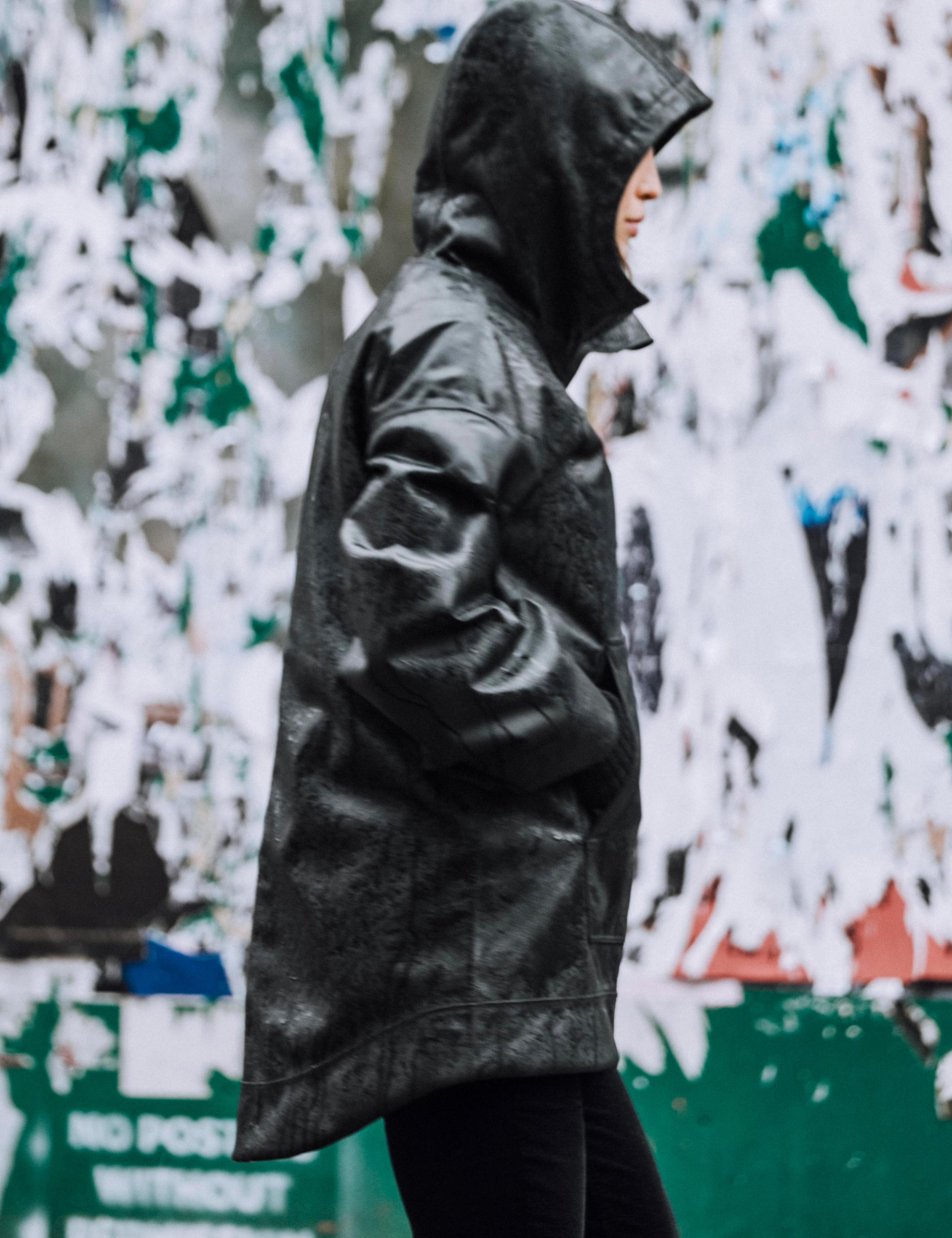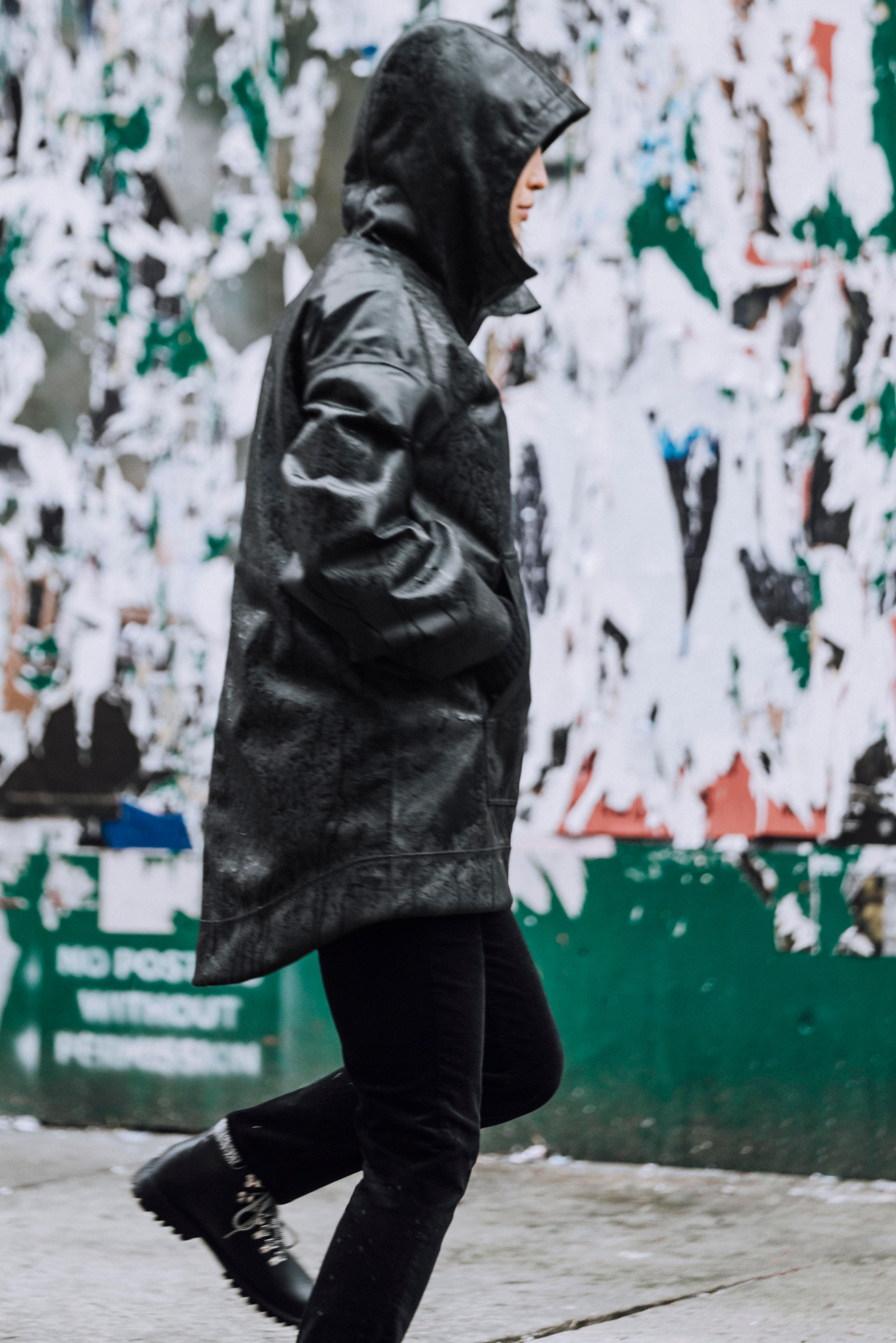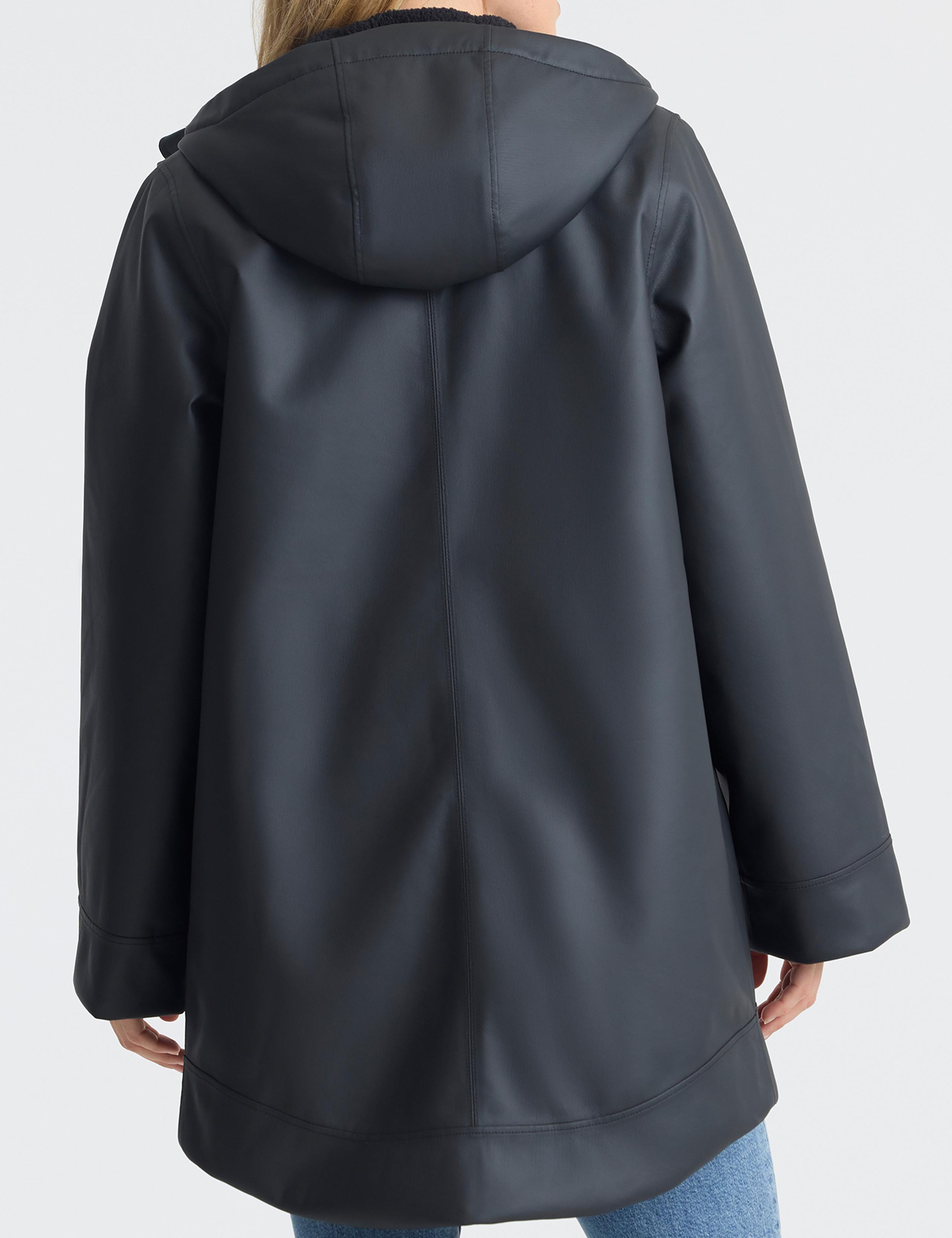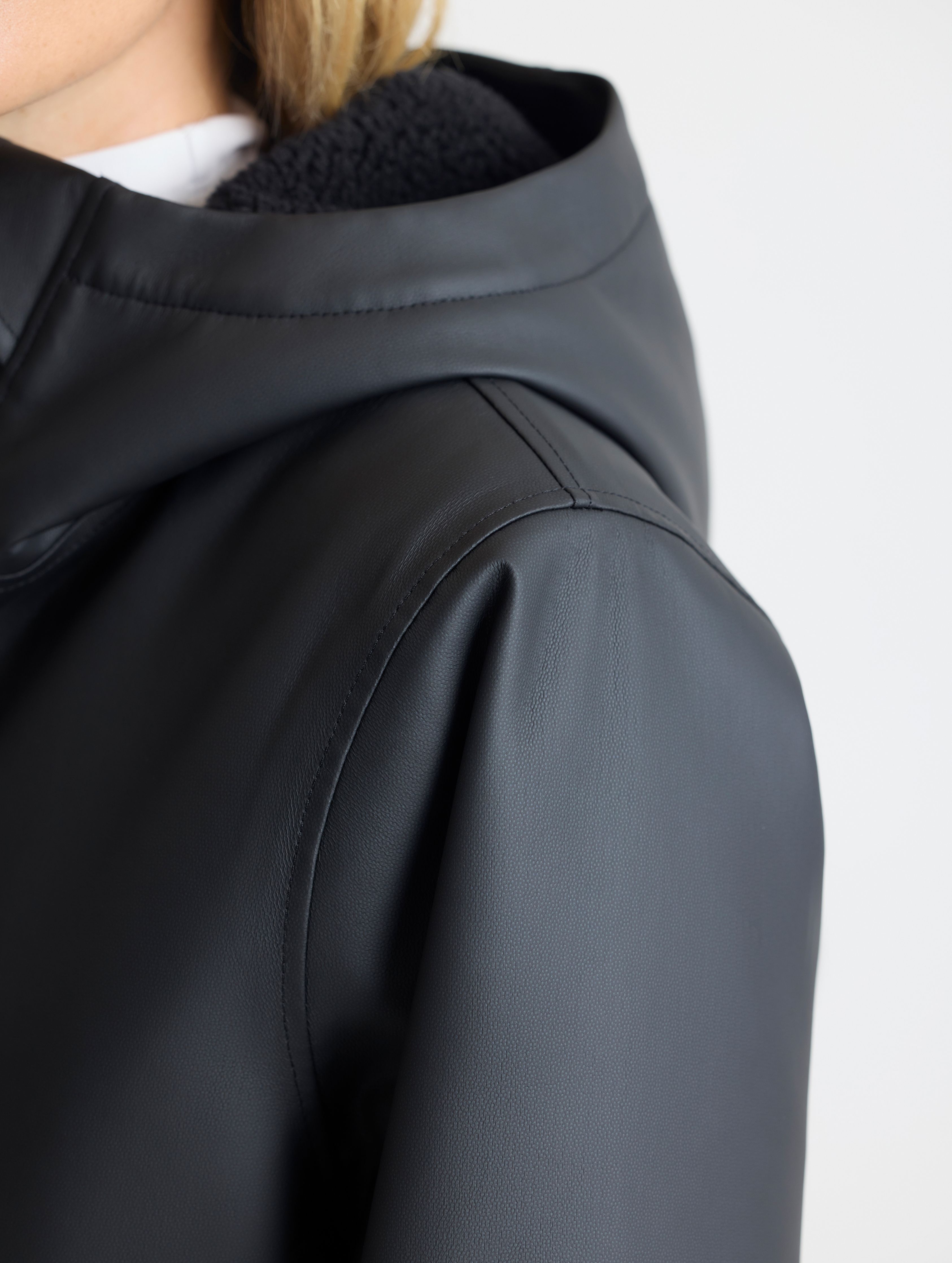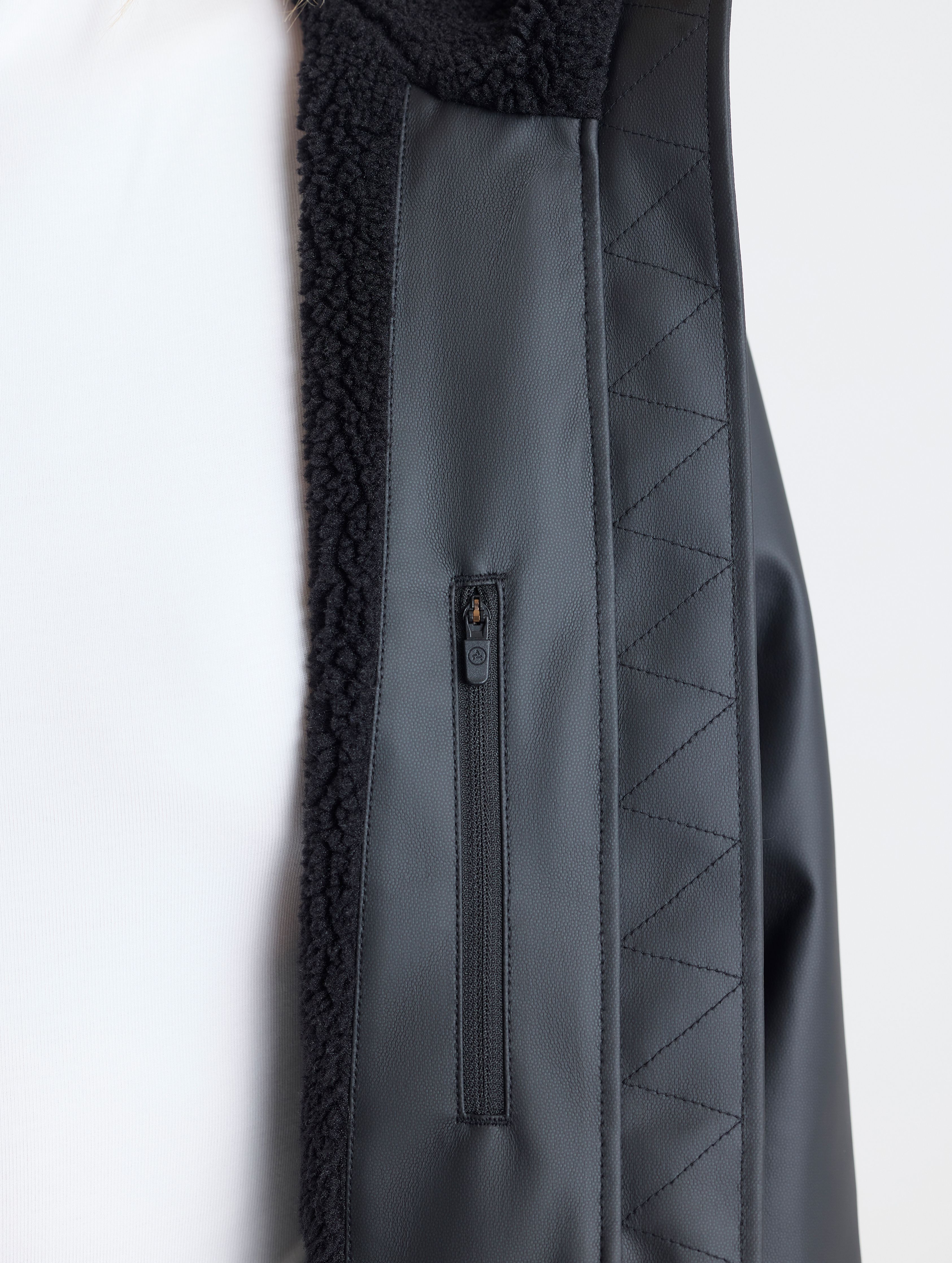 Fitted with a #5 AquaGuard® VISLON® zipper with a bespoke AETHER-branded grosgrain pull tab at its center front, the main body of the jacket also comes mated to a brimmed three-piece hood. The sherpa fabric lining the body also adorns the inside of the hood.