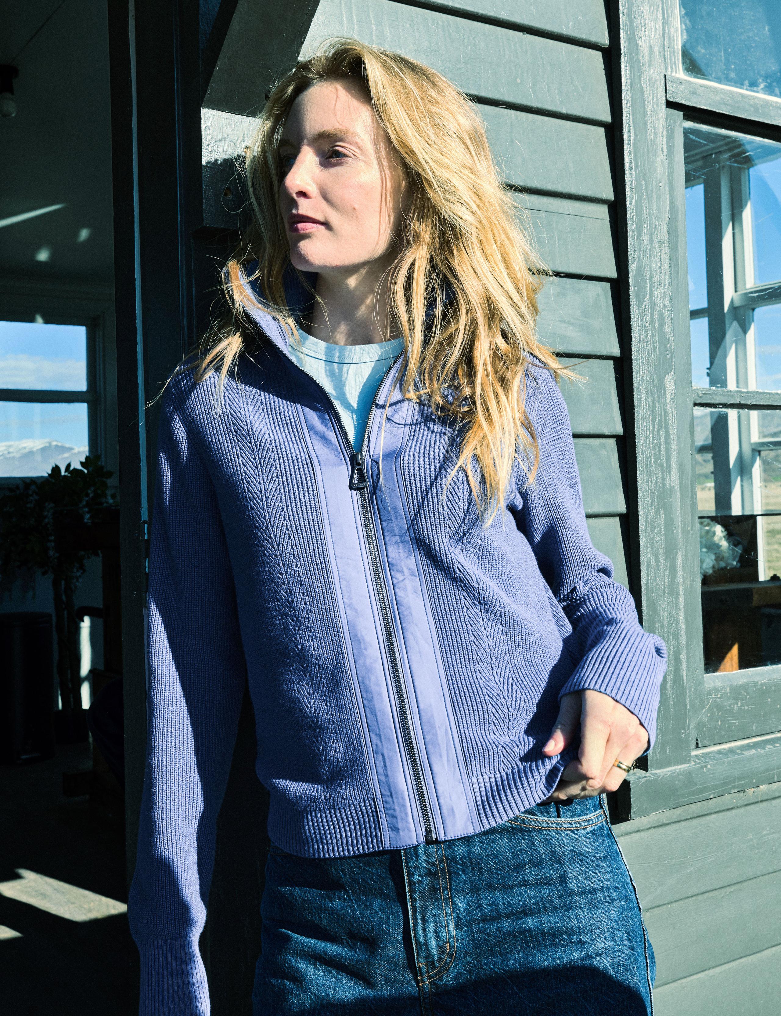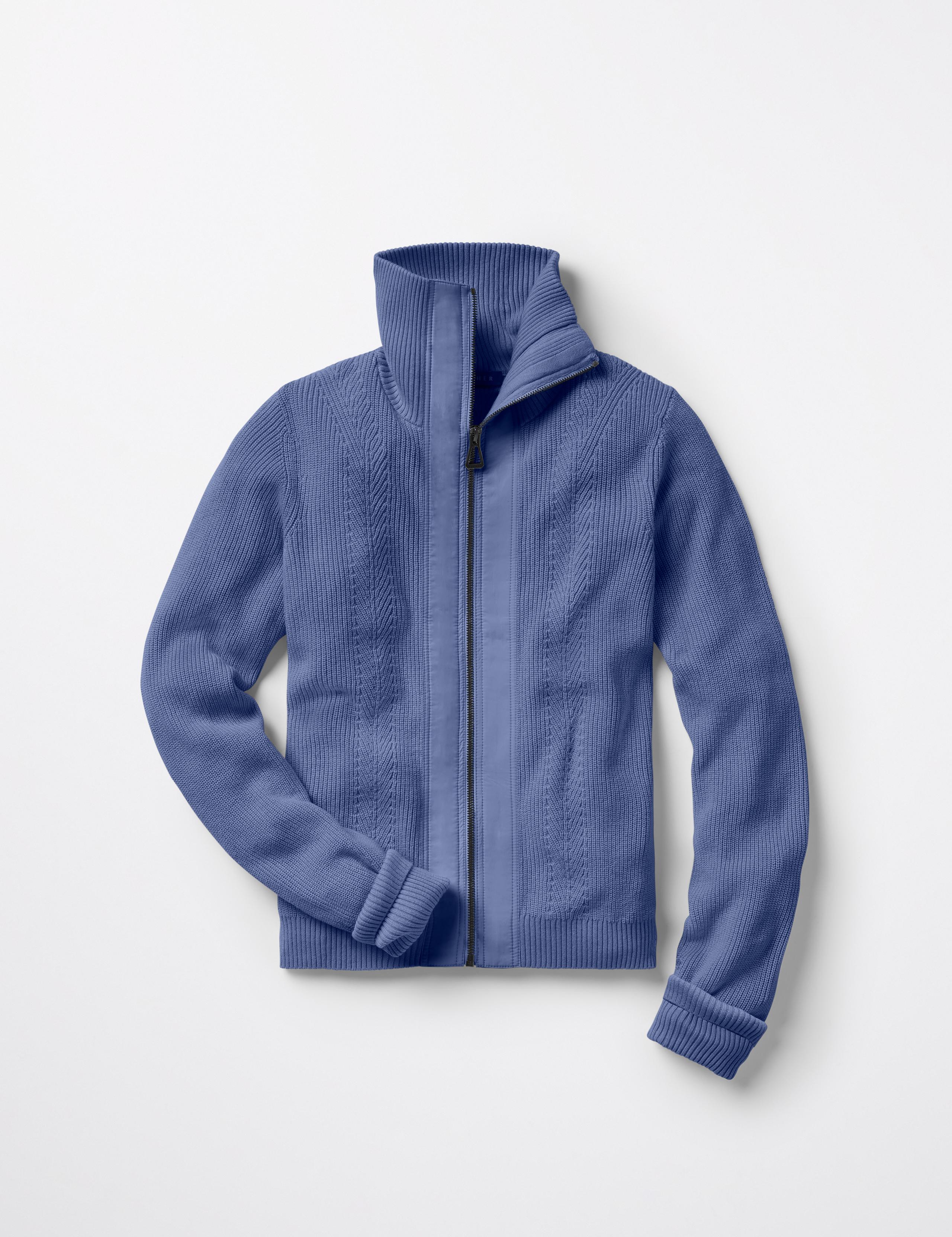Decorative herringbone stitched lines give the Rhea a unique textured look, and the rib knit collar, cuffs and hem will keep you warm into those long summer evenings.