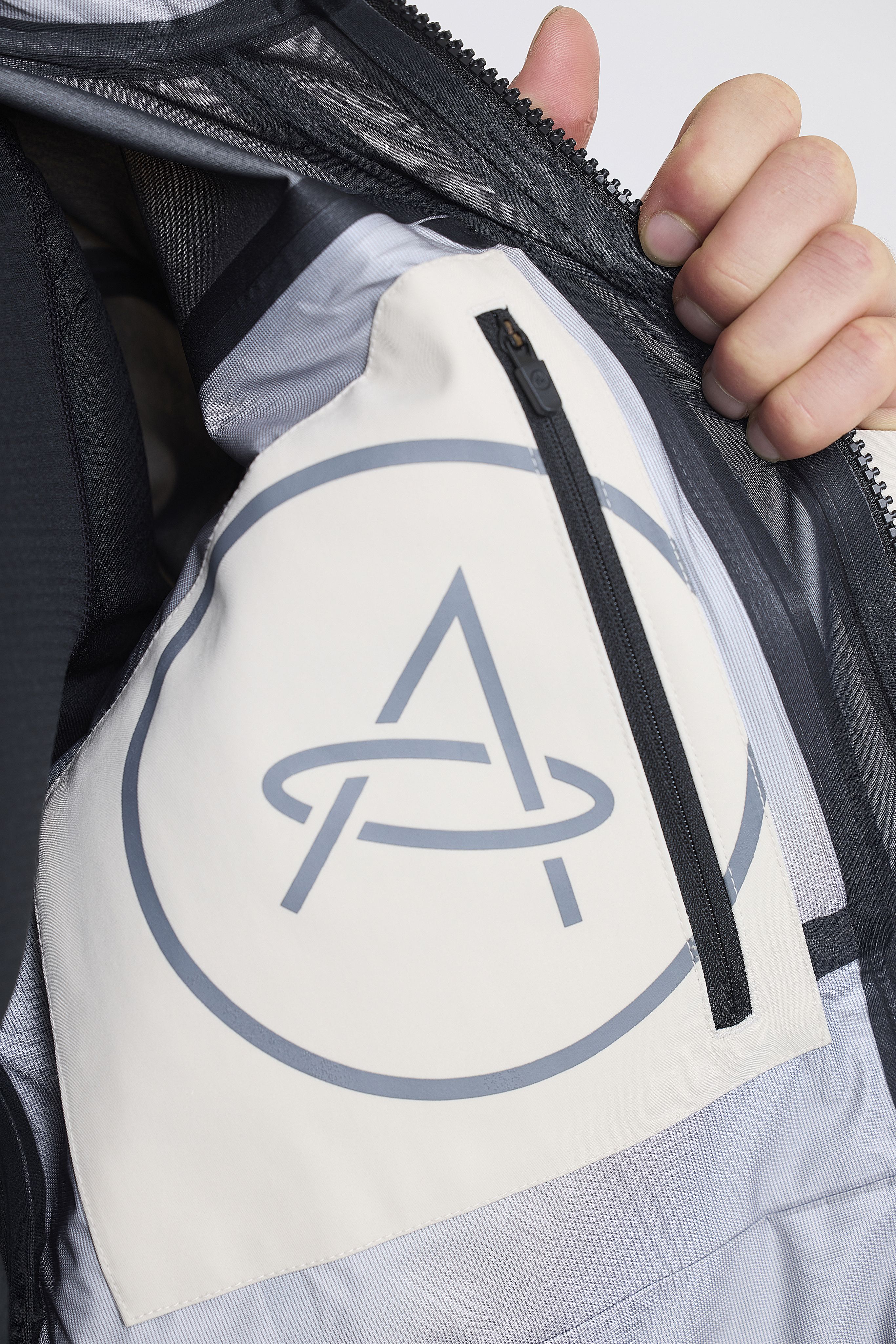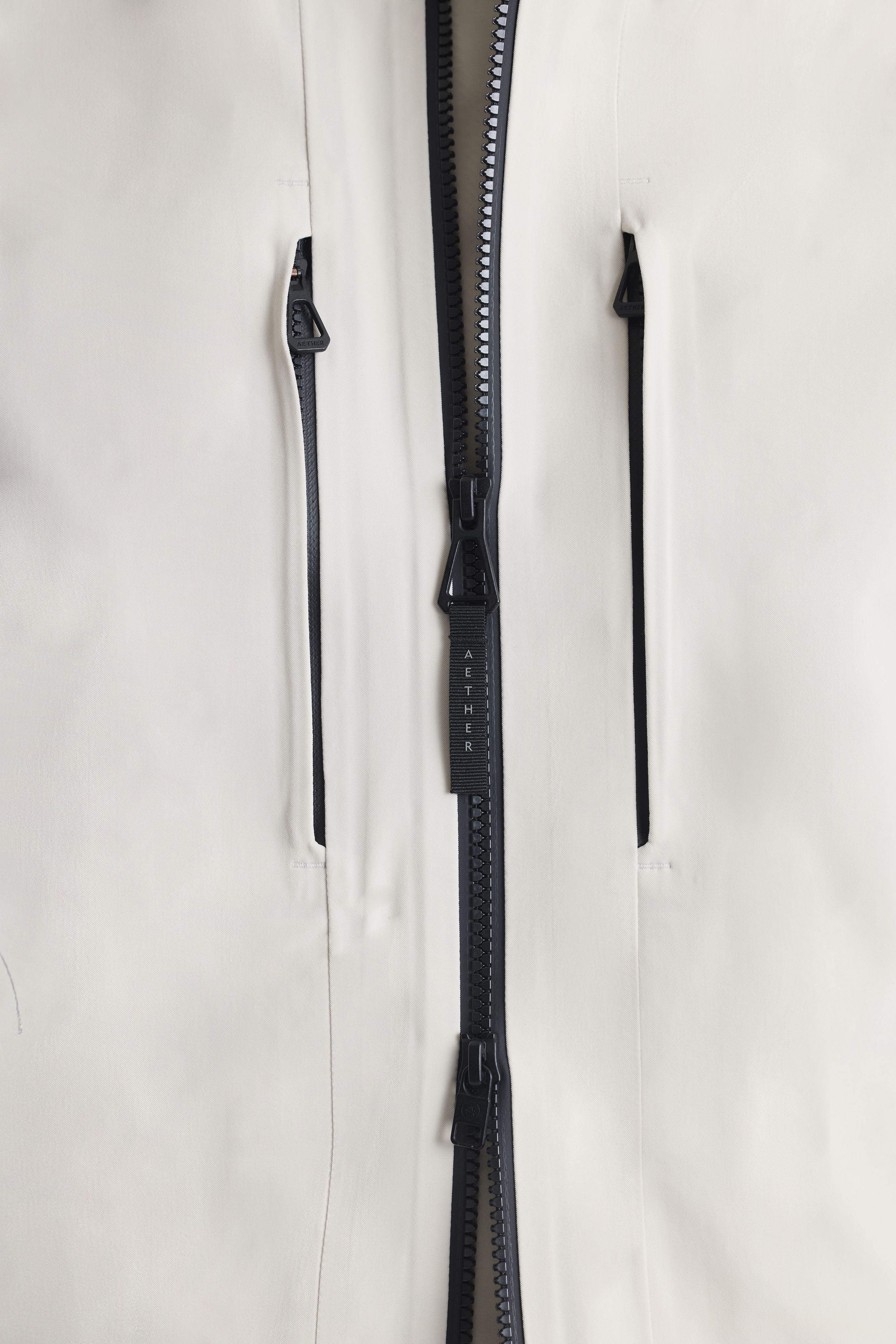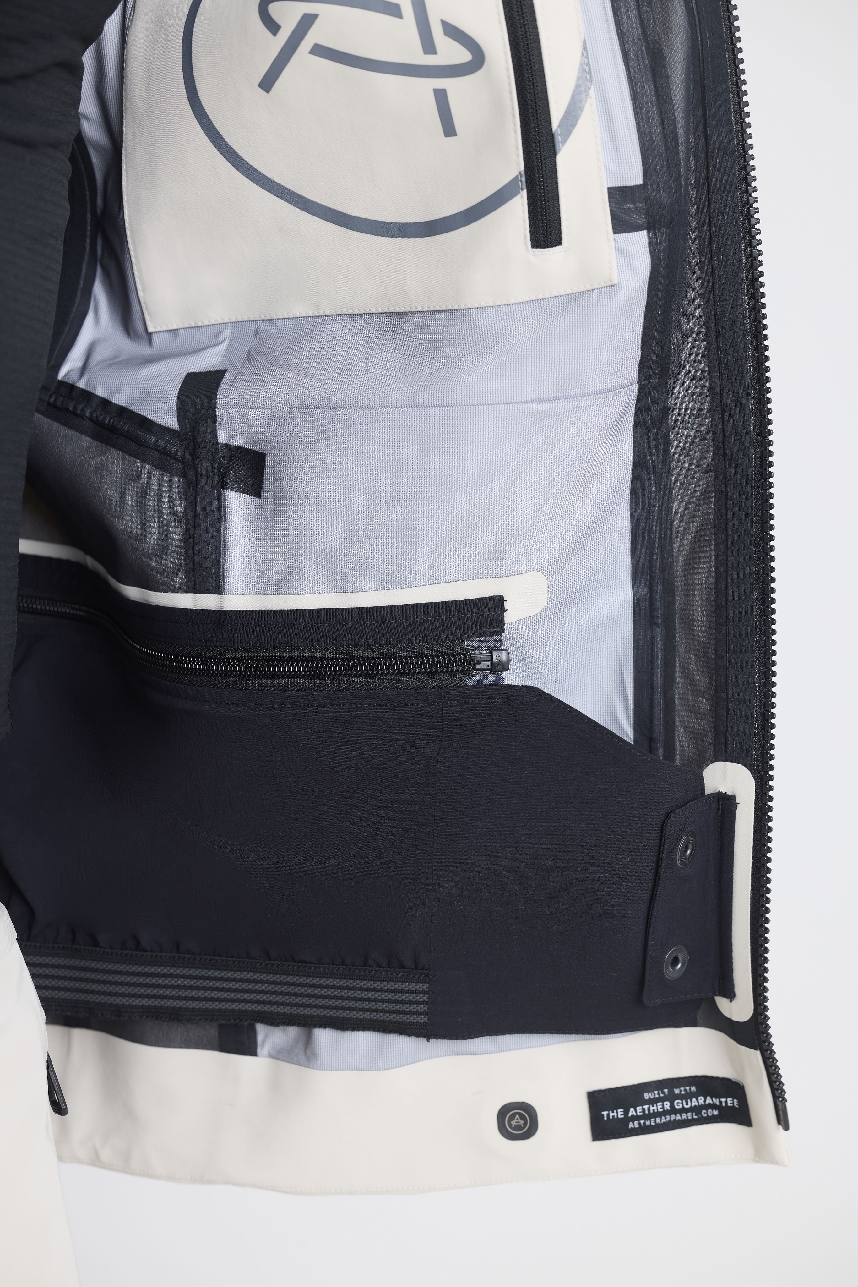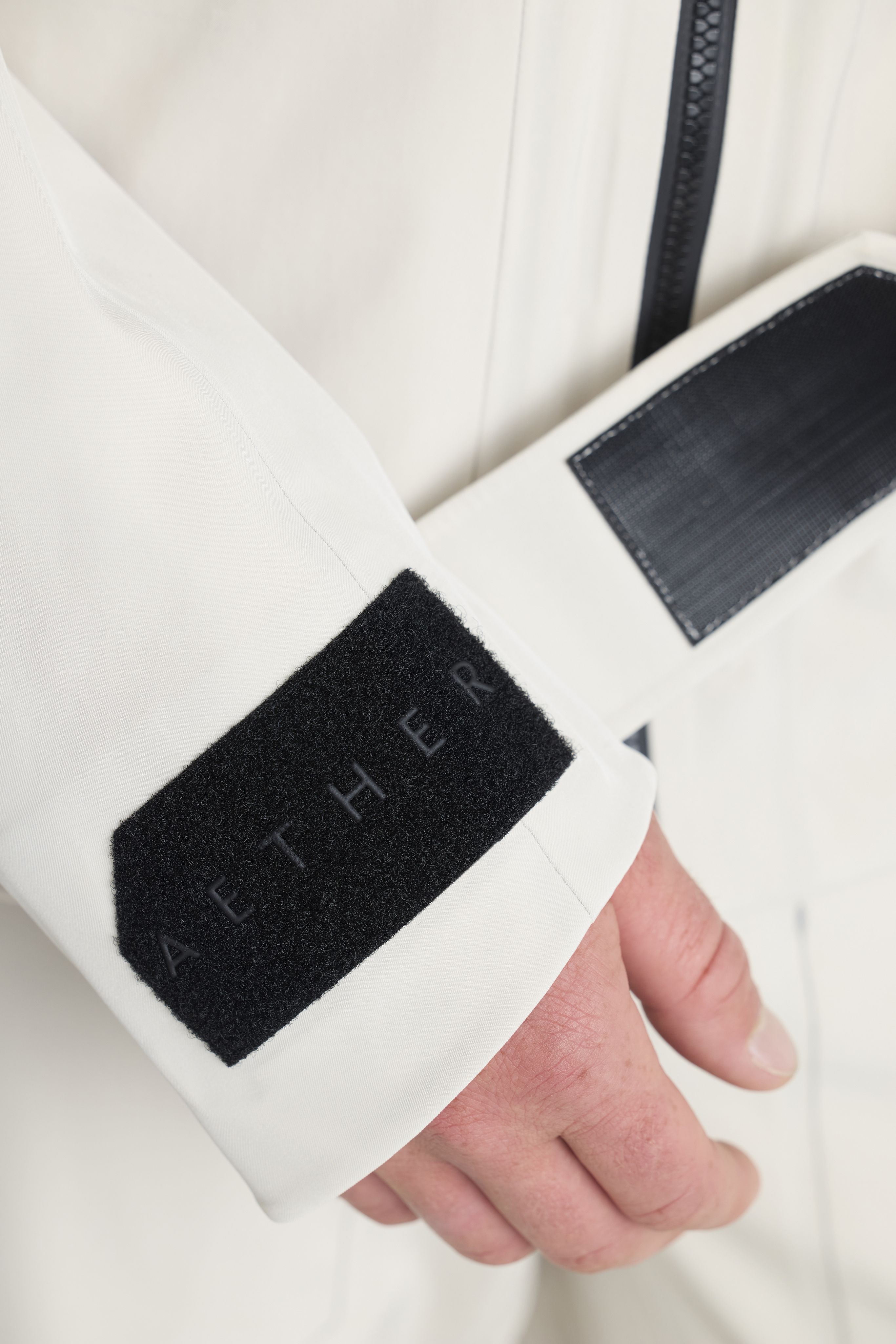 Onboard storage comes in the form of chest pockets, hand pockets, and a sleeve pocket, all of which feature weatherproof #3 AquaGuard® VISLON® zippers with custom pulls. The jacket’s interior also comes loaded with a second zipper-secured mesh pocket, and an interior zippered chest pocket adorned in a screen-printed AETHER logo.