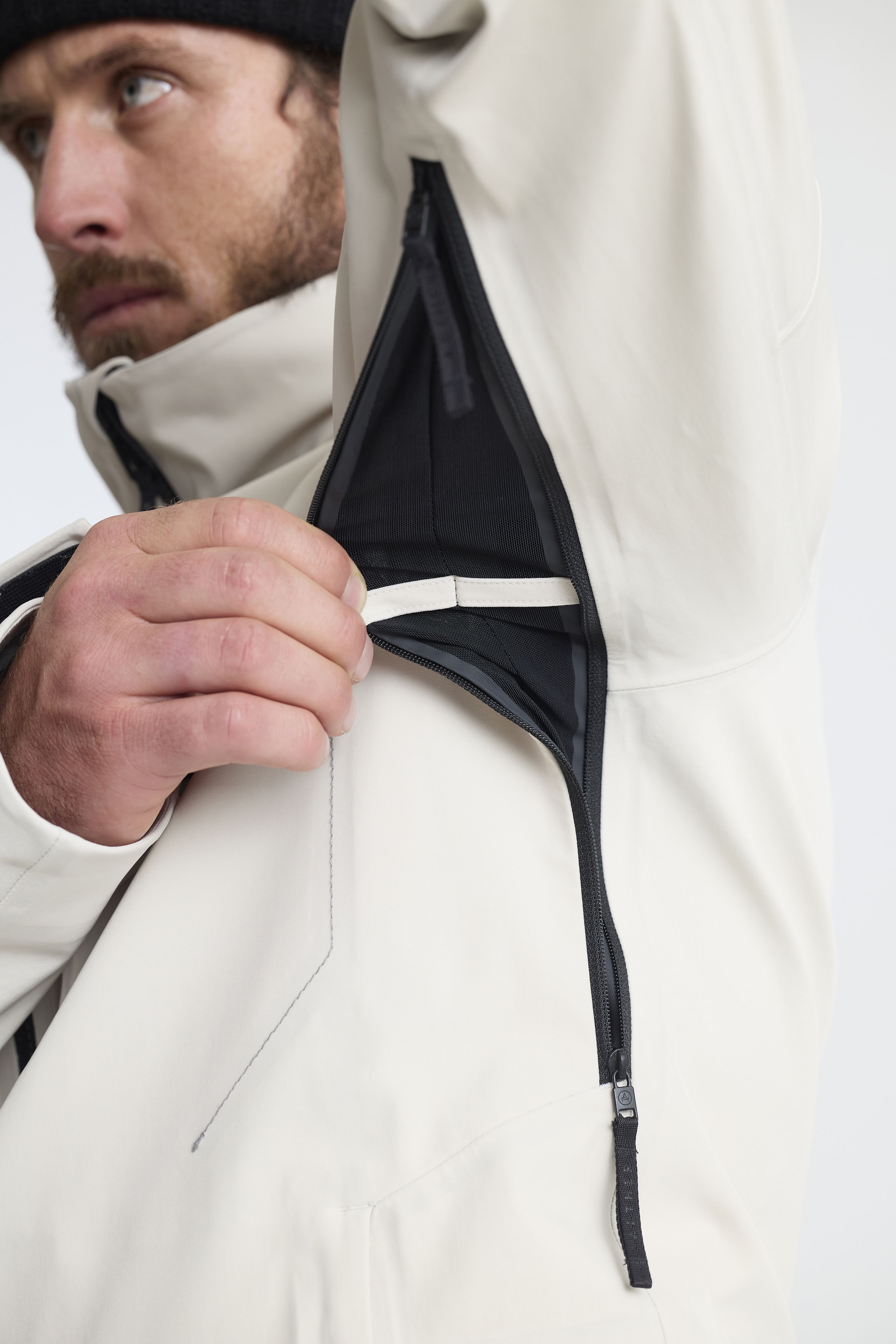 The inside of the jacket features a dedicated mesh goggle lens pocket. The pocket is located against the wearer’s rib cage, enabling the curve of the lens to follow the shape of their torso. The strategic placement of the goggle pocket allows for effortless lens changes as the sun tucks behind the clouds, keeping your optics easily-accessible when you need them, and practically disappearing the rest of the time. This also keeps the lens warm, which is essential as a cold lens and a warm face add up to a fogged-up lens — unlike a warm lens and a warm face which will keep your goggles fog-free. In total, the Ridge Jacket comes armed with eight pockets.