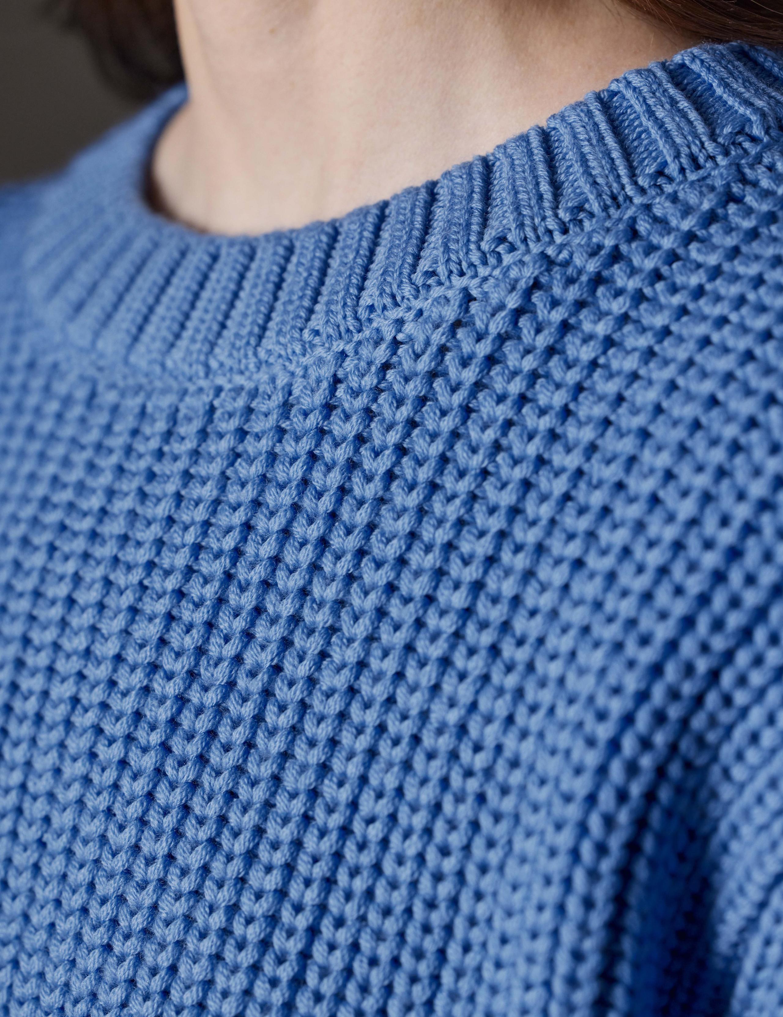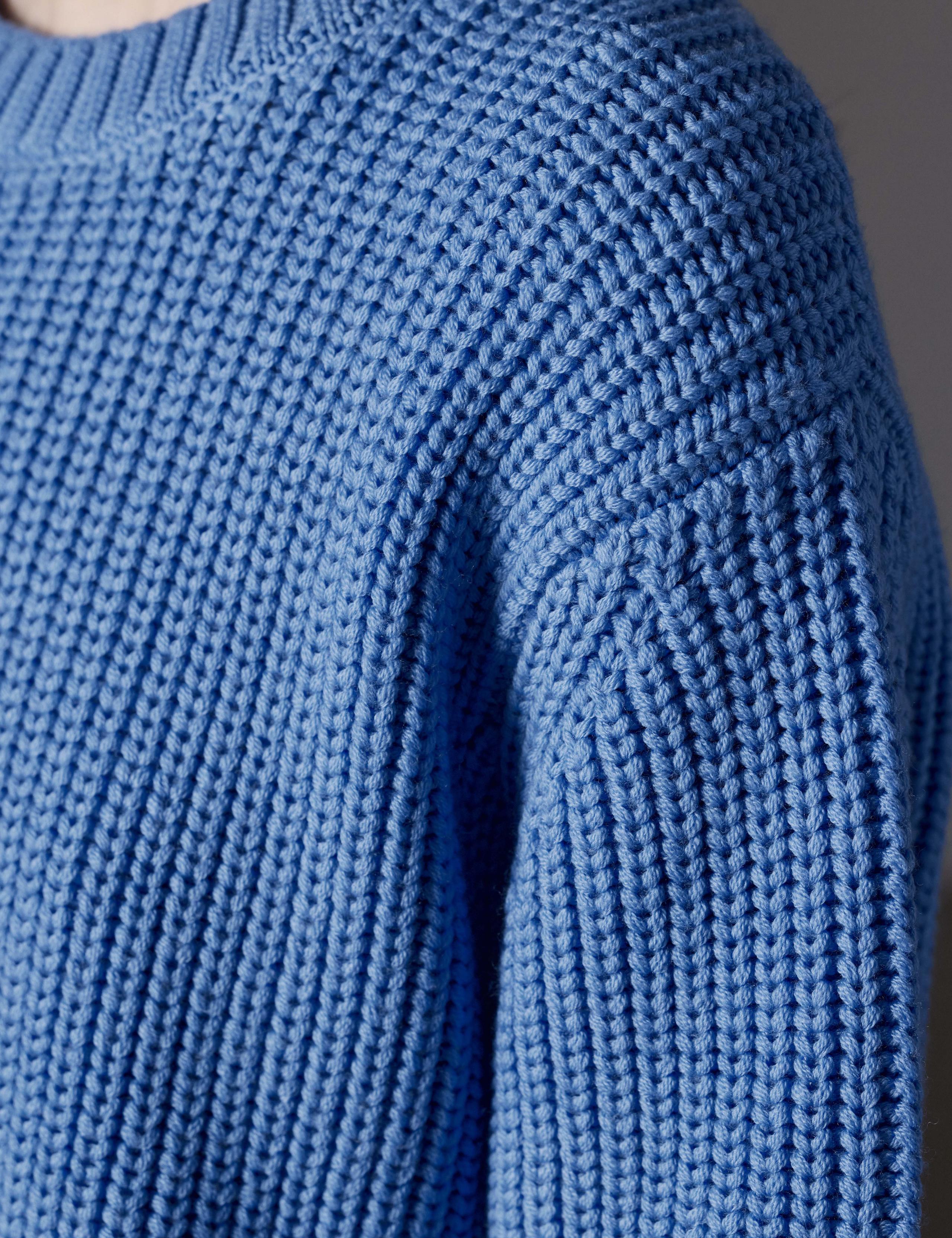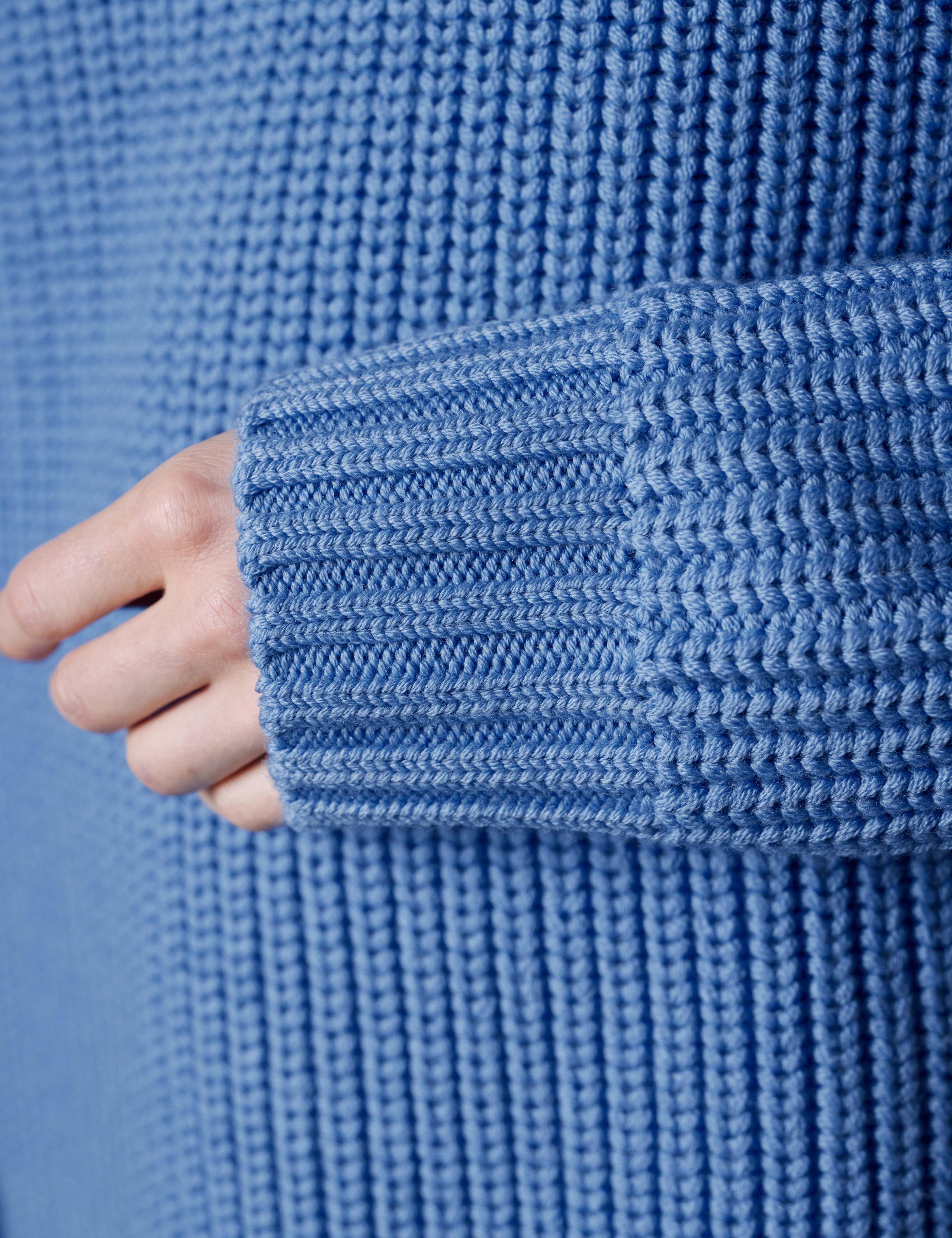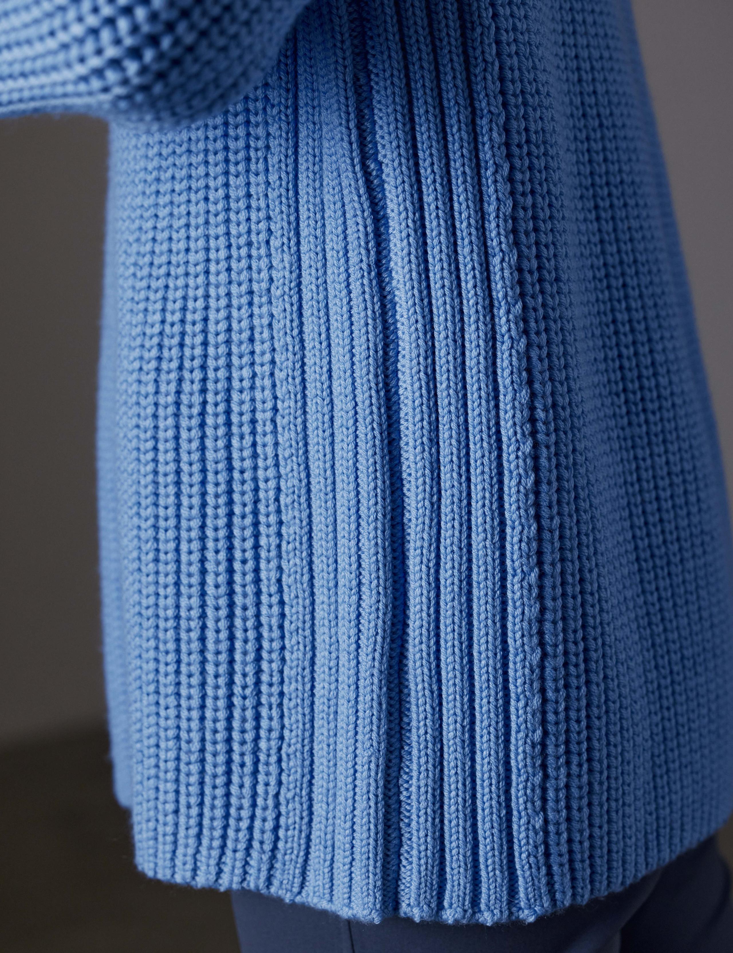 Chunky, half-cardigan stitch at main body and sleeves. 2x2 rib knit at collar, cuffs, and side panels.