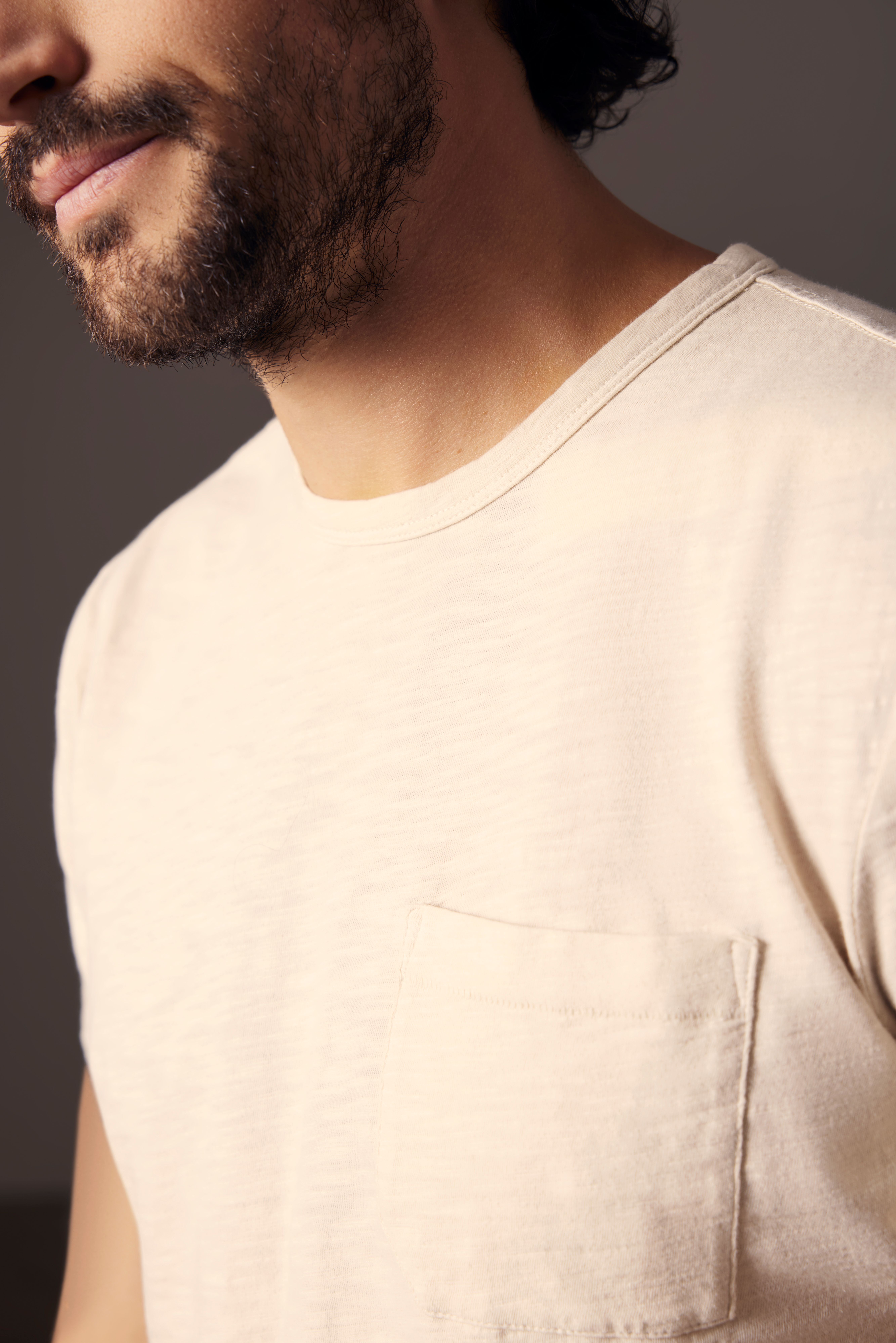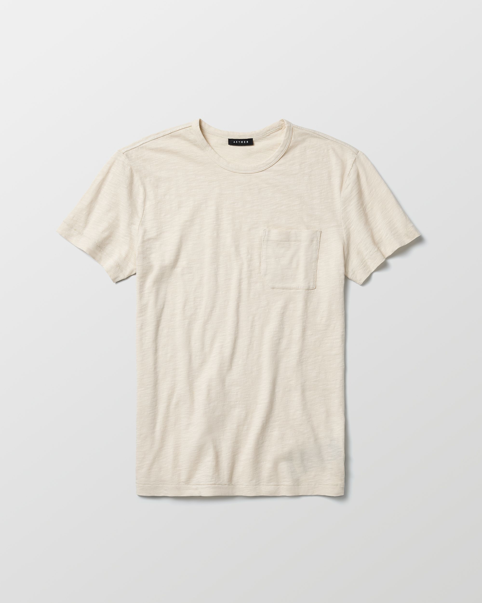 The AETHER Slub Pocket Tee is made from 100% cotton. The slub fabric has a heathered look that elevates it from a standard tee. Comfortable and lightweight, perfect for spring and summer wear.