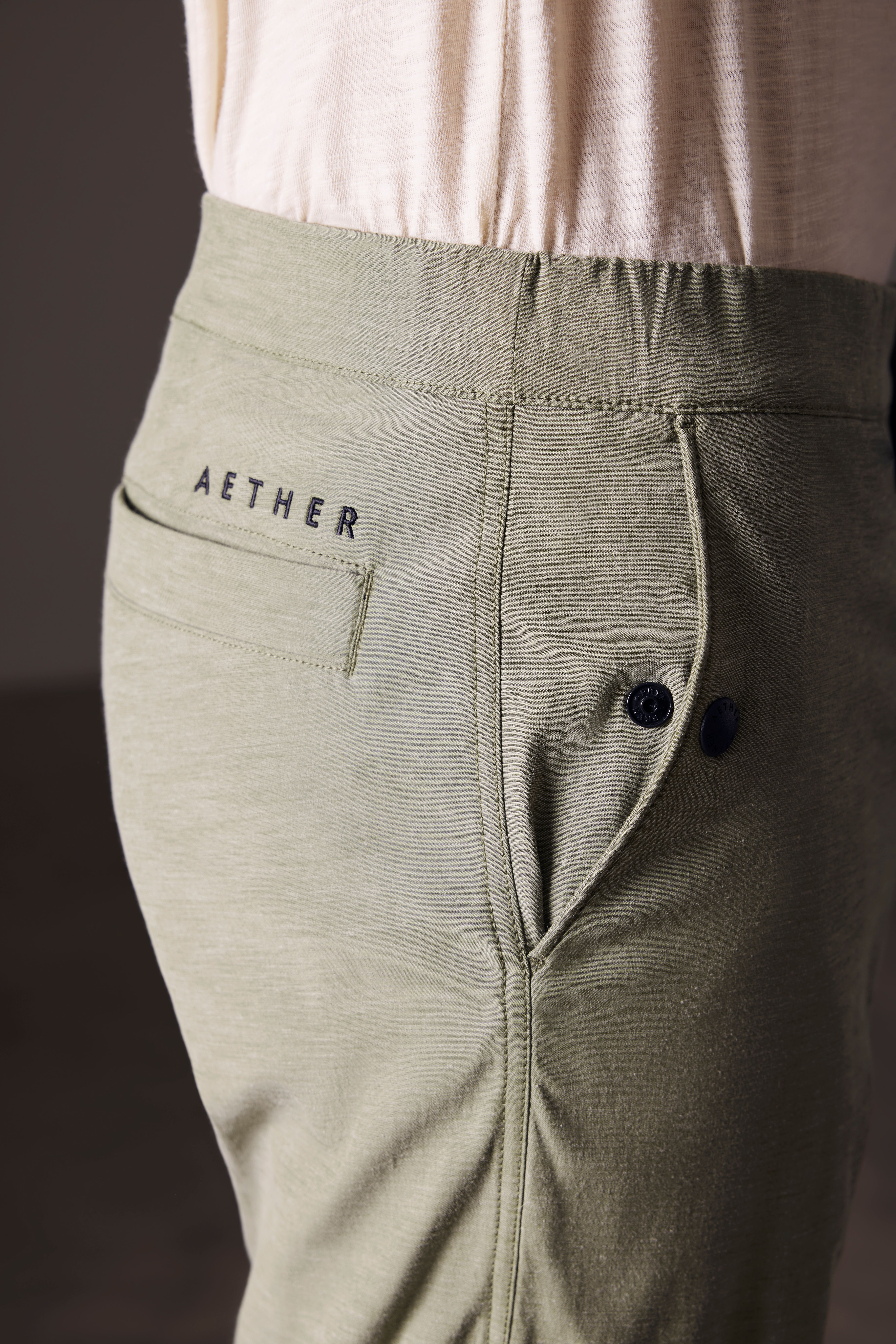 The front and back pocket bags are made of mesh, and the elastic waistband is complete with an internal drawcord to ensure a comfortable fit. The pants include subtle logo snap closures on the hand pockets for extra content security. There is also a logo snap closure above the zipper fly, and the zipper features a subtle AETHER icon. Above the back right welt pocket is a subtle AETHER wordmark embroidery.