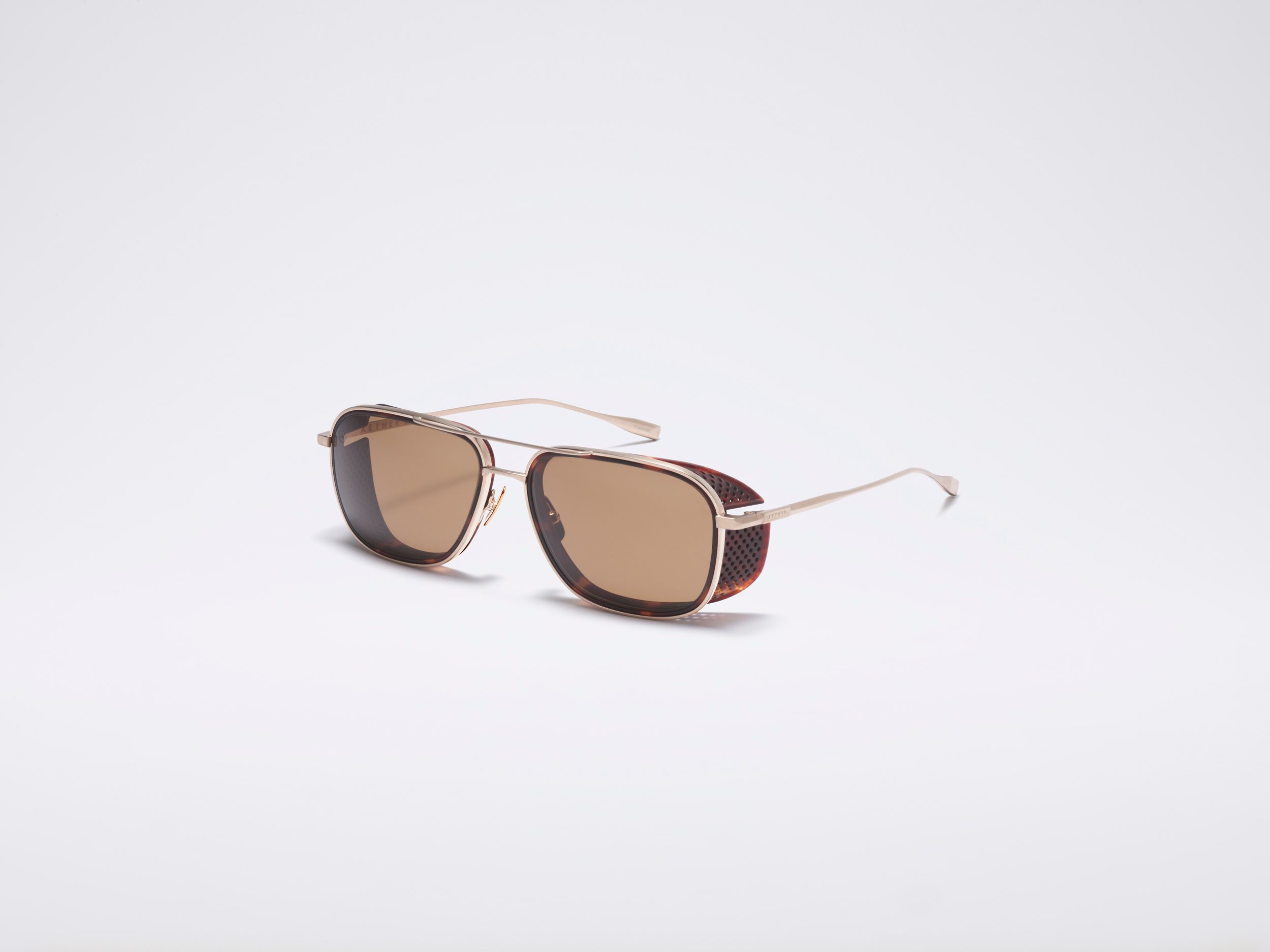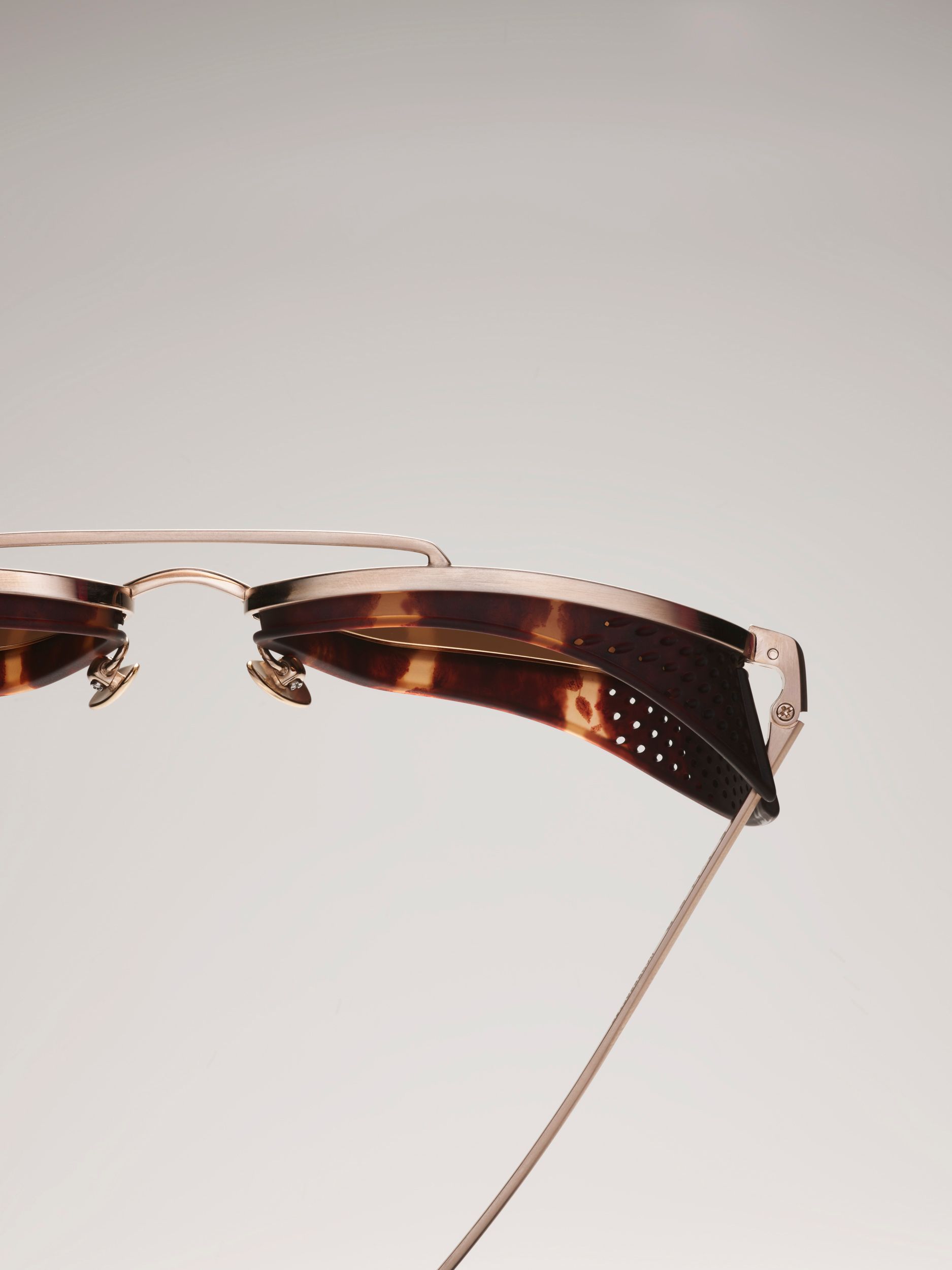 Closeup top-down detail image of Summit Sunglass in Brushed Gold titanium with G15 Lens from AETHER Apparel.