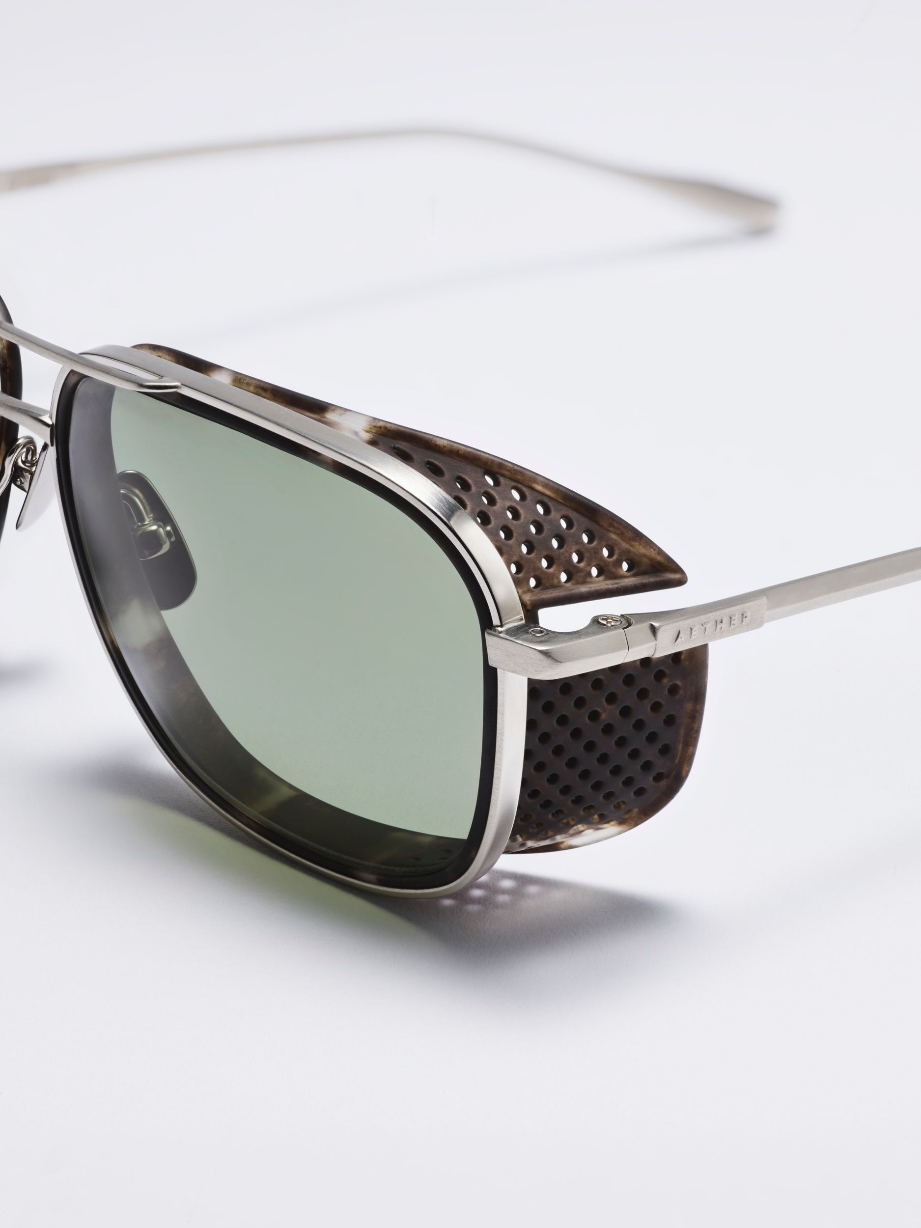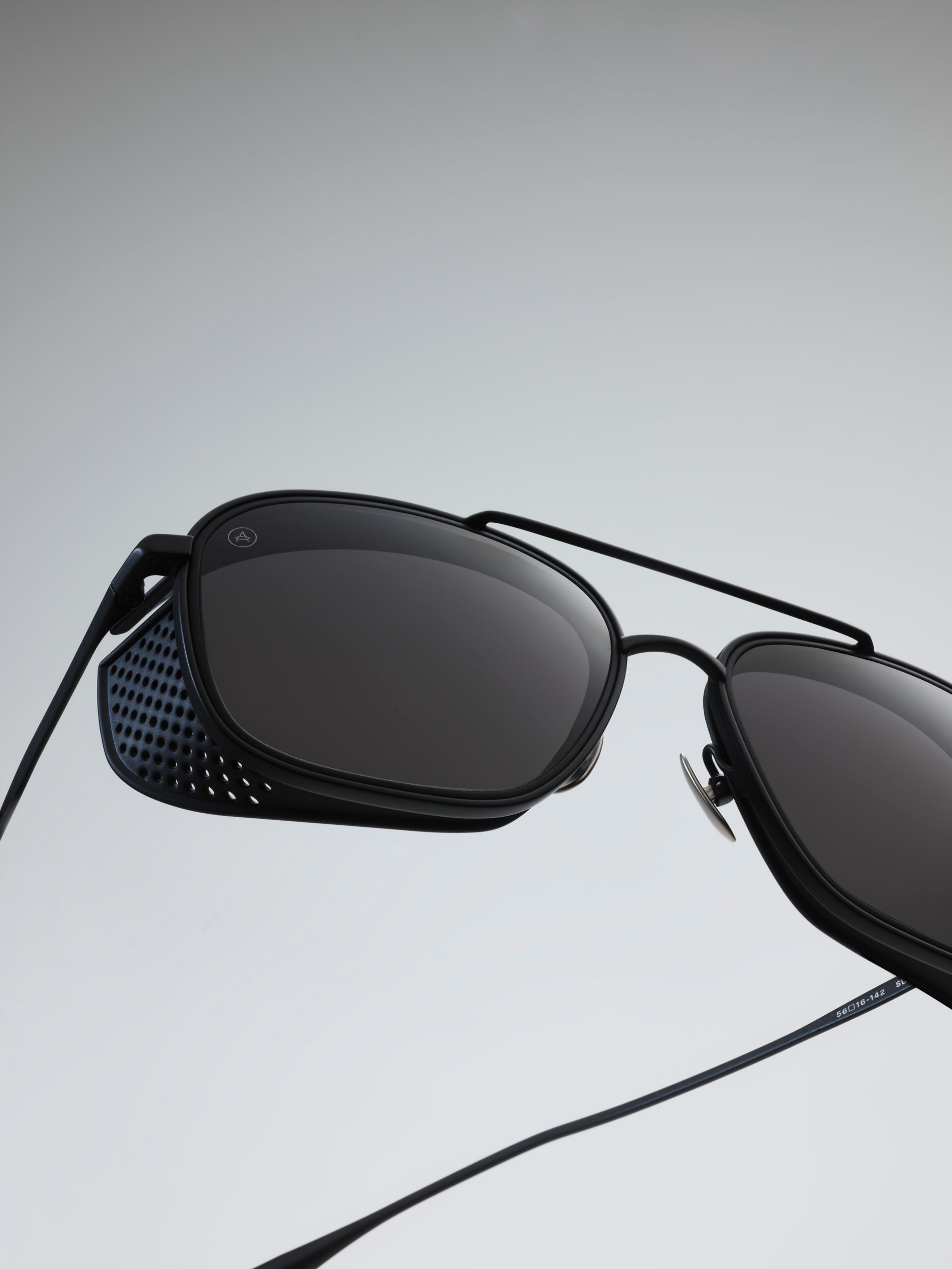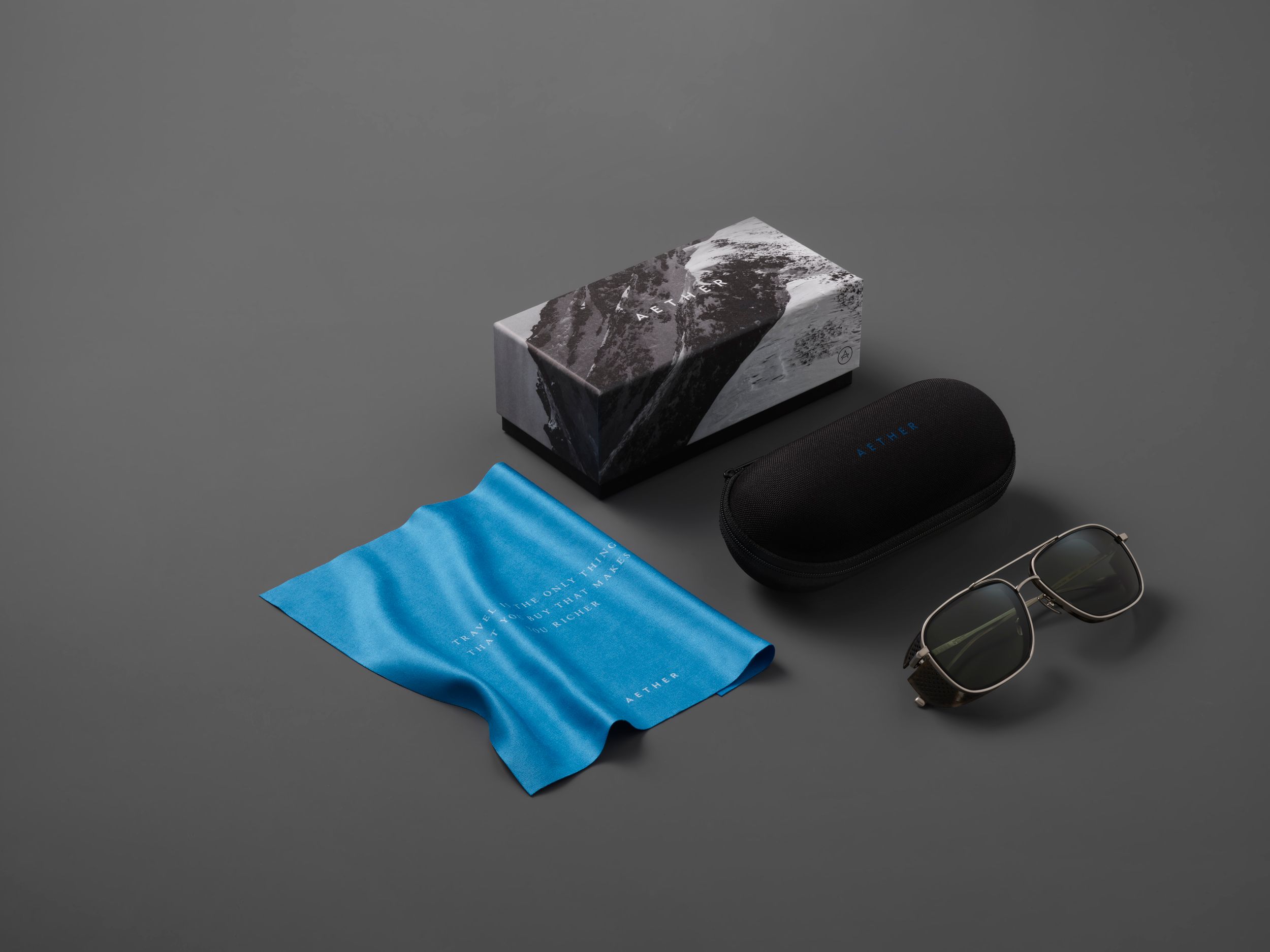 These adventure shades boast a 140mm temple length, a reinforced titanium bridge, and matching auto-adjusting titanium nose pads. Each pair is packaged in a custom nylon case and includes a custom designed microfiber cleaning cloth. AETHER logo is subtly lasered on the wearer’s right lens, a laser-engraved wordmark on the inside of the wearer’s right frame arm, and a tiny AETHER icon adorning the right outside temple tip.