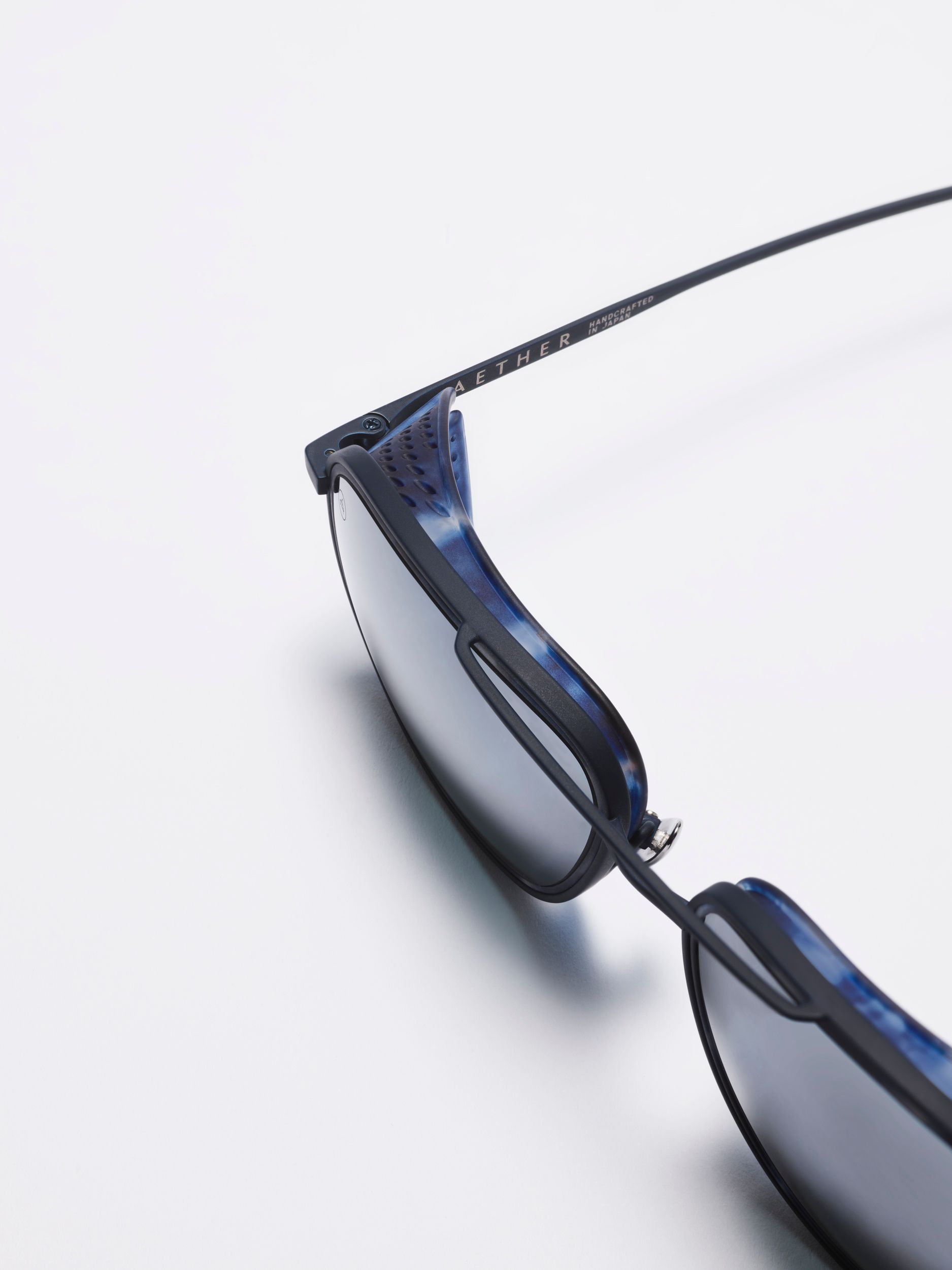 Closeup detail image of perforated side shields on Summit Sunglass in Blue titanium with Blue Lens from AETHER Apparel.
